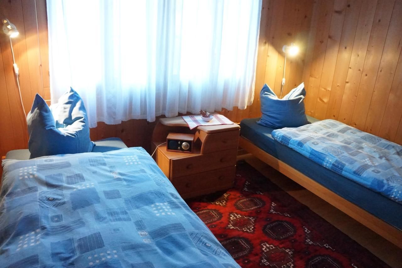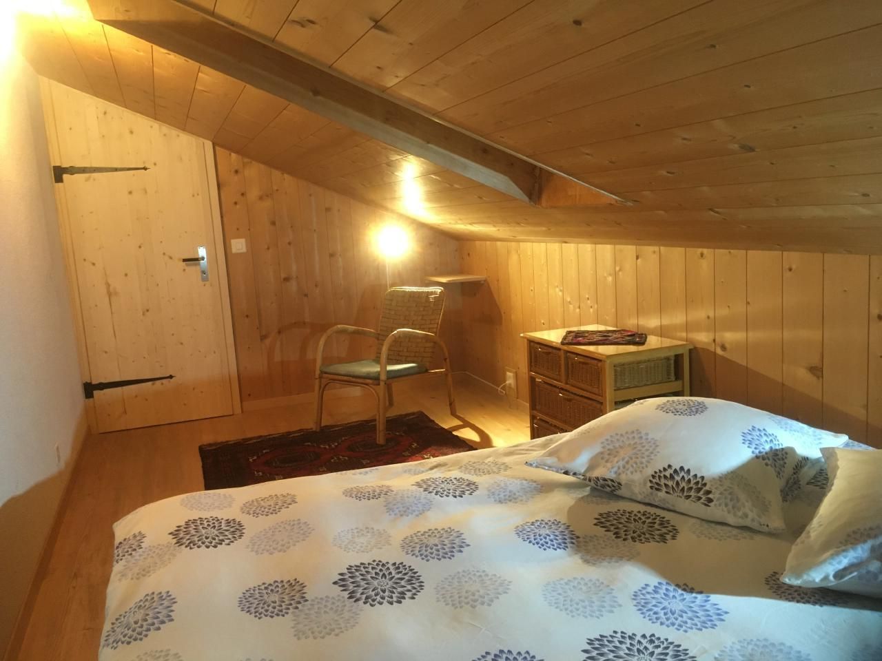 Im Inneren erwartet Sie eine geräumige Wohn-Essküche im Hochparterre, einladend ausgestattet mit unbehandeltem Holztäfer, das für eine besonders warme und gemütliche Atmosphäre sorgt. Ein Schlafzimmer mit zwei Einzelbetten ergänzt die untere Etage, während sich im Obergeschoss ein weiteres Schlafzimmer mit einem Doppelbett und ein zusätzliches Einzelbett auf der Galerie befinden. Für Behaglichkeit sorgen eine Holzheizung mit Trittofen im Wohnzimmer sowie ein Schwedenofen im Eingangsbereich.