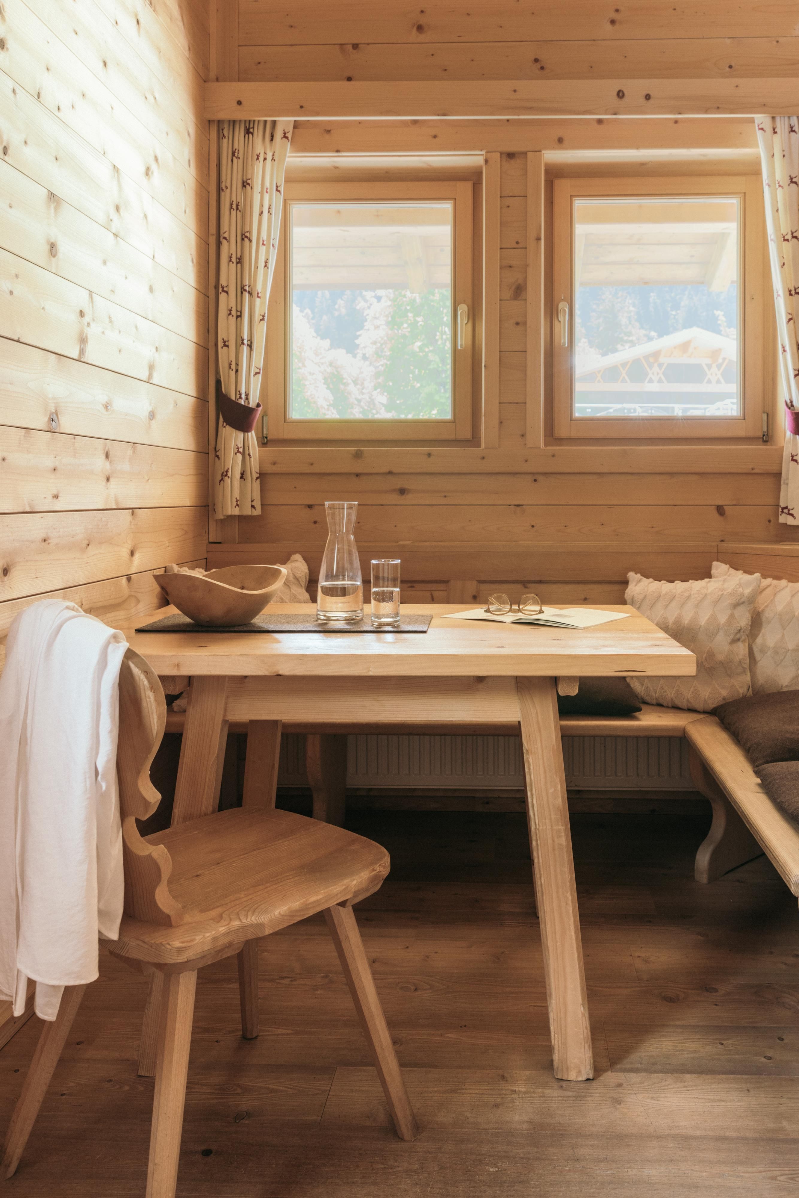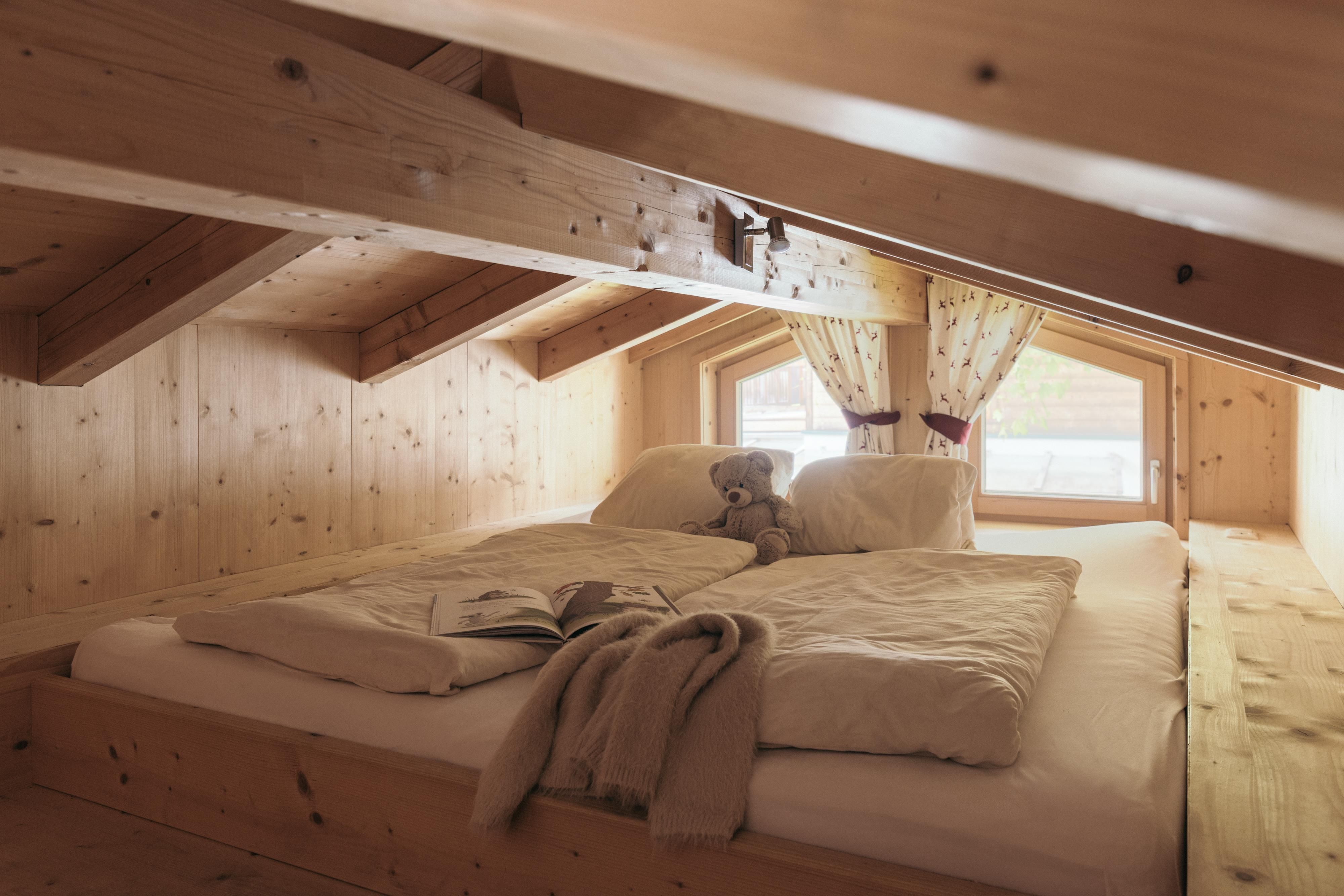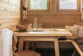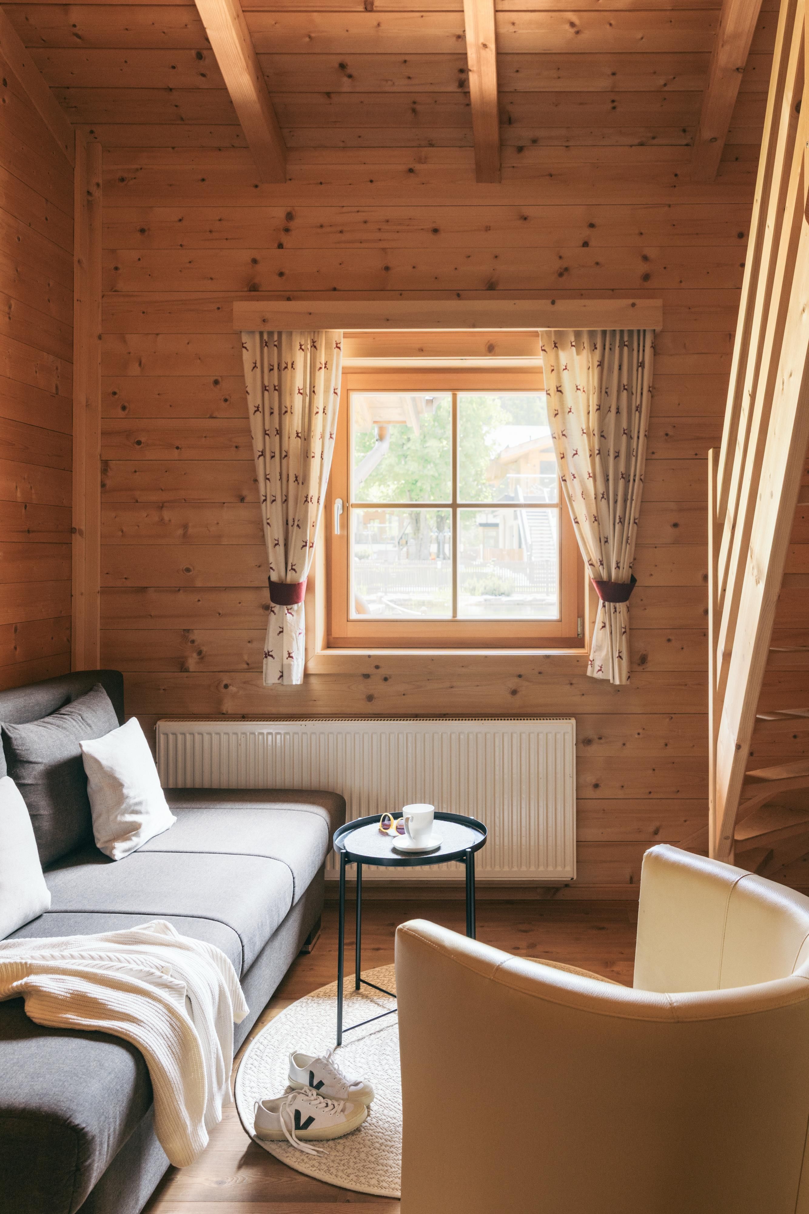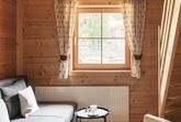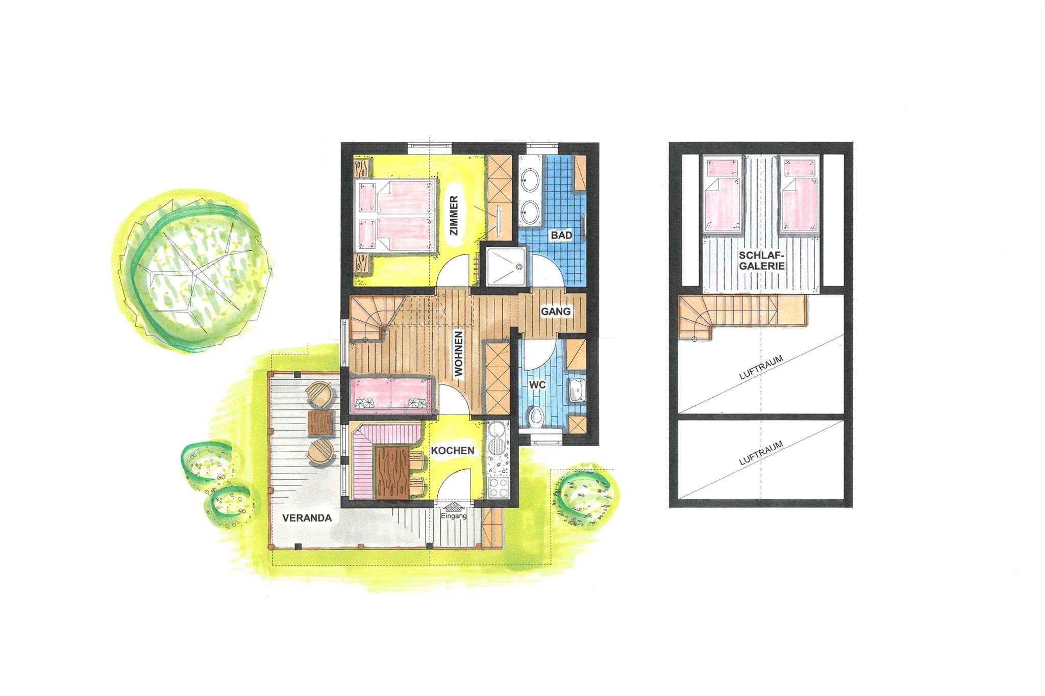 Ein eigenes kleines Haus mit idyllischer Veranda. Die komplett ausgestattete Küche und eine praktische Sitzecke befinden sich im vorderen Teil der Hütte. Über den Wohnraum mit gemütlichem Sofa und Sat-Flat-TV gelangt man in das Hauptschlafzimmer mit Badezimmer und separatem WC. Eine Treppe führt in das zum Wohnraum hin offene Schlaflager (Höhe ca. 1,40 m) für 2 weitere Personen unter dem Dach.