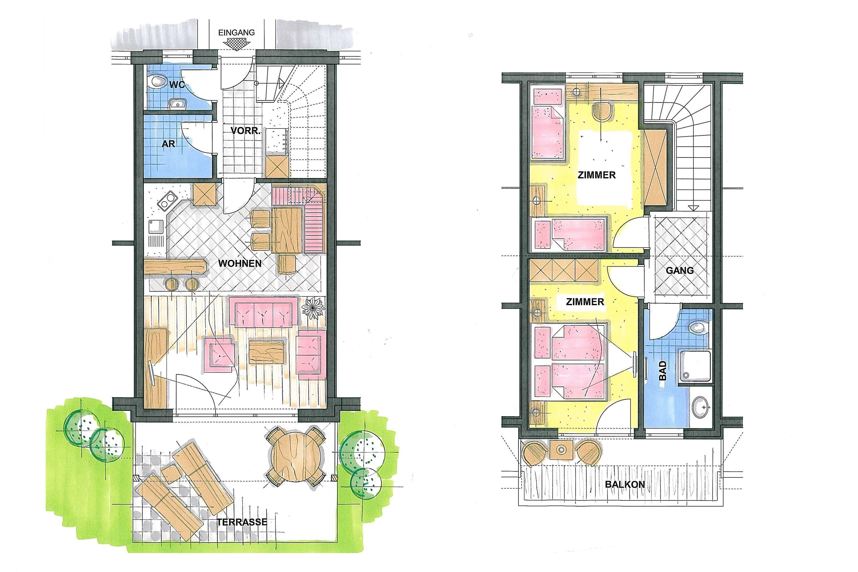 Ein Urlaubstraum auf 2 Etagen für 4 bis 5 Personen. Unten ein heimelig, gemütlicher Wohnraum mit Tiroler Kachelofen, Sitzecke und Küchenecke sowie 1 Schlafzimmer mit Dusche/WC, Internet-Anschluss, Sat-TV, Radio. Über eine Holztreppe gelangt man in die Wohngalerie sowie zum 2. Schlafzimmer. Das Apartment ist komplett ausgestattet: Bettwäsche, Handtücher, Koch- und Speisegeschirr.