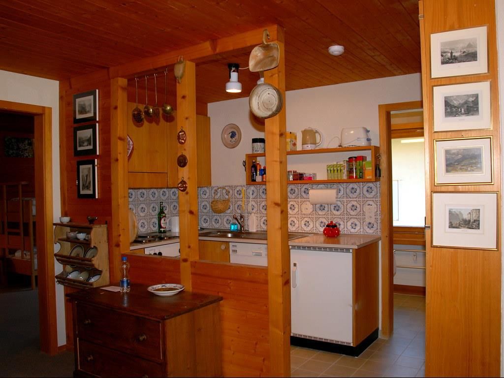 Gemütliche und gepflegte 3-Zimmerwohnung in Ferienhaus 2. Stock , sehr ruhige Lage im Unterdorf. Die Wohnung hat einen Eingangsbereich mit Garderobe, eine offene Küche zum Wohnbereich, 2 Schlafzimmer mit Einzelbetten und einem Kajütenbett, ein modernes Bad mit Dusche/WC. Vom grossen geräumigen Balkon aus erblicken Sie die Nordwände der Alpen in voller Pracht. Die Wohnung ist vollständig eingerichtet, der Gast findet genügend Kochutensilien, Geschirr und Besteck, eine kleine Bibliothek im Schlafzimmer, und Spiele für Kinder.