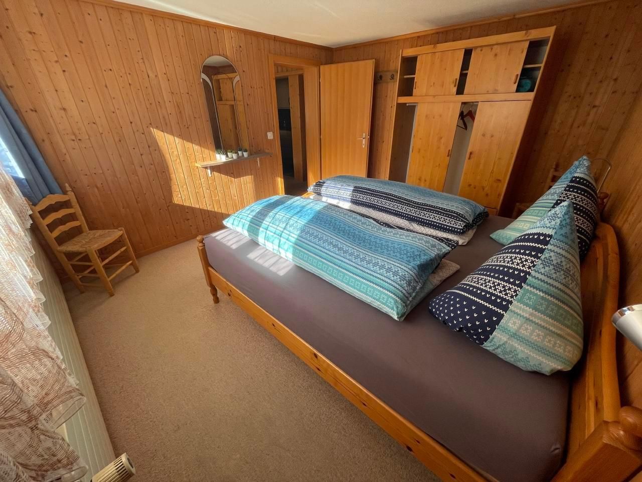 Sonstige Schlafzimmereinrichtung (Schlafzimmer1): Das Schlafzimmer verfügt über einen Schrank, Nachttisch-Ablagen, Leselampen, einem grossen Spiegel sowie zwei Stühlen und einer kleinen Garderobe. Kinderbett stellen wir auf Anfrage gerne zur Verfügung.