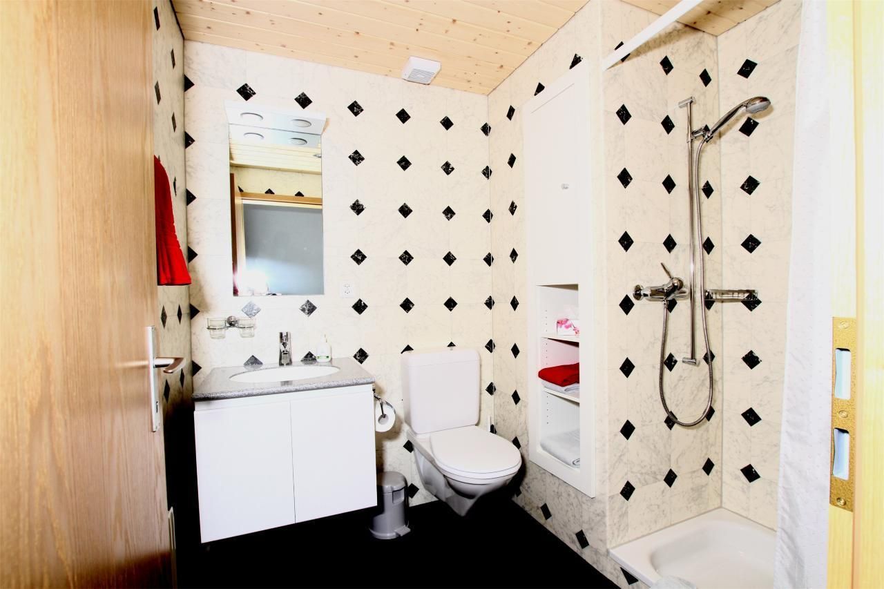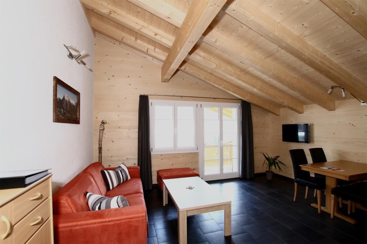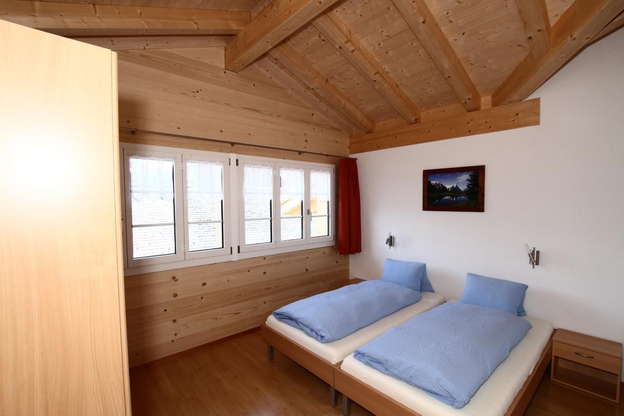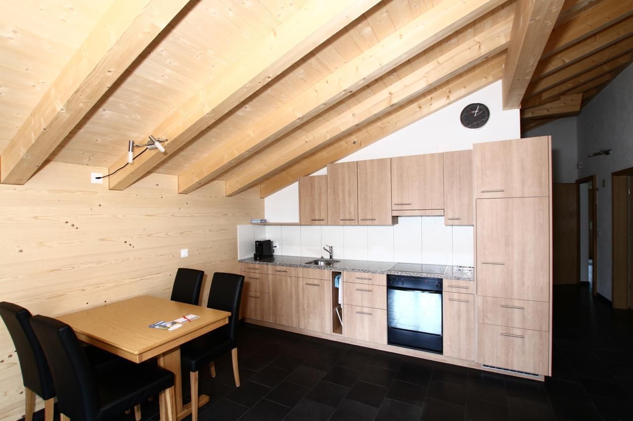 Im Inneren erwartet Sie eine 51 m2 große Wohnung, die mit Liebe zum Detail eingerichtet ist. Ein Schlafzimmer mit zwei bequemen Betten von 90 x 200 cm sorgt für Ihren erholsamen Schlaf. Der Wohnraum mit einer einladenden Polstergruppe und einem Esstisch lädt zum Verweilen ein. Die komplett integrierte Küche ist ausgestattet mit einem Geschirrspüler, einer Mikrowelle, einem Backofen, einem Kühlschrank mit Gefrierfach, einer Kaffeemaschine (für Filterkaffee und Kapseln), einem Fondue Set und einem Racletteofen. Zudem verfügt die Wohnung über ein Badezimmer mit Toilette und Dusche, einem Lavabo mit Spiegel und Unterschrank.