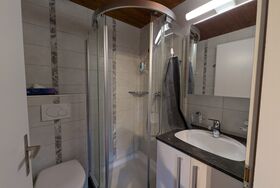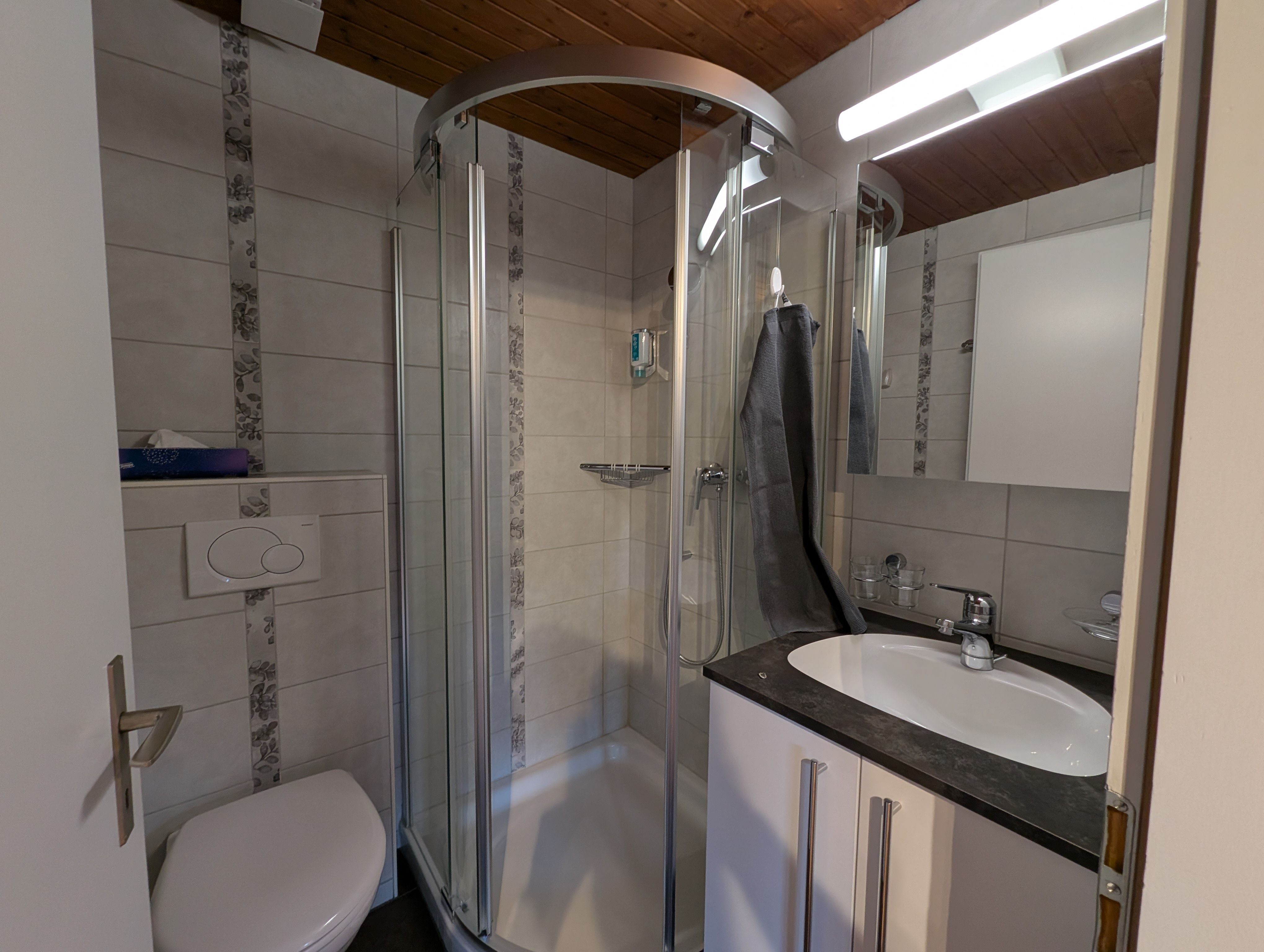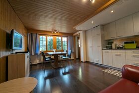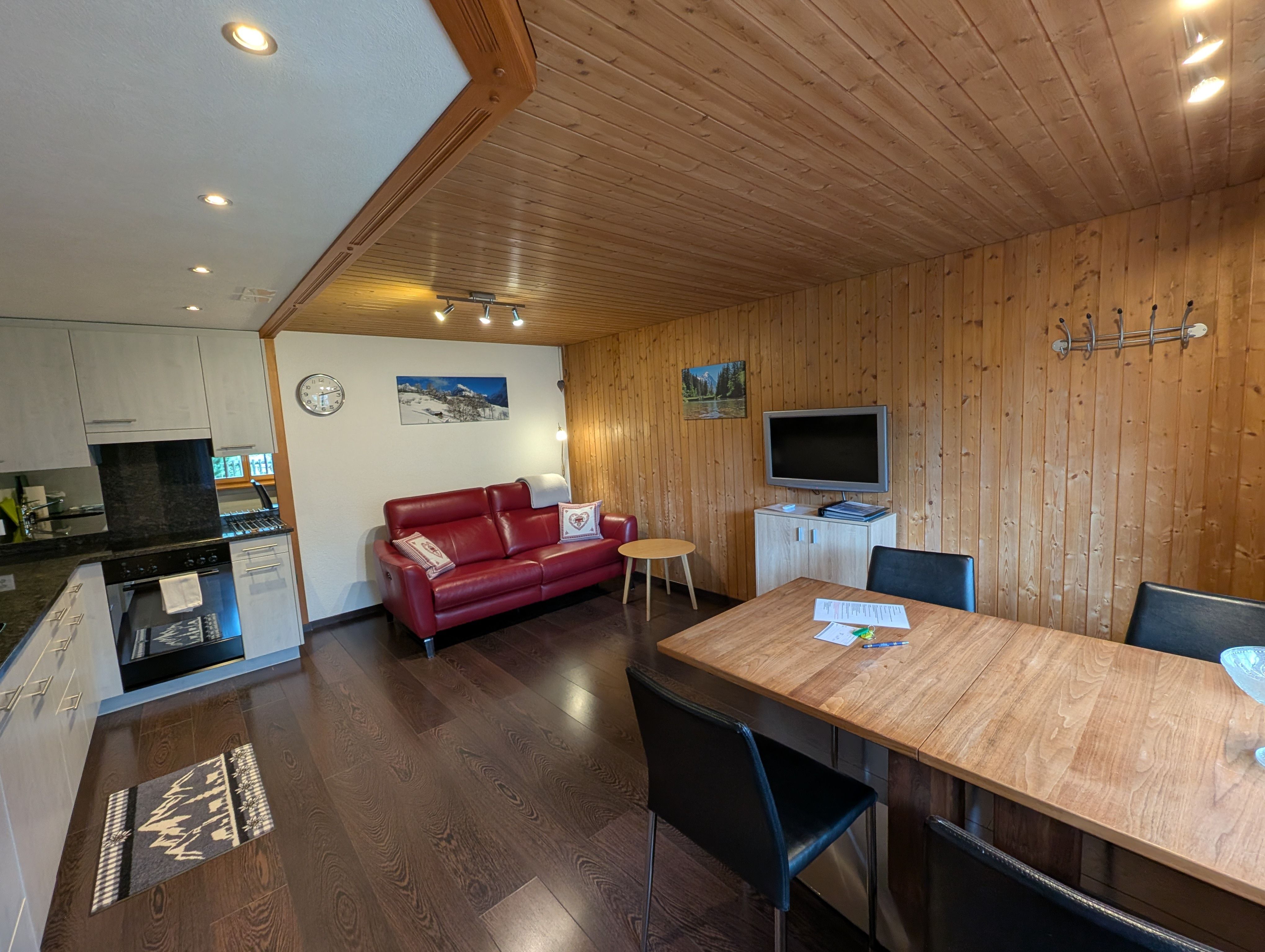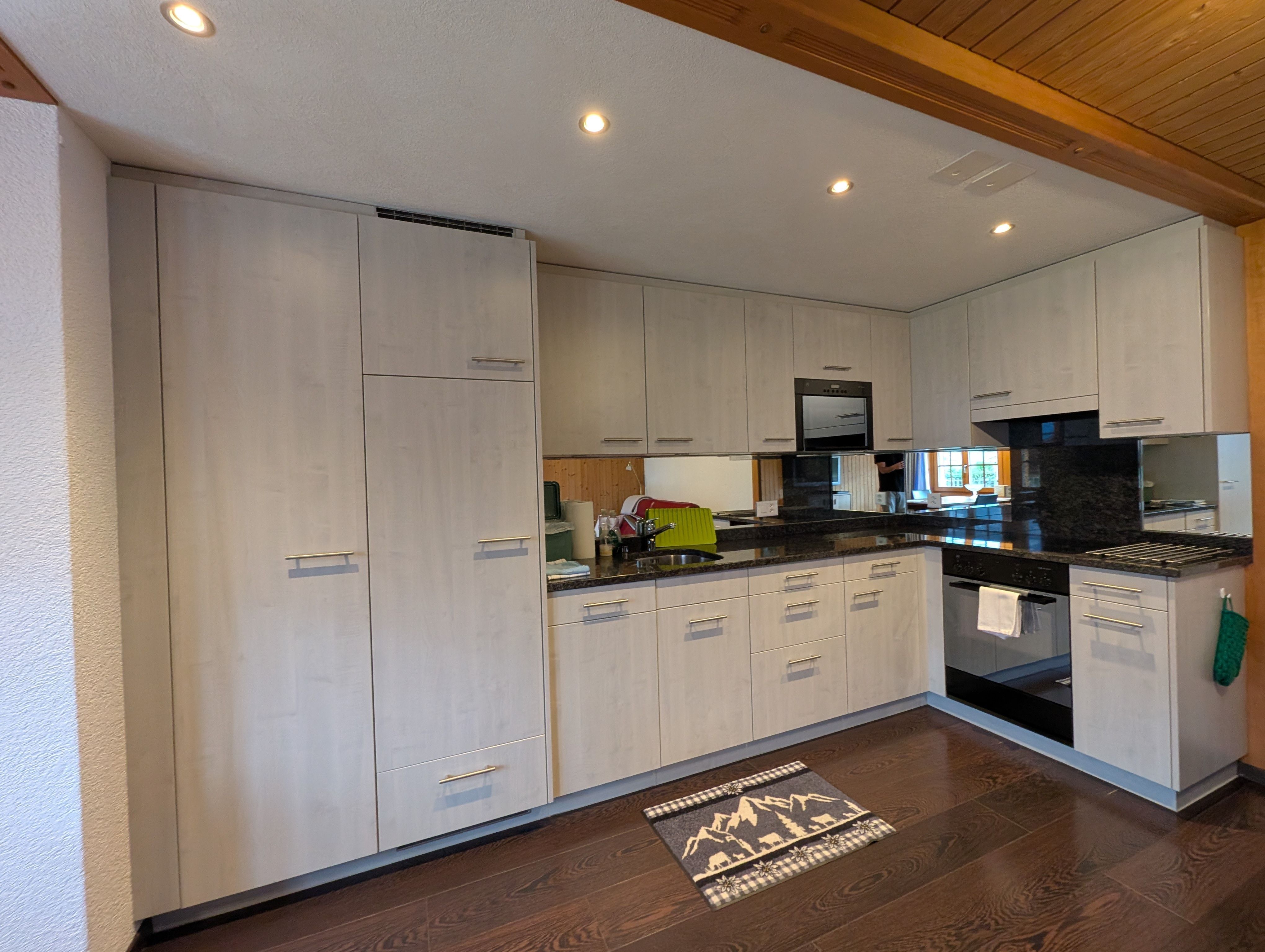 Innenraumlich erwartet Sie eine geschmackvoll eingerichtete Wohnung, die keine Wünsche offenlässt. Das Schlafzimmer verfügt über ein komfortables Doppelbett mit den Maßen 180 x 200 cm und einen großen Kleiderschrank für all Ihre Habseligkeiten. Der Wohnraum ist mit einem einladenden Ledersofa mit Relaxfunktion und einem Esstisch ausgestattet. Die angrenzende moderne Küche ist mit Geschirrspüler, Mikrowelle, Backofen, Wasserkocher, Filter- und Nespresso-Kaffeemaschinen, Fondue-Set und Racletteofen perfekt ausgestattet. Das Badezimmer bietet neben Toilette und Dusche auch ein Lavabo mit Spiegelschrank.