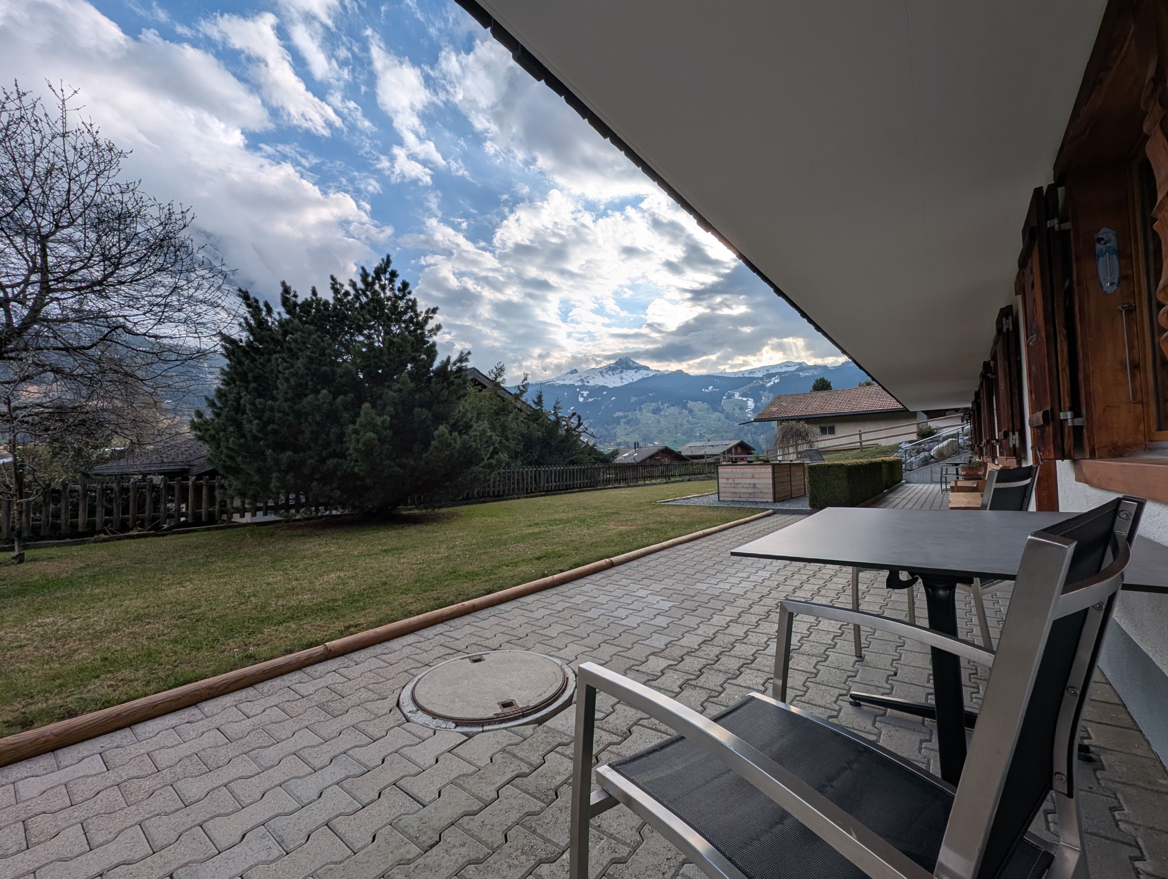 Der Außenbereich des Chalets lädt mit seiner gemütlichen Terrasse dazu ein, die spektakuläre Sicht auf den Eiger in aller Ruhe zu genießen. Direkt beim Haus steht Ihnen zudem ein Parkplatz zur Verfügung. Für Komfort sorgen weiterhin Annehmlichkeiten wie eine Waschküche mit Waschmaschine und ein Skiraum zur Mitbenutzung.