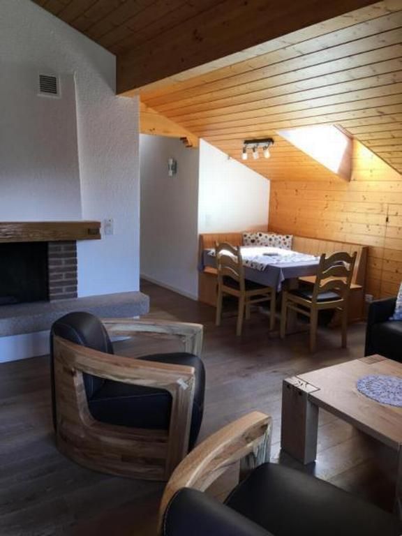 Innen lädt ein großzügiger Wohnraum mit einem bezaubernden Cheminée zu gemütlichen Abenden ein. Die Dachschräge verleiht dem Raum einen charmanten Charakter. Sie finden eine liebevoll eingerichtete Wohnung.