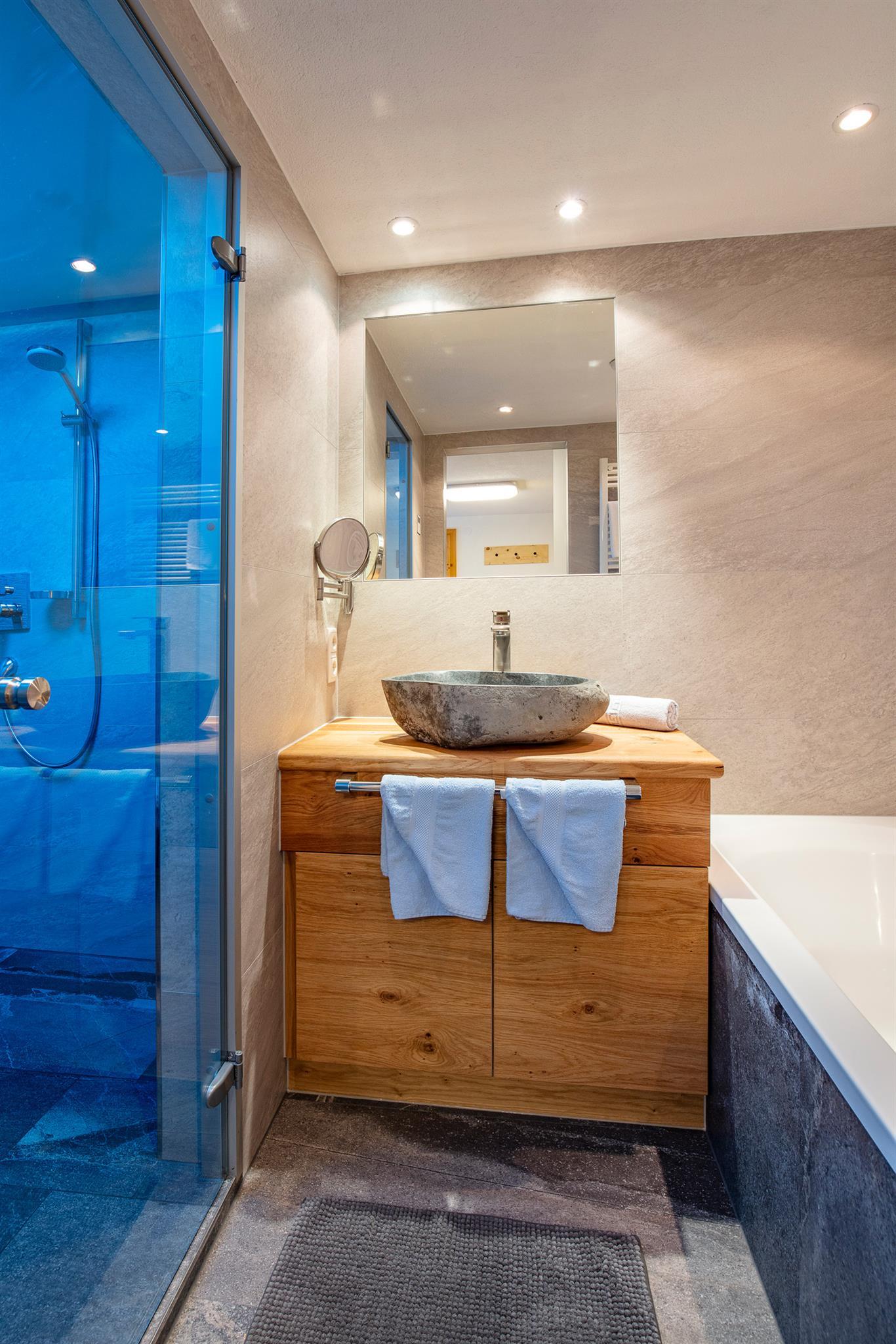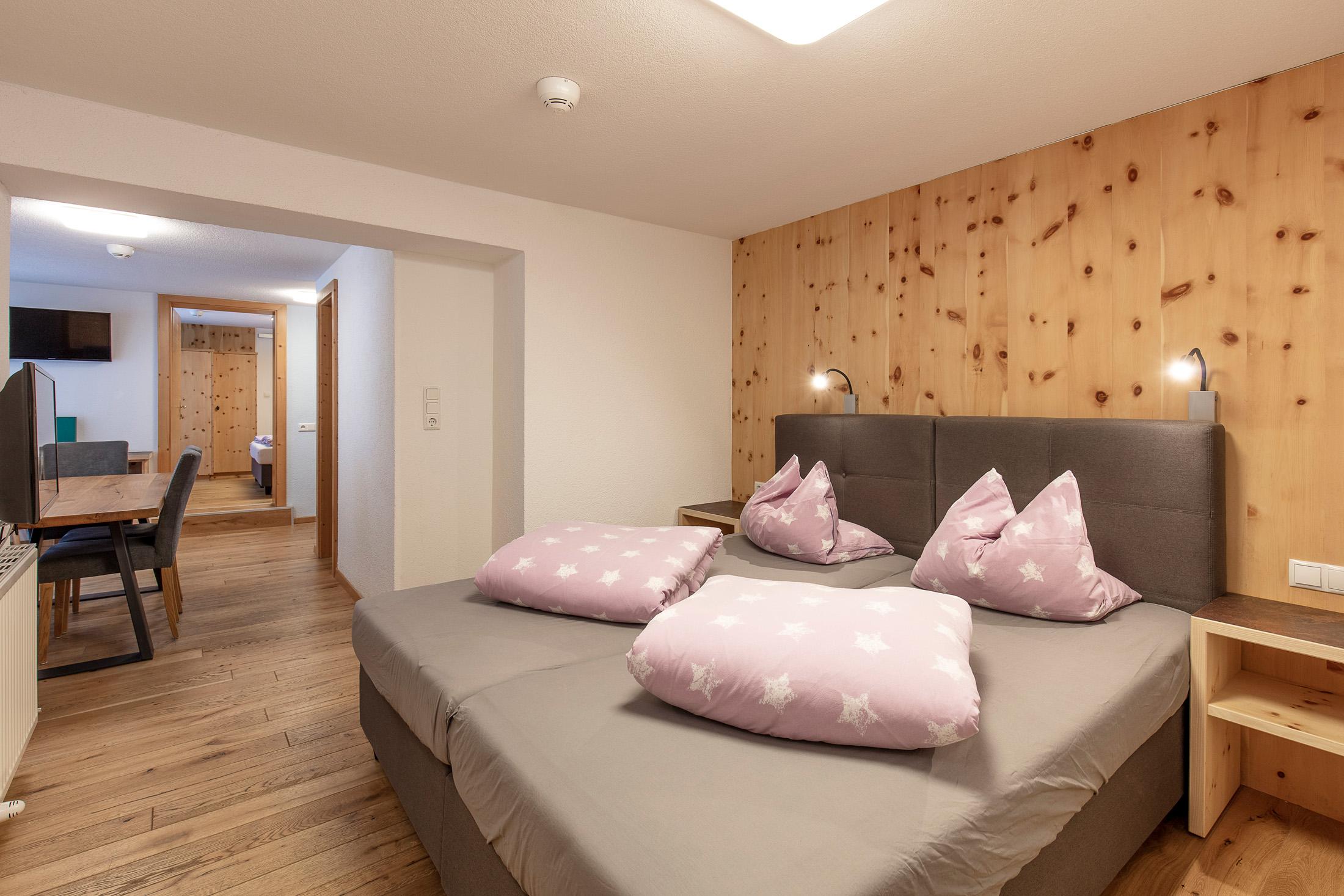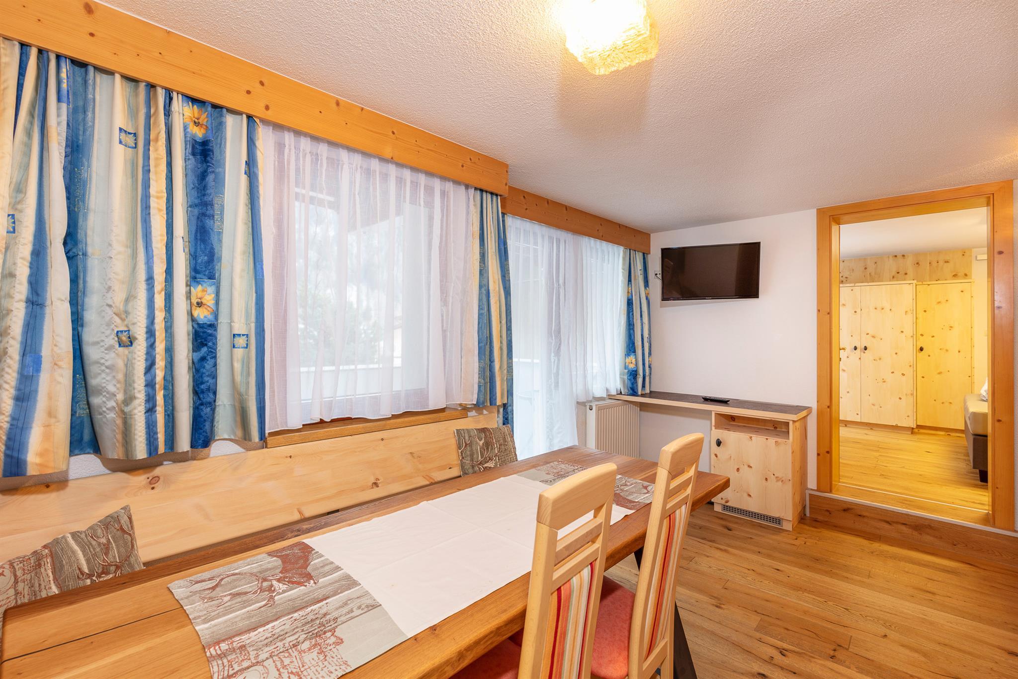 Gemütlich eingerichtetes Zirbenappartement: offener Wohn-Schlafraum mit einem Doppelbett und offenen Durchgang in den Wohnraum mit Essbereich. 1 Badezimmer mit Dusche/WC, voll ausgestattete Küche, 1 weiteres Dreibettzimmer mit Kabel TV, einem Badezimmer mit Badewanne und einem separatem WC und einer Dampfsauna, Größe: ca. 55 m², Balkon