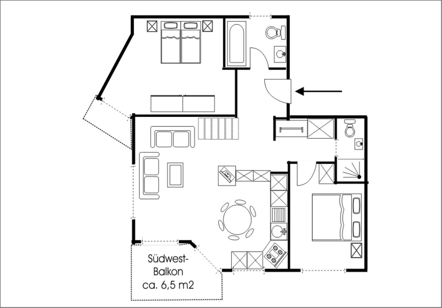 Die Ferienwohnung verfügt über eine helle Wohn- und Essstube mit Ausgang zum Balkon. Moderne Küche mit Geschirrspülmaschine. Zwei Doppelschlafzimmer, eins mit 2 Einzelbetten, eins mit französischem Doppelbett und zwei Nasszellen. ( 1 x Bad / WC / Lavabo + 1 x Dusche / WC / Lavabo ). Mit dem Lift gelangen Sie bequem von der Tiefgarage in die Ferienwohnung.