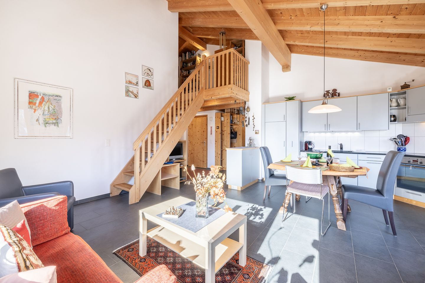 Hier erwartet Sie eine mit viel liebe eingerichtete Dachwohnung mit Galerie. Auf dem Südbalkon können Sie nicht nur die fantastische Aussicht genießen, sondern er lädt zu jeder Jahreszeit zum Verweilen ein.