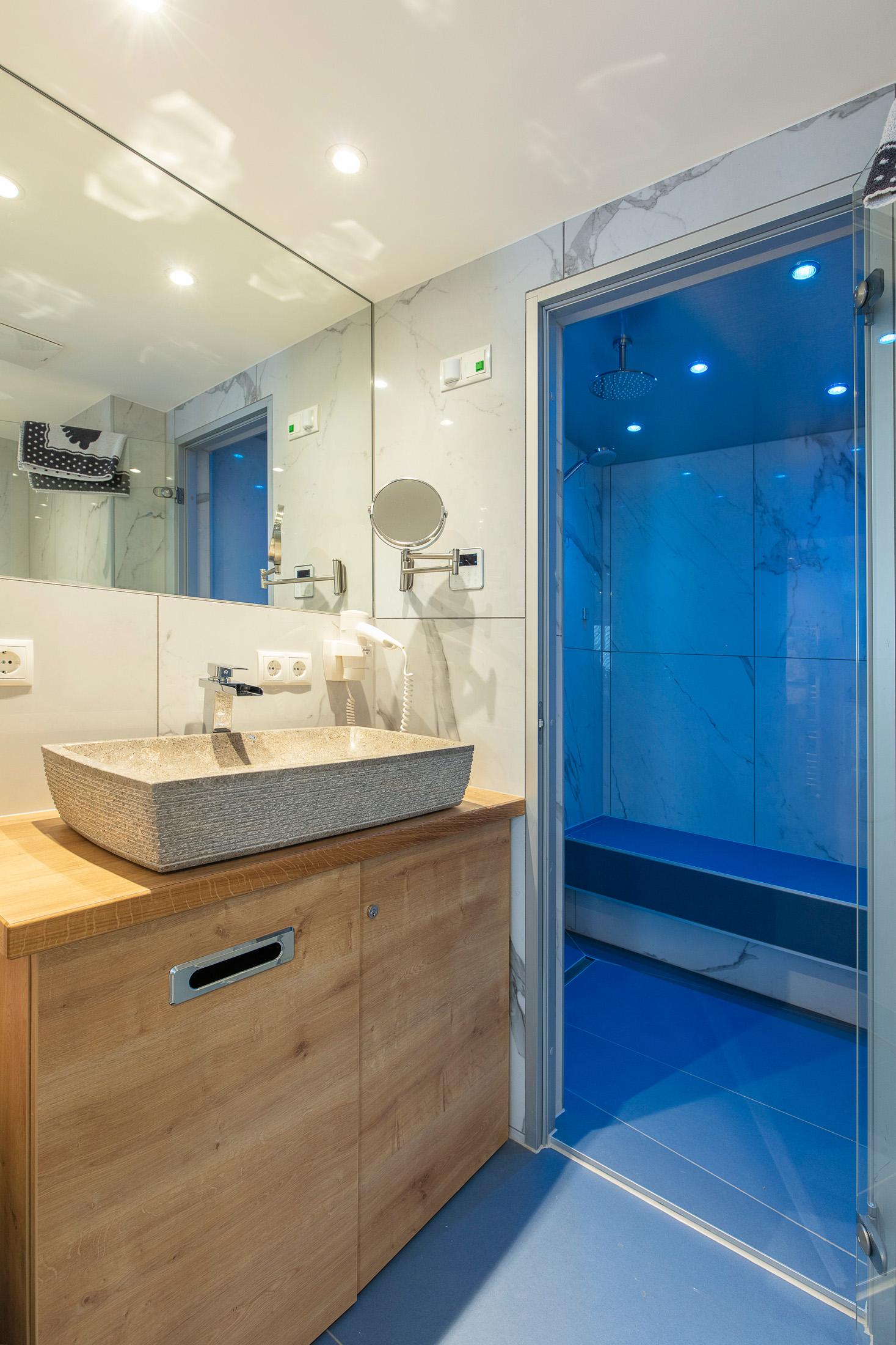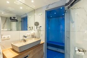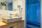 Appartement mit einem Doppelbett im Wohn/Essbereich. Ausgestattet mit: Kabel TV, Badezimmer mit Dusche mit integrierter Dampfsauna/WC, einen Küchenblock (Backofen, Herd, Geschirrspüler, Kühlschrank mit Gefrierfach, Mikrowelle, Kaffeemaschine, Wasserkocher, Toaster), Balkon, Größe: ca. 28 m²