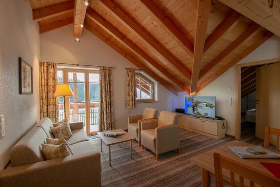 Die Jagd gehört in unseren Fluren seit jeher zur Pflege der Wälder. Die Wohnung im Dachgeschoss verfügt über einenHochstand, der als gemütliche Kuschelecke das besondere Ambiente unterstreicht. Im geräumigen Wohn-Esszimmer finden Sie Platz am gemütlichen Esstisch und zum Entspannen auf dem Sofa. Zusätzliche Schlafmöglichkeit auf Anfrage. Auf dem Westbalkon lässt sich die Nachmittags- und Abendsonne genießen.