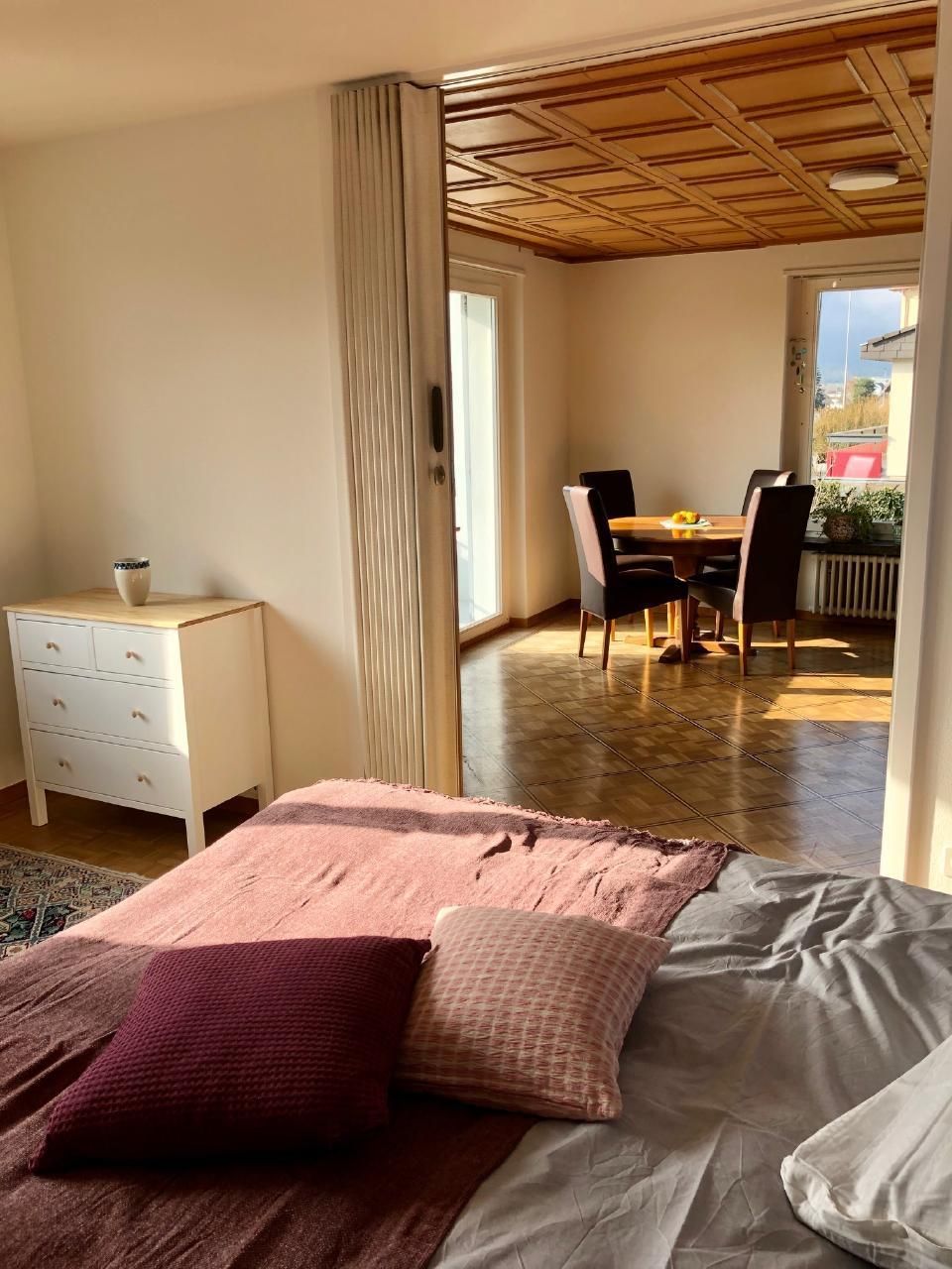 Sie möchten in Ihren Ferien einfach mal abschalten und die Natur mit allen ihren Möglichkeiten geniessen? Dann haben Sie hier inmitten der herrlichen Urner Bergwelt die perfekte Unterkunft. Haus und Aussenbereich Sie wohnen in einem Zweifamilienhaus am Dorfrand von Altdorf mit sehr grüner Umgebung. Die Ferienwohnung ist im Erdgeschoss. Auf dem gemütlichen Balkon können Sie die wunderbare Aussicht auf die Urner Berge geniessen. Das Haus verfügt über private Parkplätze. Vor dem Haus steht ein Rasenplatz zu Verfügung. Umgebung Der Dorfkern von Altdorf mit vielen kulturellen und touristische Möglichkeiten und Einkaufsgelegenheit befindet sich in einer Gehdistanz von 10 Minuten. Eine Bäckerei, wo man das Nötigste einkaufen kann, und ein Restaurant mit Gartensitzplatz sind gleich um die Ecke. Trotz der ländlichen Lage sind sie mit Bus oder Zug in 30 Minuten in Luzern und in 35 Minuten in Bellinzona. Die nächste Bushaltstelle ist 200m und der Bahnhof in 5 Gehminuten entfernt. In 5 Minuten sind Sie mit dem Auto am Urnersee mit Badestrand im Naturschutzgebiet, in 30 Minuten in Andermatt oder im Schächental zum Skifahren, Langlaufen oder Wandern. Die nahe Bergwelt mit den meisten Seilbahnen in der Schweiz und der Weg der Schweiz am Urner See laden zu Wanderungen, Bergsteigen, Velofahren und Biken ein. Innenbereich Die 3-Zimmerwohnung, mit Eingangsbereich, Küche und Bad/Dusche ist sehr gemütlich und gepflegt eingerichtet und neu renoviert. Der Wohnbereich umfasst ein Wohnzimmer und 2 Schlafzimmer. Die Wohnung bietet ideal Platz für 4 Personen. Zudem steht ein Kinderreisebett zur Verfügung. Die Ausstattung der Räumlichkeiten: Wohnzimmer: Parkettboden, grosses Sofa, ausziehbarer Esstisch bis zu 6 Personen, Fernseher mit Radio (Swisscom TV mit vielen Sendern und SportApps), 2 Schlafzimmer: Parkettboden, je ein Doppelbett, 2 Nachttischen mit Nachttischlampen, Babybett auf Wunsch verfügbar, geräumige Kommode und grosser Kleiderständer, Badezimmer: Badewanne mit Duschfenster, Lavabo mit Spiegel, WC, Glasablagen, Fön Küche: Granitboden, Einbauküche mit verschiedenen Schränken, Glaskeramik-Kochherd, Backofen, Abzugsvorrichtung, kleiner Abstelltisch, Geschirrspülmaschine, grosser Kühlschrank mit separatem Gefrierfach, Toaster, Wasserkocher, Geschirr und Besteck doppelt für 4 Personen, Eingangsbereich: Parkettboden, Holzkommode, Sitzgelegenheit, Spiegel, grosse Garderobe mit genügend Abstellflächen, Putzschrank inkl. Staubsauger etc.
