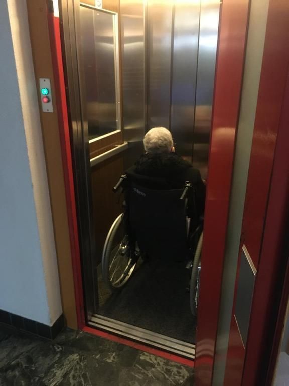 - Der Aufzug ist 70 cm breit und kann mit einem Rollstuhl befahren werden (siehe Foto).