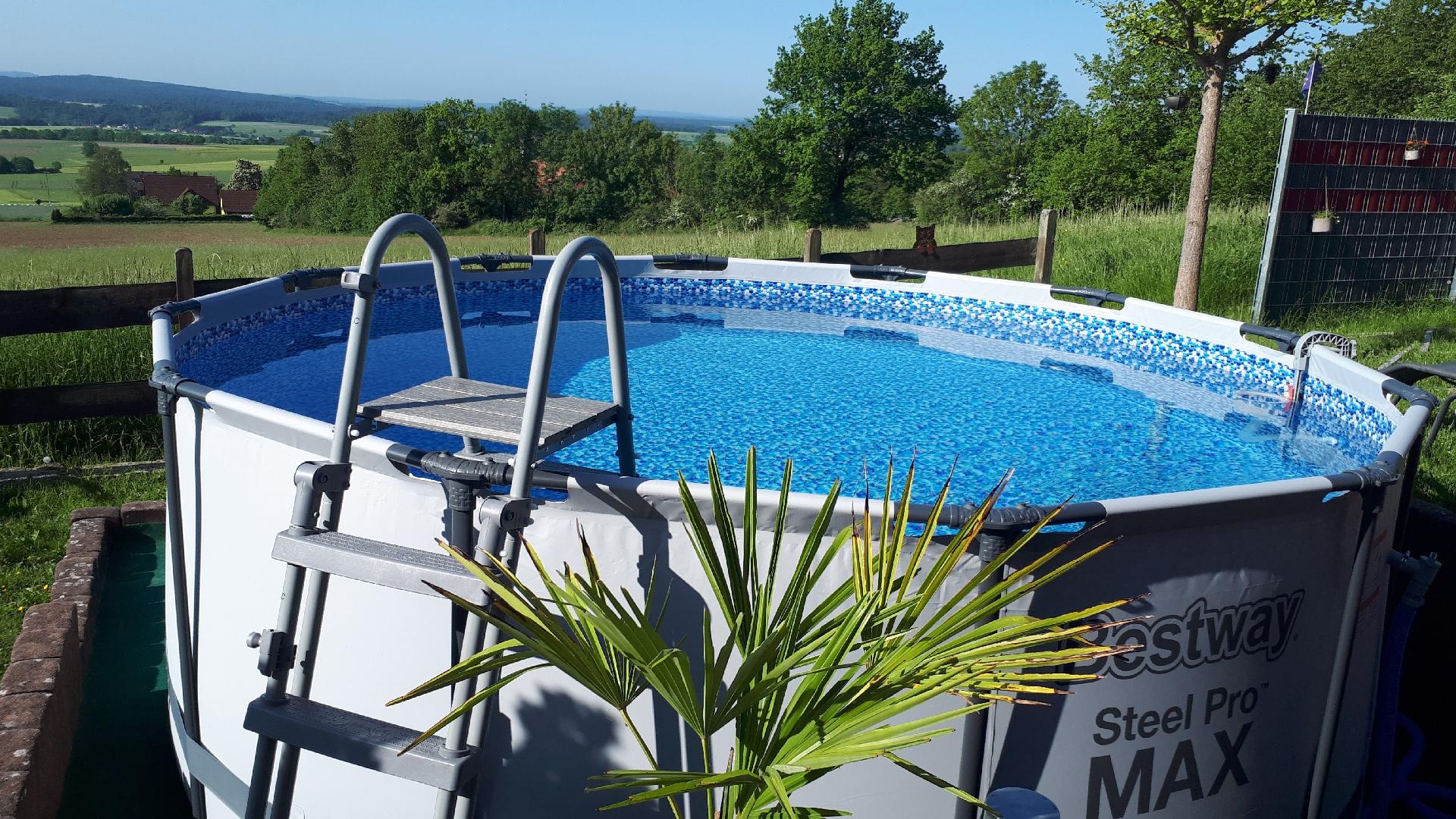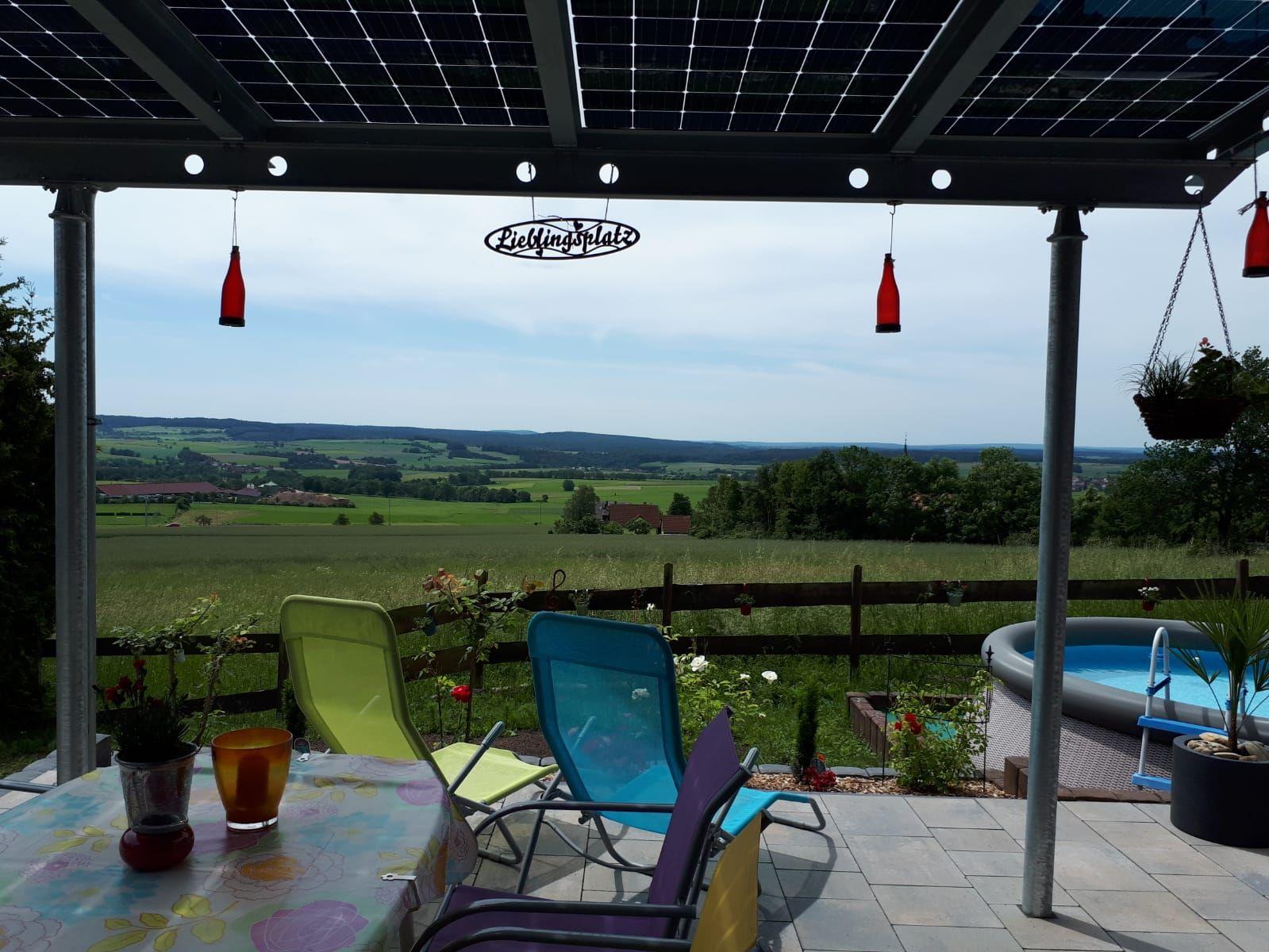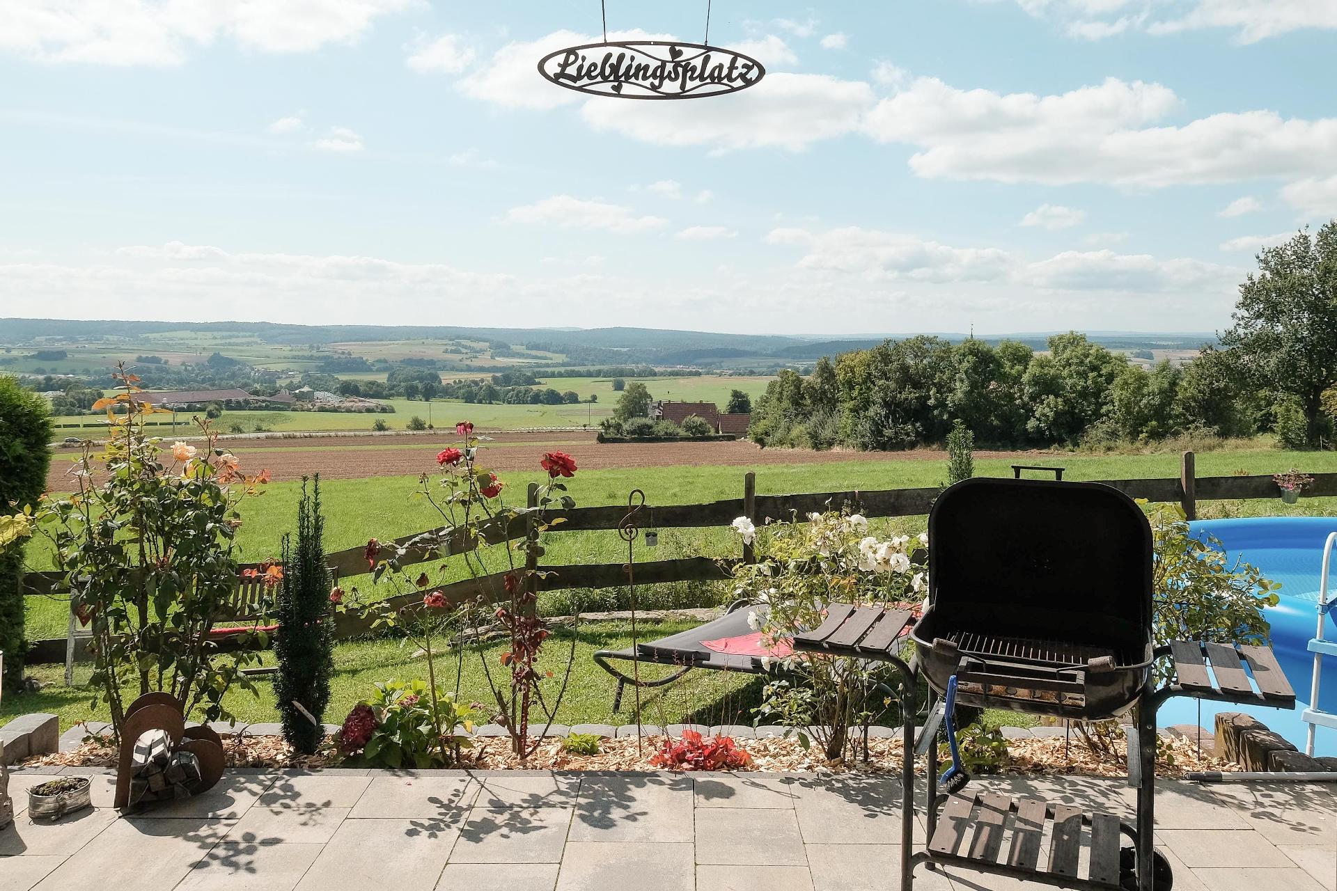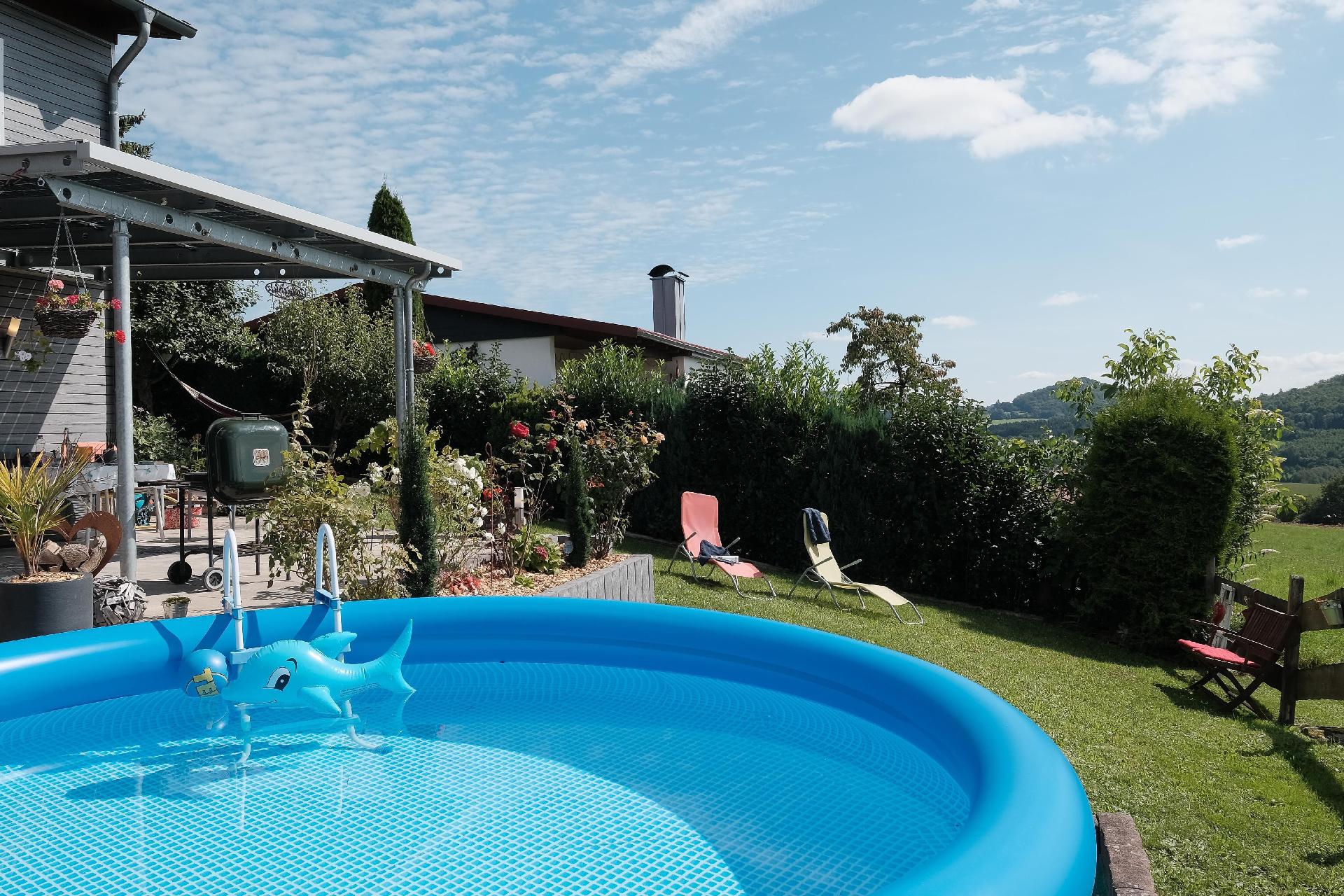 Das Wohnzimmer bietet direkten Zugang zur Terrasse und zum Garten. Die Terrasse verfügt über einen kleinen aufstellbaren Pool und traumhafte Aussicht, Gartenmöbel, Liegestühle und Grill. Ein PKW - Stellplatz ist natürlich auch vorhanden. Das Grundstück ist nur teilweise umzäunt.