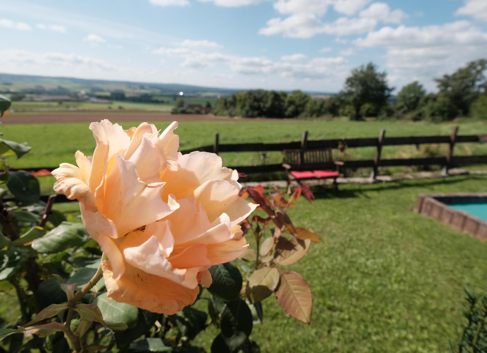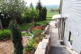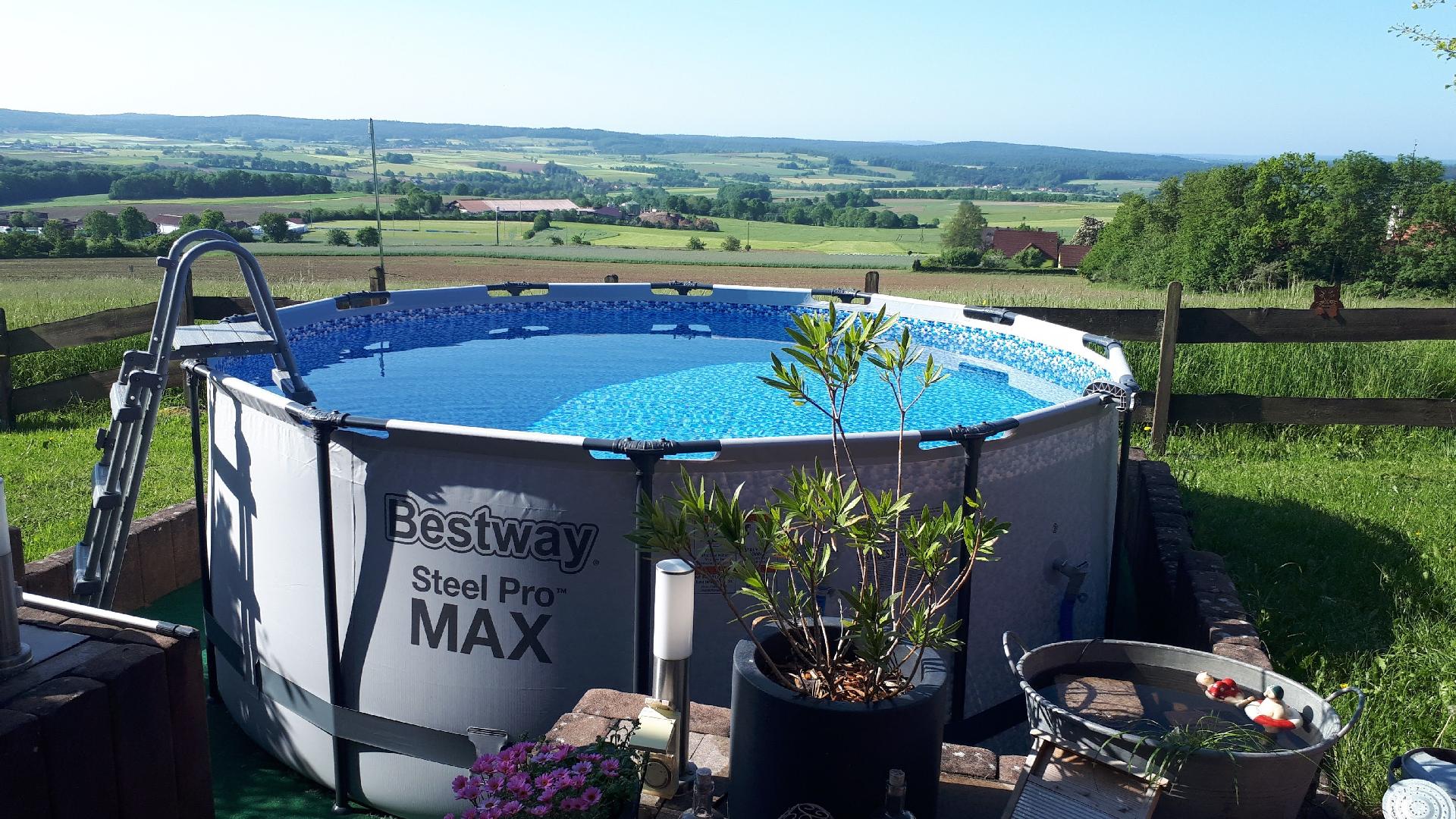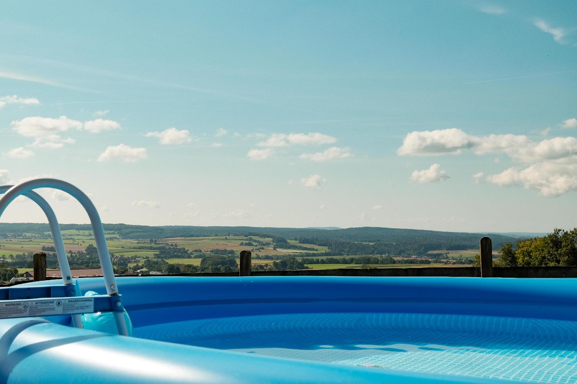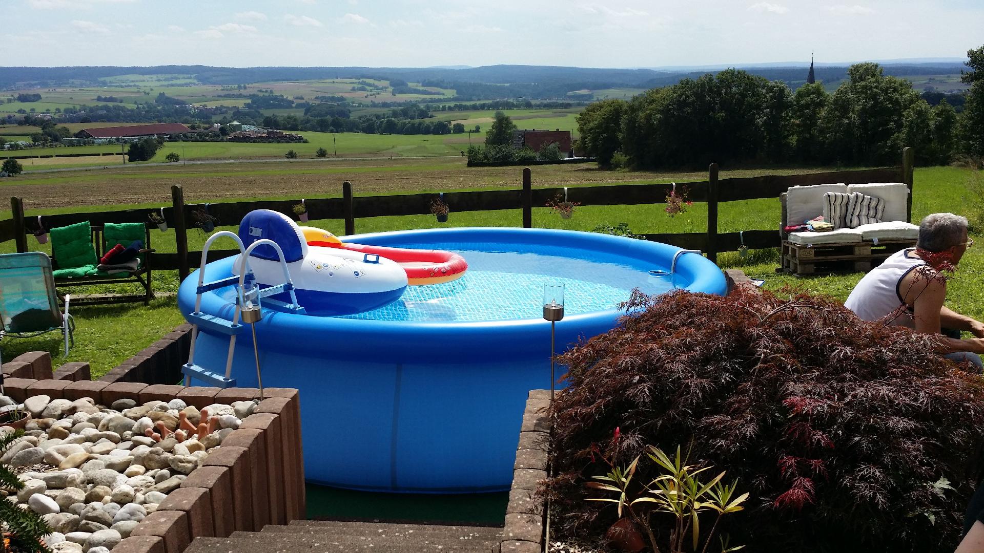 Das Wohnzimmer bietet direkten Zugang zur Terrasse und zum Garten. Die Terrasse verfügt über einen kleinen aufstellbaren Pool und traumhafte Aussicht, Gartenmöbel, Liegestühle und Grill. Ein PKW - Stellplatz ist natürlich auch vorhanden. Das Grundstück ist nur teilweise umzäunt.