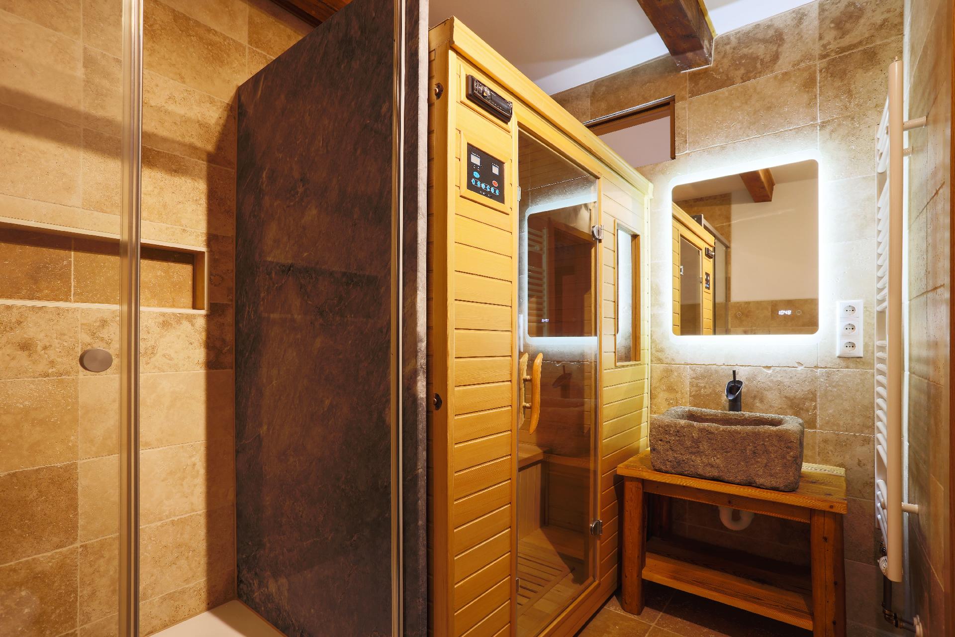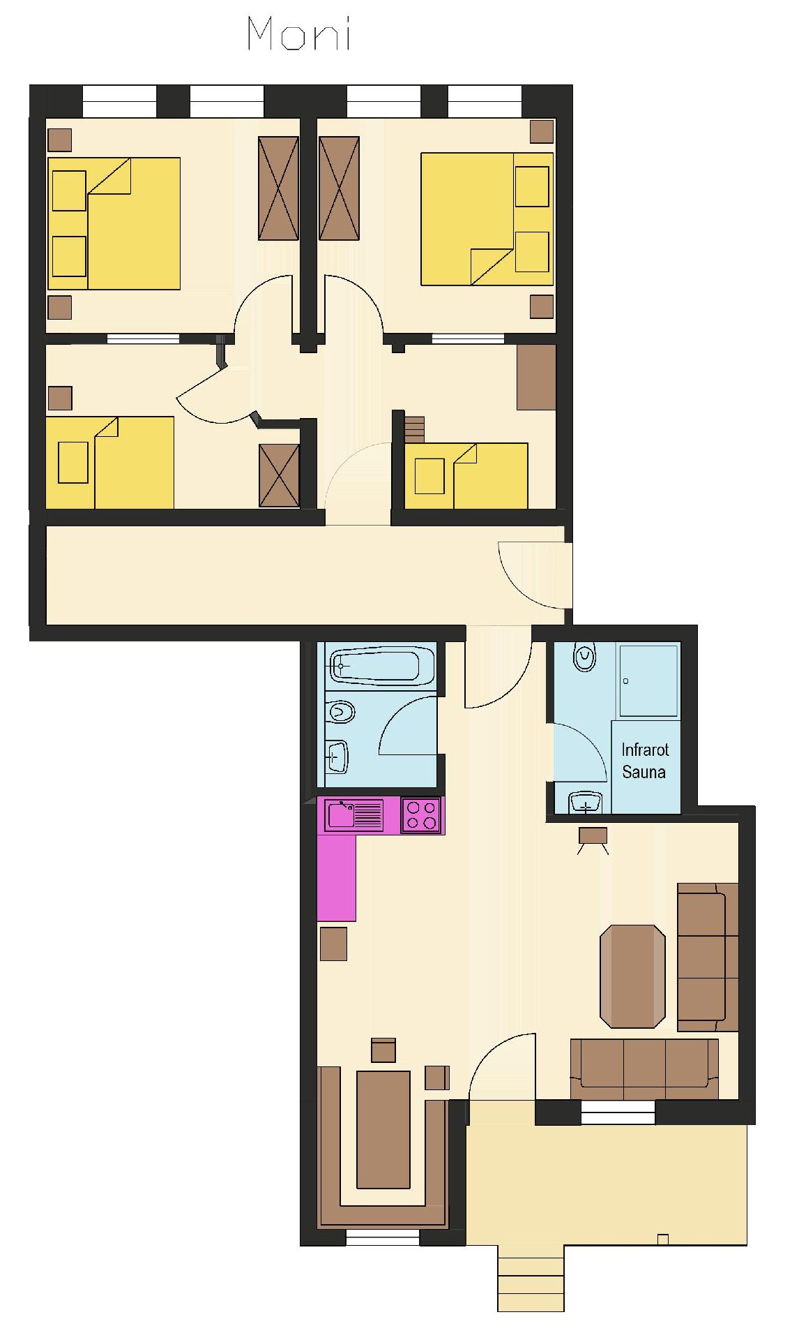 Im Inneren der Wohnung finden Sie eine vollständig ausgestattete Küche mit modernen Annehmlichkeiten wie Kaffeemaschine, Toaster, Wasserkocher sowie einem Backofen und einem Elektroherd mit 4 Kochplatten für die Zubereitung Ihrer Lieblingsmahlzeiten. Der große Wohnbereich, ausgestattet mit einem Farbfernseher und SAT-Anschluss, lädt zu gemütlichen Abenden ein. Zwei Badezimmer, eines mit Badewanne und das andere mit Dusche und Infrarotsauna, sowie vier Schlafzimmer - zwei mit Doppelbetten für Erwachsene und zwei weitere, eins mit Etagenbett und eins mit französischem Bett für Kinder - runden das Angebot ab.