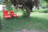 Vor dem Haus befindet sich eine kleine Bank zum Verweilen. Außerdem eine Sitzgelegenheit und ein Sonnenschirm.