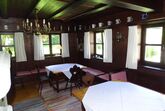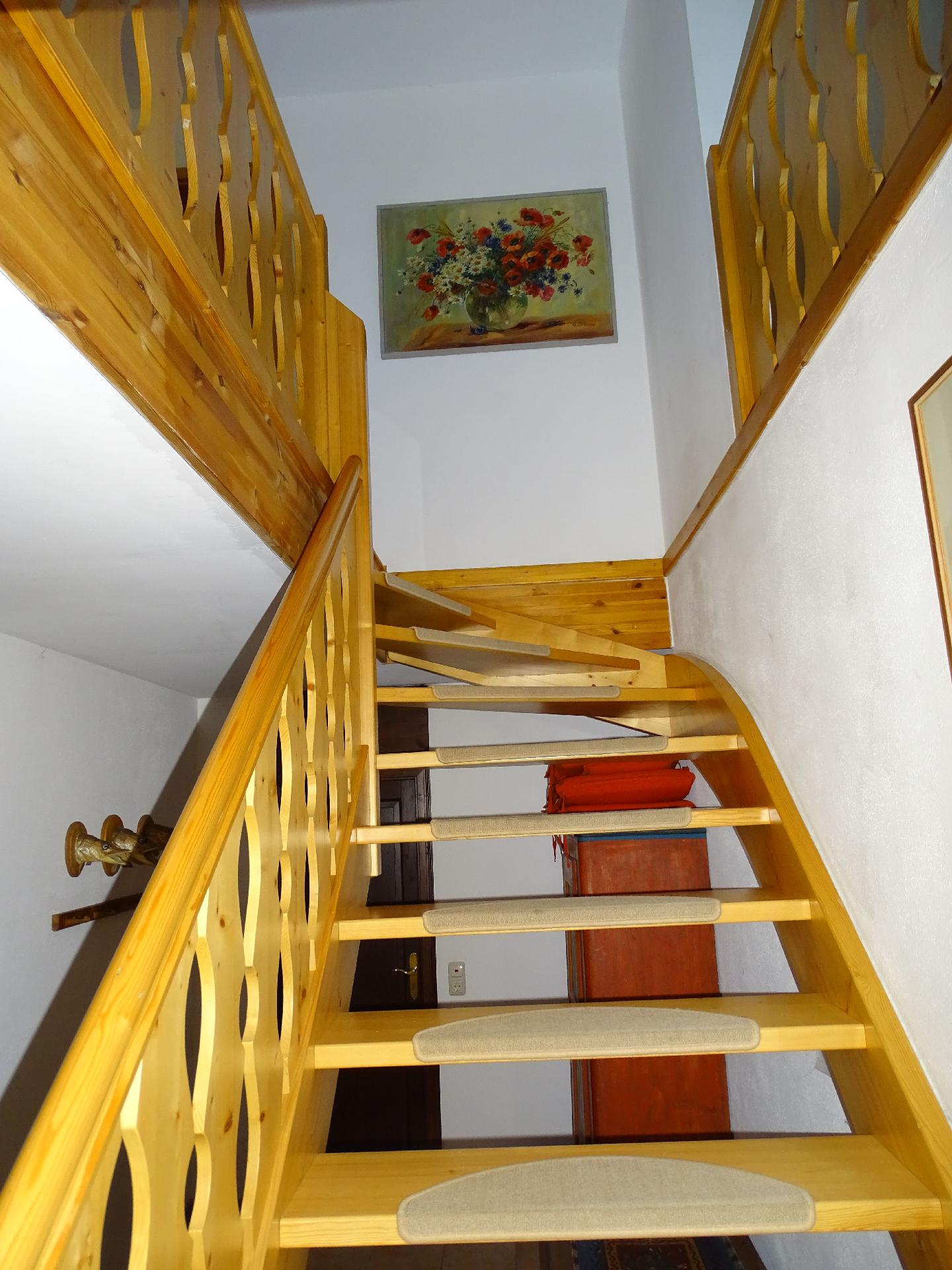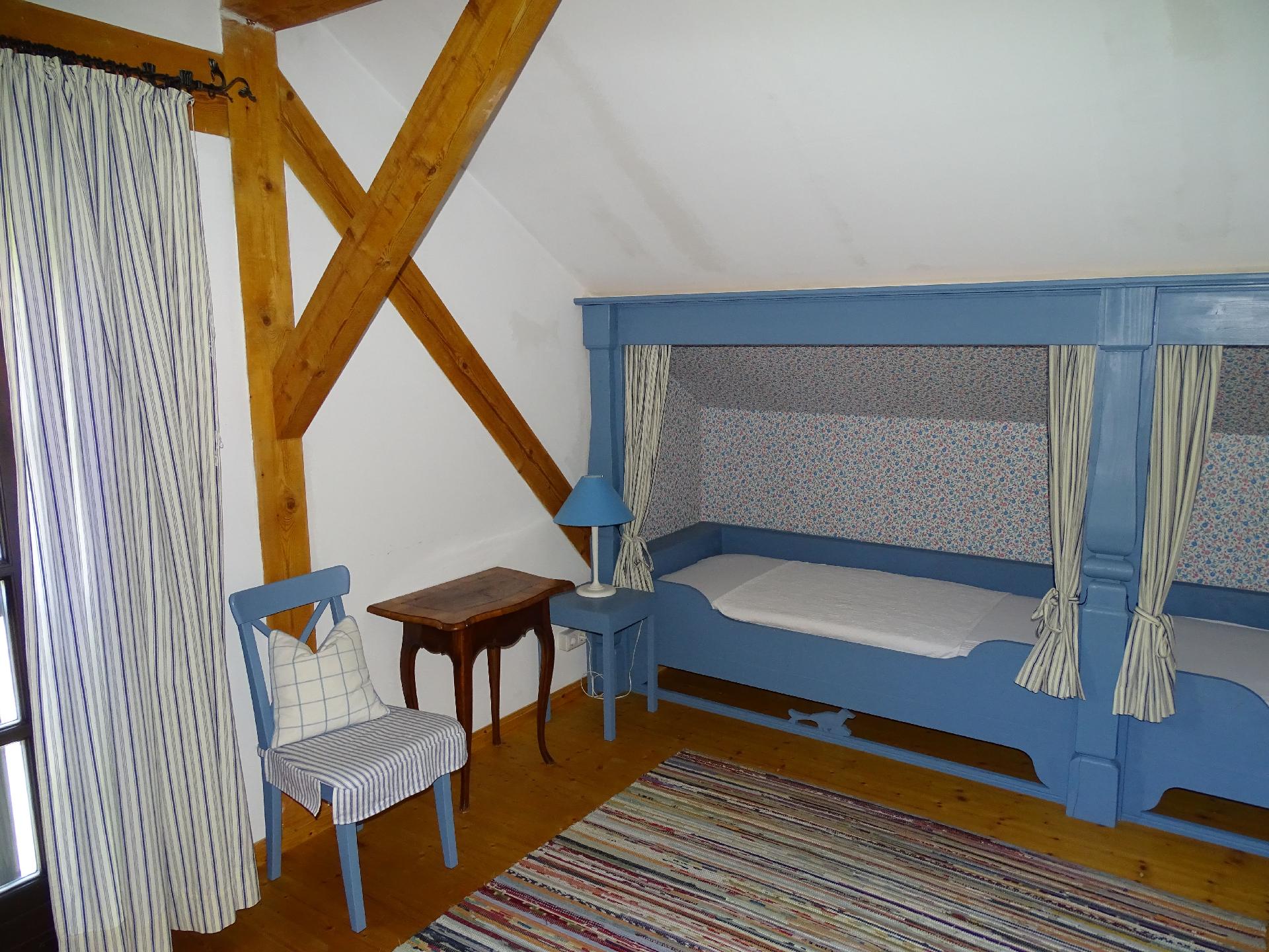 Das Ferienhaus Victoria ist auf zwei Etagen aufgeteilt. Im Erdgeschoss befindet sich der große Flur, das Gäste-WC und die große urige Wohnküche mit dem großen Kachelofen. Die Wohnküche ist dunkel getäfelt, so wie es in den bayrischen Wirtschaften früher aussah. Die Küche verfügt über eine Küchenzeile mit Herd, Spülmaschine und Kühlschrank. Der schöne große Kachelofen wird vom Flur aus beheizt. Über die große breite Holztreppe gelangen Sie in das Obergeschoss. Dort befindet sich das Badezimmer mit Dusche, WC und Wachbecken. Im ersten Schlafzimmer befindet sich ein Wohnbereich mit zwei Sofas, Schreibgelegenheit, ein Bauernschrank mit TV und zwei Kojenbetten. Im zweiten Schlafzimmer befindet sich ein großes Doppelbett und eine Sitzgruppe. Alle Böden im Haus sind aus Holz. Im zweiten Schlafzimmer und im Flur befinden sich geräumige Einbauschränke.