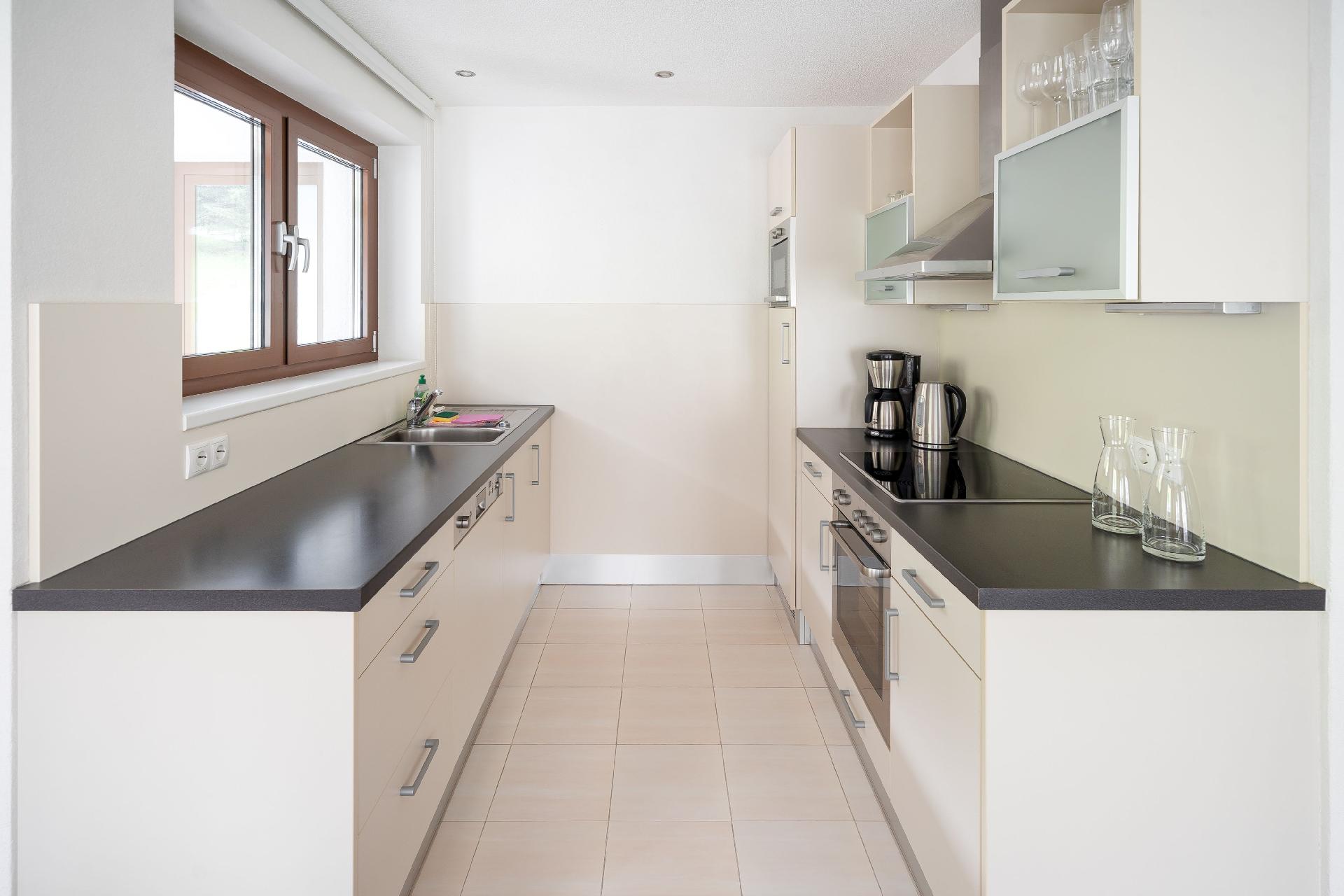Die Küche ist mit einer Spülmaschine, Mikrowelle, Kaffeemaschine, einem Herd mit Backofen und Wasserkocher ausgestattet.
