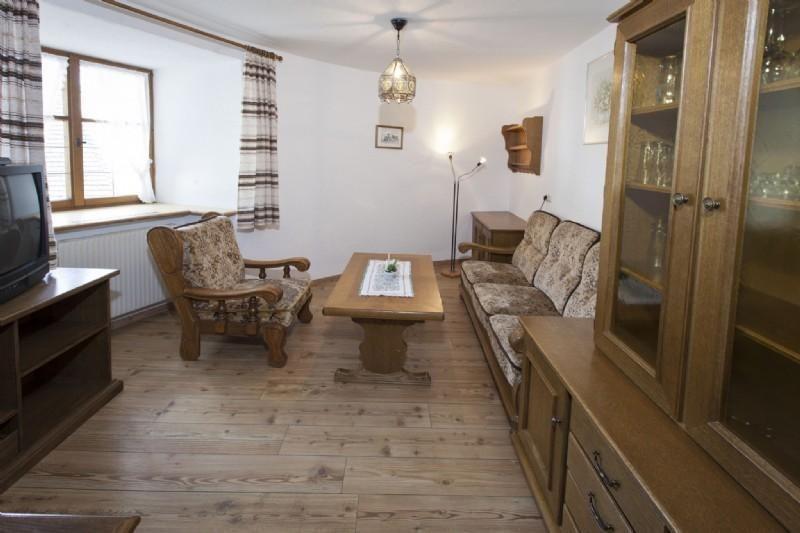 Die Ferienwohnung befindet sich im ersten Stock und erstreckt sich über eine Wohnfläche von 70 m². Das wohnliche, rustikale Ambiente zeichnet sich durch den Parkettfußboden, ein gepflegtes Mobiliar mit viel Holz, das dicke Mauerwerk und die weiß gestrichenen Wände aus. Als Schlafmöglichkeiten werden Ihnen zwei getrennte Schlafzimmer geboten. Herzstück der Wohnung ist die Wohnküche mit einer voll ausgestatteten Küchenzeile, einem Esstisch mit vier Stühlen und dem gemütlichen Wohnbereich. Anhand einer Geschirrspülmaschine, einem Herd mit vier Kochplatten und Backofen, einer Mikrowelle, einer Kaffeemaschine, sowie einem Kühlschrank mit Gefrierfach wird Ihnen eine komfortable und umfangreiche Selbstversorgung ermöglicht. Nach einem Tagesausflug entspannen Sie im Wohnbereich auf einem Dreisitzer und einem Sessel, neben der Schrankvitrine mit den passenden Gläsern für einen edlen Tropfen am Abend. Für Unterhaltung am Abend sorgt ein Fernseher mit Sat.-TV. Die Wohnung wird mit Heizkörpern in allen Räumen beheizt.