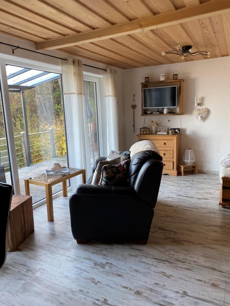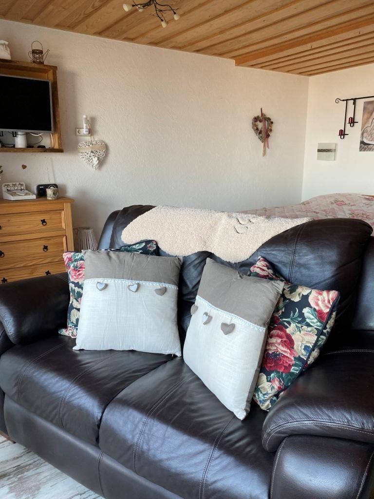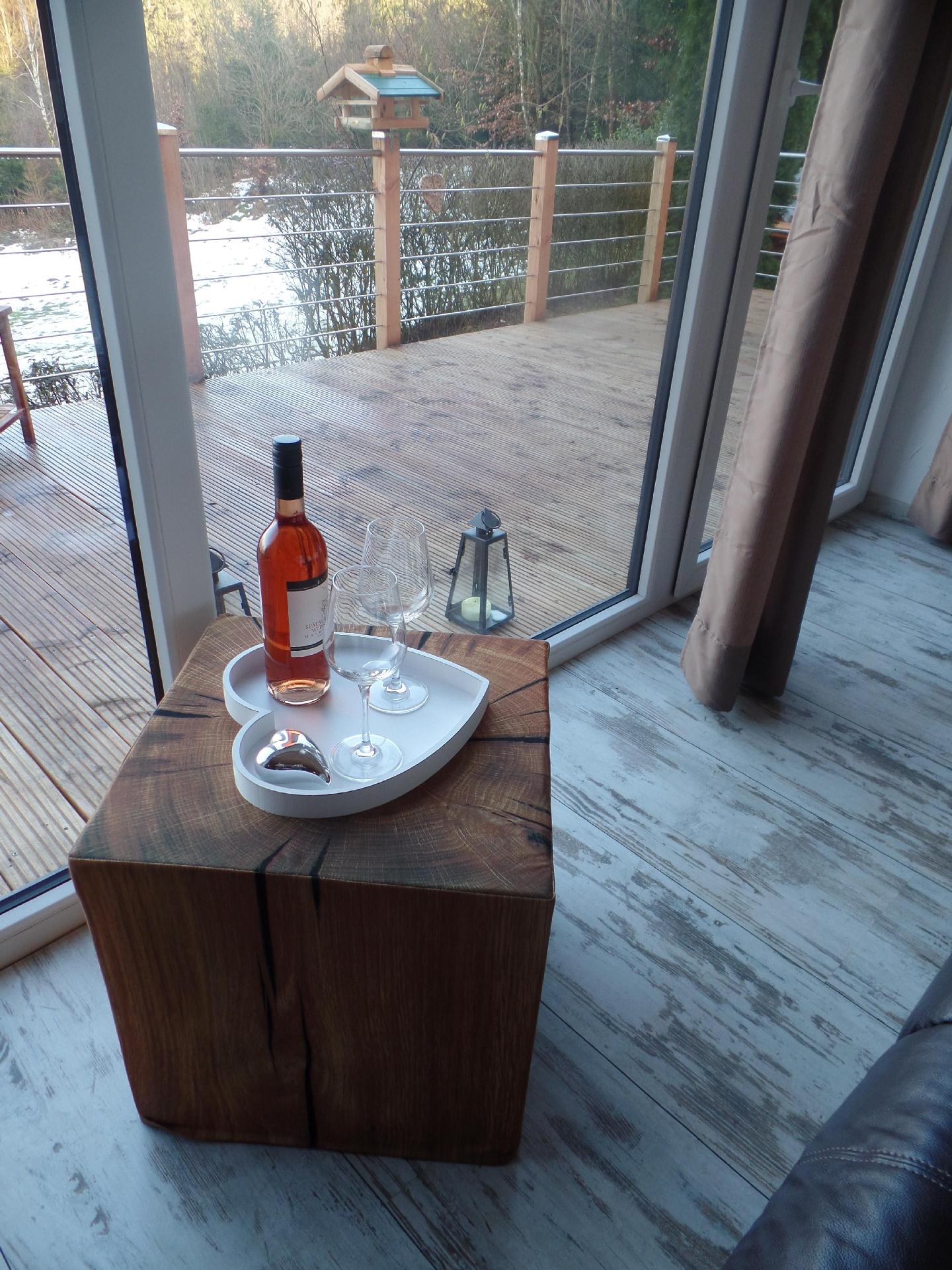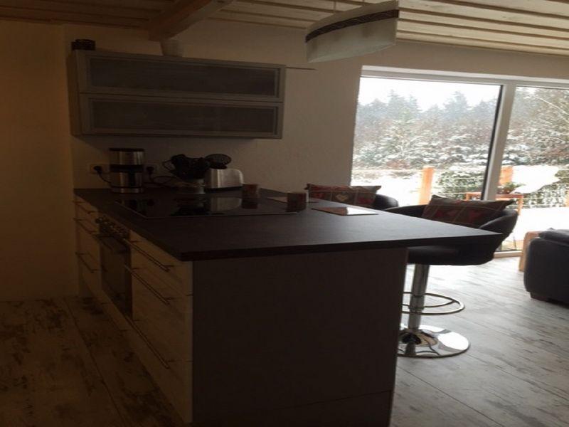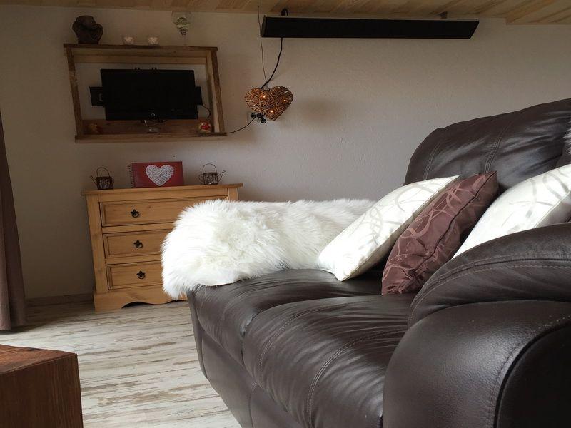 Im Inneren der Unterkunft sorgen bequeme Ledermöbel und ein warmes Kaminfeuer für ein wohnliches und entspanntes Ambiente. Nehmen Sie Platz auf der gemütlichen Ledercouch und bewundern Sie durch die Panorama-Fensterfront den weiten Blick über die Landschaft. Ein Flachbildfernseher mit Internet-TV und steht für abendliche Unterhaltung bereit, während das massive Balkenbett (160 cm x 200 cm) süße Träume garantiert. Die voll ausgestattete Küche mit freistehender Kochinsel, Cerankochfeld, Backofen, Mikrowelle, Geschirrspülmaschine, Kühlschrank, Kaffeemaschine und Toaster ermöglicht eine umfassende Selbstversorgung. Komplettiert wird das Interieur durch ein separates Badezimmer mit Regendusche und einem Herz-Waschbecken sowie ein separates WC.