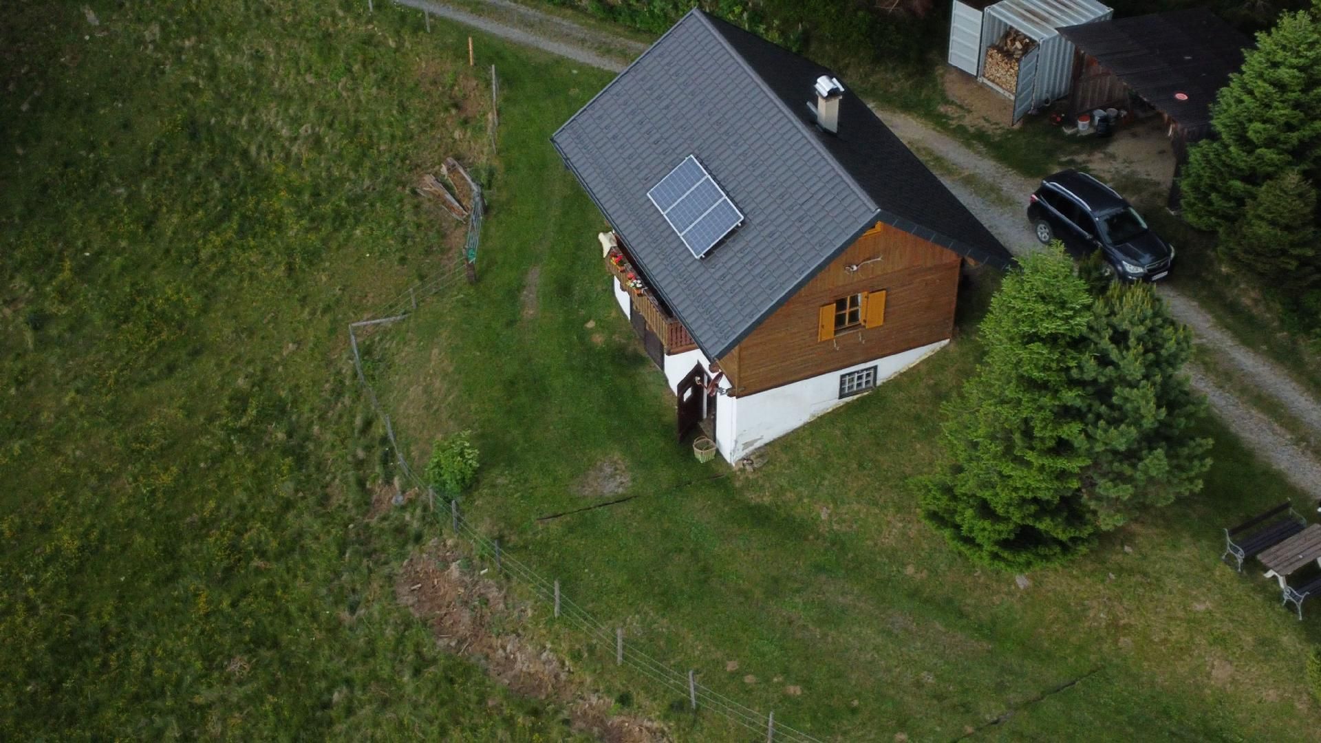 Vom Balkon im Erdgeschoss genießt man einen herrlichen Blick auf die Berge. Eine Sitzgelegenheit für die traumhafte Aussicht ist ebenfalls vor der Hütte. Die Kleinen können nach Herzenslust toben. Das Grundstück ist mit einem Gartenzaun abgegenzt. Vor der Hütte befindet sich ein Carport für zwei Autos.