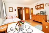 Unsere einladende Obergeschosswohnung präsentiert sich als perfekter Rückzugsort für zwei Personen. Alle Räumlichkeiten sind sorgfältig gestaltet, um Komfort und Funktionalität zu gewährleisten. Neben einem gemütlichen Wohnschlafraum mit einem bequemen Doppelbett, TV-Anschluss und einer Essecke, finden Sie eine voll ausgestattete Küche mit einem Cerankochfeld, einer Kaffeemaschine und einem Wasserkocher vor. Hinzu kommt eine Waschmaschine zur alleinigen Nutzung, die Ihnen den Alltag erleichtert.