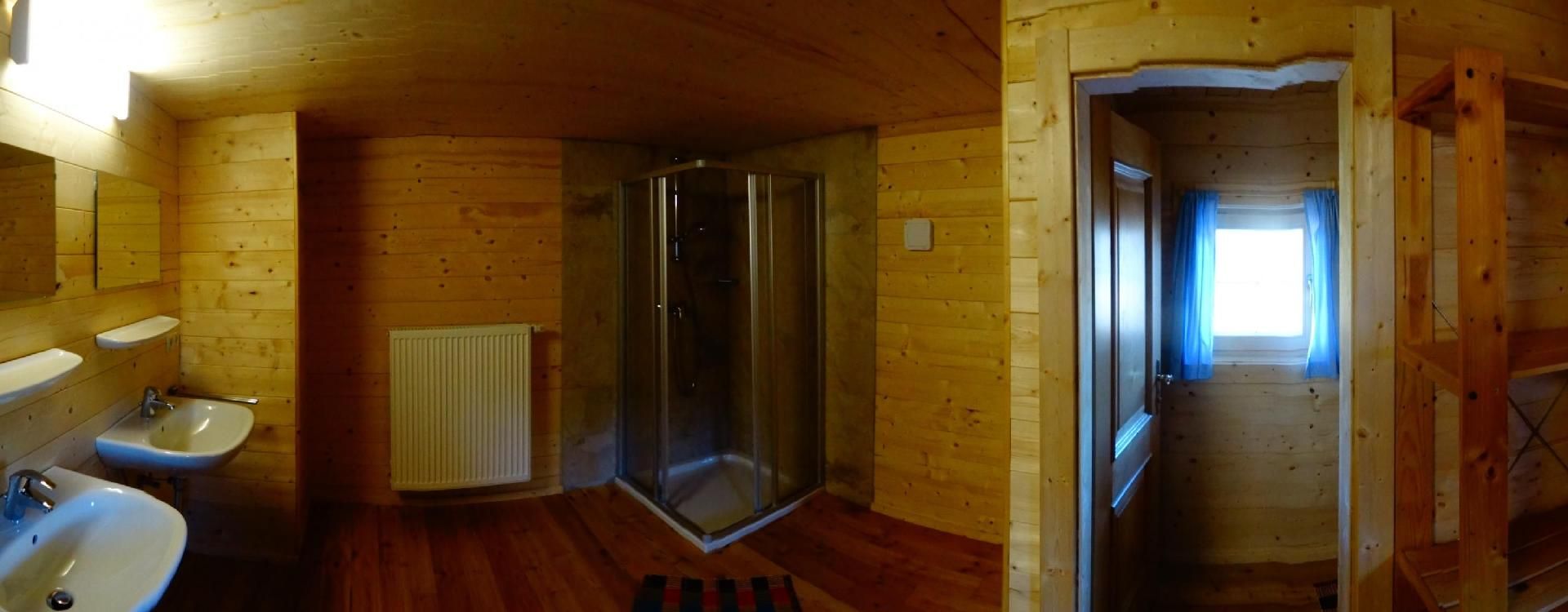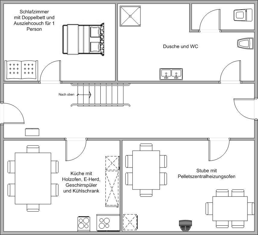 Sie wohnen allein in einem sehr einfach ausgestatteten, alten Bauernhaus. Auf einer Wohnfläche von 150 m² bietet es idealerweise Platz für zwölf Personen. Die Hütte verfügt über eine Zentralheizung, die vom Pelletofen in der Bauernstube versorgt wird. Die gemütliche Küche im rustikalen Stil im Erdgeschoss wird mit einem Holzofen beheizt und ist voll mit Herd, Backofen, Kaffeemaschine, Kühlschrank, Mikrowelle, Spülmaschine und Wasserkocher ausgestattet. Am großen Esstisch gibt es ausreichend Platz für alle, sei es zum Frühstück für einen gelungenen Start oder wenn man sich zum Abendessen nach einem erlebnisreichen Tag trifft. Ein Schlafzimmer sowie eines der beiden Bäder mit Dusche und WC befinden sich ebenfalls im Erdgeschoss des Hauses. Das zweite Duschbad sowie die drei restlichen Schlafräume liegen im Obergeschoss. Das erste Schlafzimmer verfügt über ein Doppelbett in normaler Breite. Im zweiten Zimmer gibt es ein Matratzenlager für sieben Personen bestehend aus zwei Doppelbetten und drei nebeneinander stehenden Einzelbetten. Alle Betten haben eine normale Breite. Das dritte Schlafzimmer bietet Ihnen ein normal breites Doppelbett, ein französisches Doppelbett (140 cm Breite) sowie ein normal breites Einzelbett. Im vierten Zimmer schließlich stehen Ihnen noch ein normal breites Doppel- und Einzelbett zur Verfügung, sodass im Haus eine Maximalbelegung mit 19 Personen möglich ist.