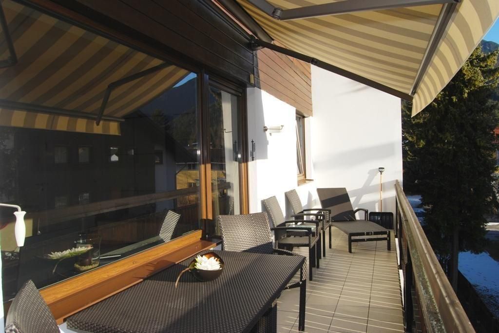 Im Außenbereich erwartet Sie eine Oase der Entspannung auf dem 15 m² großen, überdachten Südbalkon, ausgestattet mit einem Liegestuhl, einem Tisch für vier Personen und einer Markise - der ideale Ort, um das beeindruckende Alpenpanorama in vollem Umfang zu genießen. Für Raucher stellt der Balkon ein angenehmes Refugium dar. Zusätzlich sind hauseigene Parkplätze und Abstellmöglichkeiten für Fahrräder und Skier im Souterrain vorhanden.