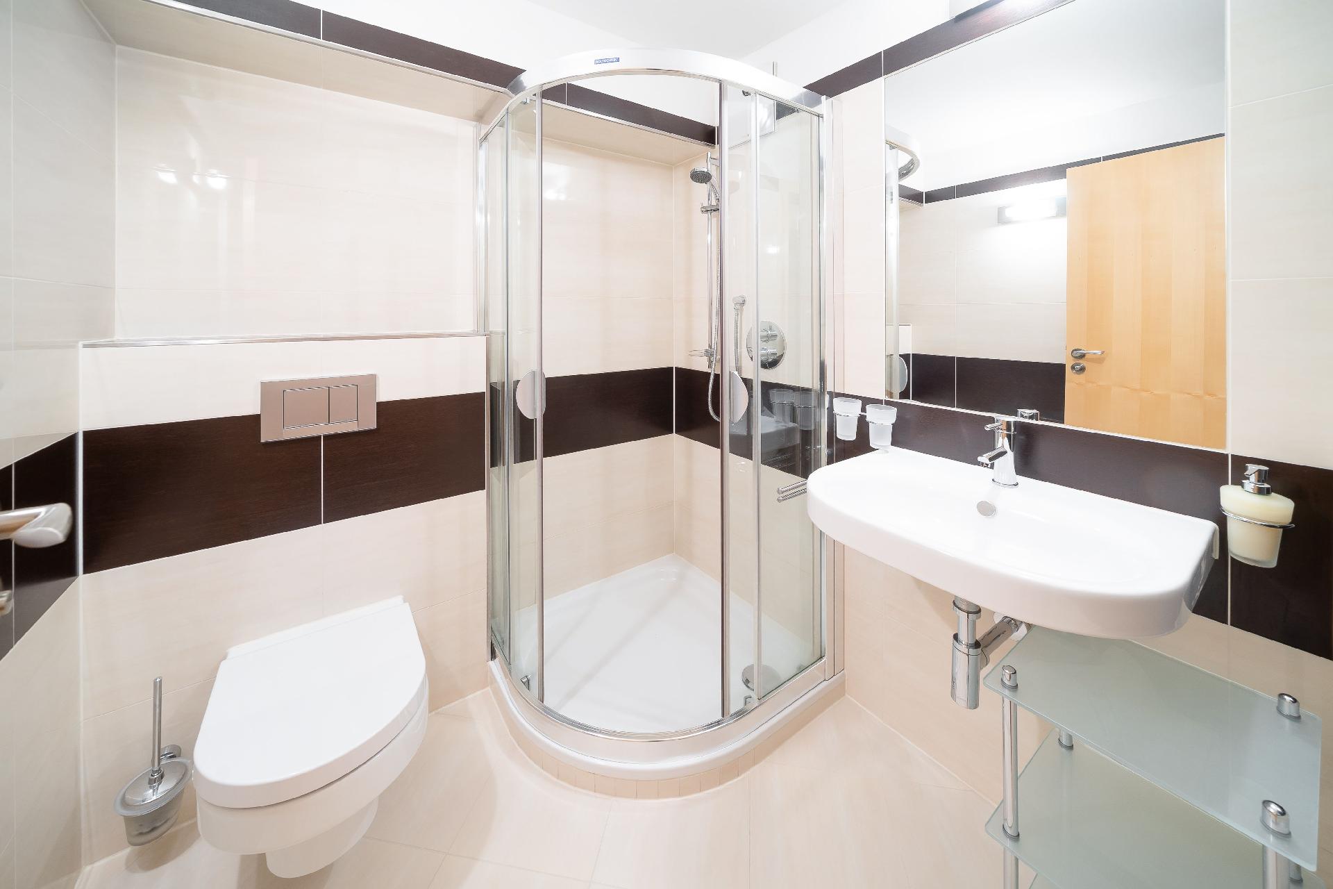 Die Bäder verfügen über Dusche oder Badewanne und größtenteils über Doppelwaschbecken.