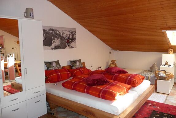Das Haus mit der persönlicher Betreuung, hier sind Sie richtig. Großzügiges Nichtraucher Dachgeschoßzimmer (ca 36m²) mit Du/WC/Föhn/Handtücher/Kosmetikspiegel/Bademäntel und Tresor. Gemütlicher Sitzecke (Sitzecke wird bei Bedarf zur Schlafcoach), Flat-TV mit Radio, Bett mit Leseleuchten (ca. 190 x 200), kostenfreies W-Lan, für mitreisende Kinder 1 Stapelbett (aus 1 wird 2), 4 türigen Kleiderschrank, Esstisch mit 5 Stühlen.
