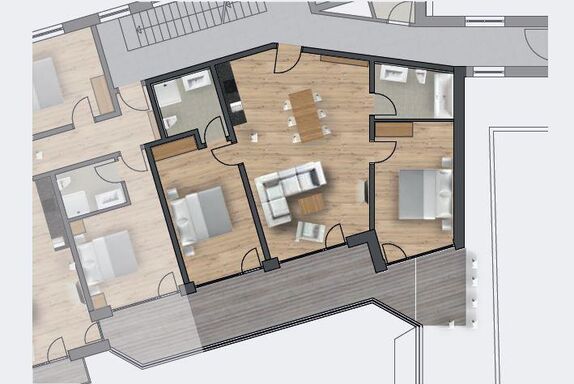Voll ausgestatteten Wohnküche mit Schlafsofa für bis zu zwei Personen, 1 Badezimmer mit Dusche/WC, 1 Badezimmer mit Badewanne/WC und 2 Doppelzimmer.