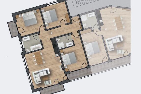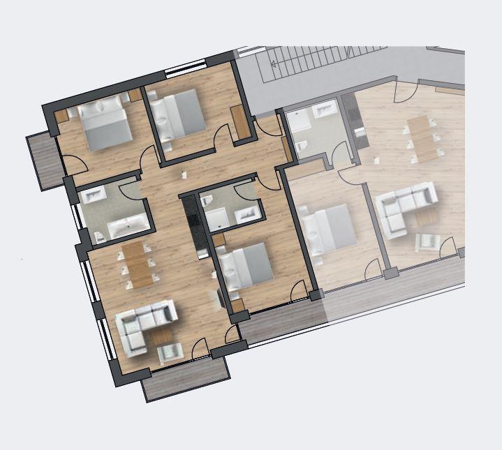 Voll ausgestatteten Wohnküche mit Schlafsofa für bis zu zwei Personen,1 Badezimmer mit Dusche/WC, 1 Badezimmer mit Badewanne/WC und 3 Doppelzimmer.