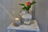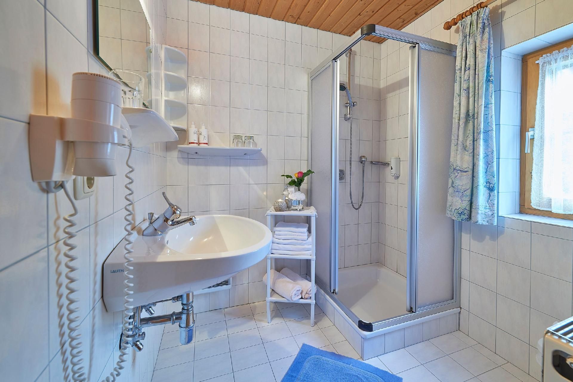 Badezimmer: Dusche, Waschbecken, Handtuchtrockner, Fön;