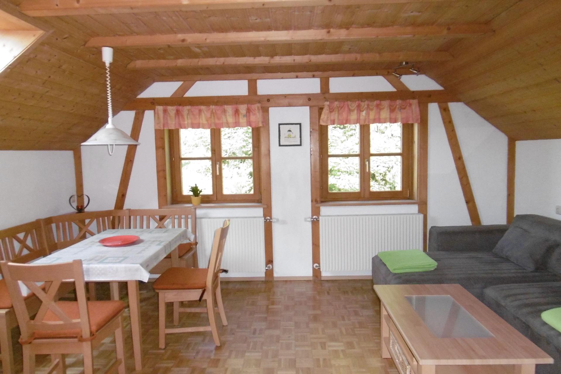 Genießen Sie erholsame Urlaubstage in der ca. 60 qm großen hellen, freundlich ausgestatteten Nichtraucher - Ferienwohnung, welche sich im Dachgeschoss des Hauses befindet. Im Badezimmer mit Dusche befindet sich eine Waschmaschine, während das WC separat untergebracht ist. Das erste Schlafzimmer ist mit Doppelbett sowie Kleiderschrank ausgestattet, während das zweite Schlafzimmer auf die Bedürfnisse von Kindern eingerichtet ist. Dort befinden sich ein Etagenbett und ein Wickeltisch. Auf Wunsch werden Baby- und Kleinkindausstattung wie Hochstuhl, Töpfchen und Gitterbett zur Verfügung gestellt. Eine gut ausgestattete Küche mit Herd, Backofen, Kaffeemaschine, Geschirr, Kühlschrank mit Gefrierfach und Wasserkocher erwartet Sie. Das Wohnzimmer ist gemütlich mit Couch, Sat.-TV sowie Esstisch eingerichtet. Weiterhin sind Bettwäsche, Geschirr- und Handtücher vorhanden.