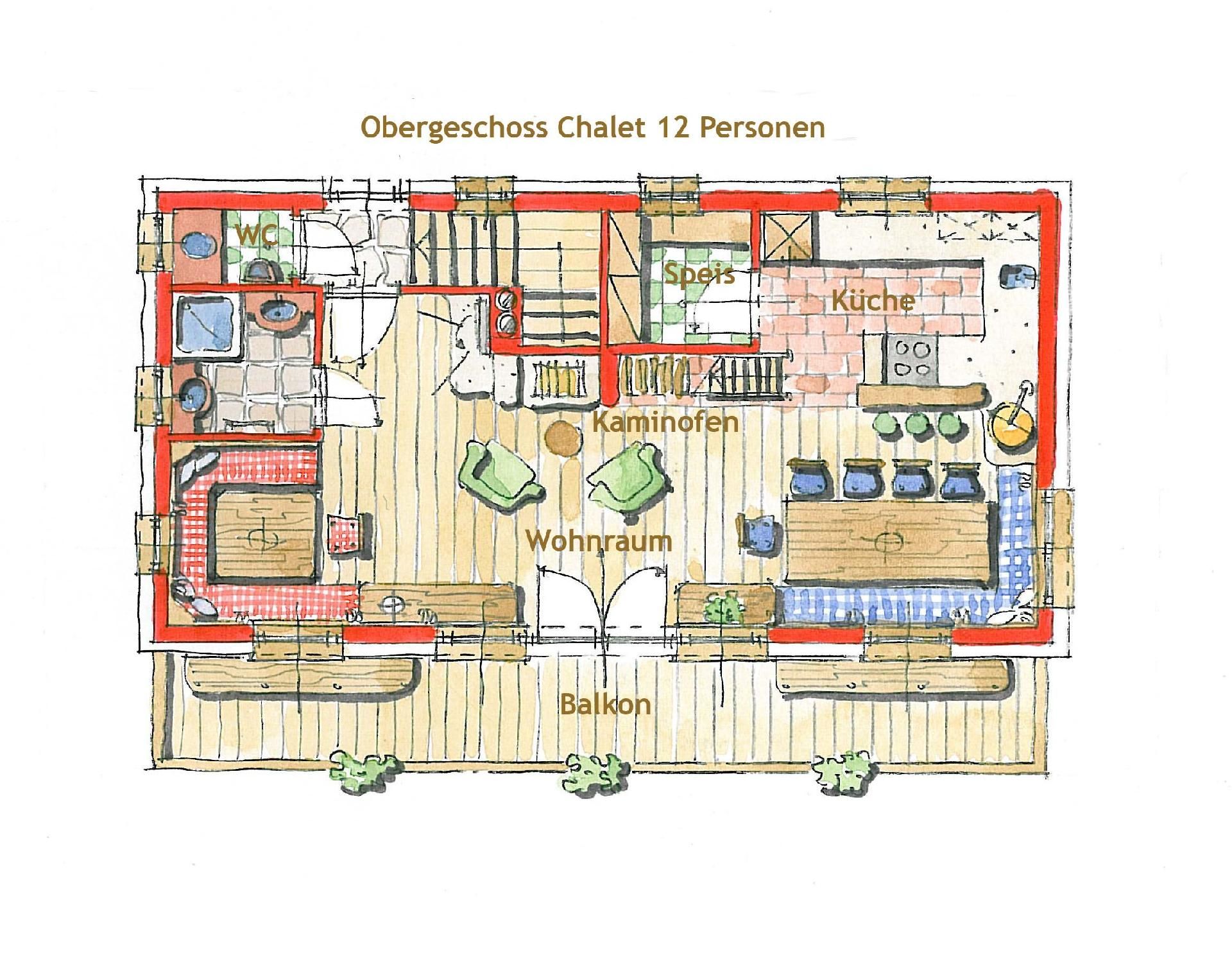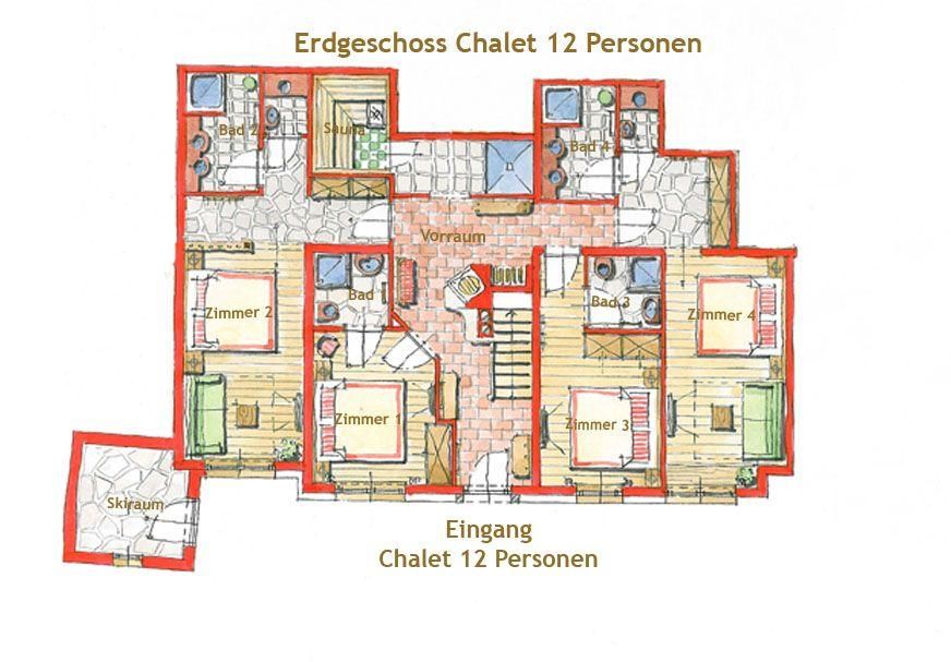 Das 160m² große Chalet erstreckt sich über zwei Etagen. Durch den Eingang gelangen Sie ins Erdgeschoss des Hauses, wo sich die vier separaten Schlafzimmer befinden. In den ersten beiden Schlafräumen ist jeweils ein großes Doppelbett vorzufinden. Im dritten Schlafzimmer befindet sich neben einem großen Doppelbett außerdem noch ein Schlafsofa für eine Person im Raum. Der vierte Schlafraum wurde mit zwei Doppelbetten ausgestattet. Zwei Schlafzimmer verfügen über ein Duschbad mit WC en Suite. Zwei weitere Badezimmer mit Dusche und WC sind außerdem im Erdgeschoss vorhanden. Für gemütliche Stunden oder Erholung nach einem erlebnisreichen Skitag wartet die hauseigene Sauna auf Sie. Über eine Treppe gelangen Sie in die obere Etage, die Sie mit einer großen, urigen und gemütlichen Stube empfängt. Neben einem großen Essplatz befindet sich hier die offene, voll ausgestattete Küche, die mit allen wichtigen Küchenutensilien versehen ist. Ein knisterndes Kaminfeuer verbreitet nicht nur Gemütlichkeit in der kälteren Jahreszeit sondern lädt auch zu romantischen Stunden ein. Ein separates WC rundet das Angebot ab.