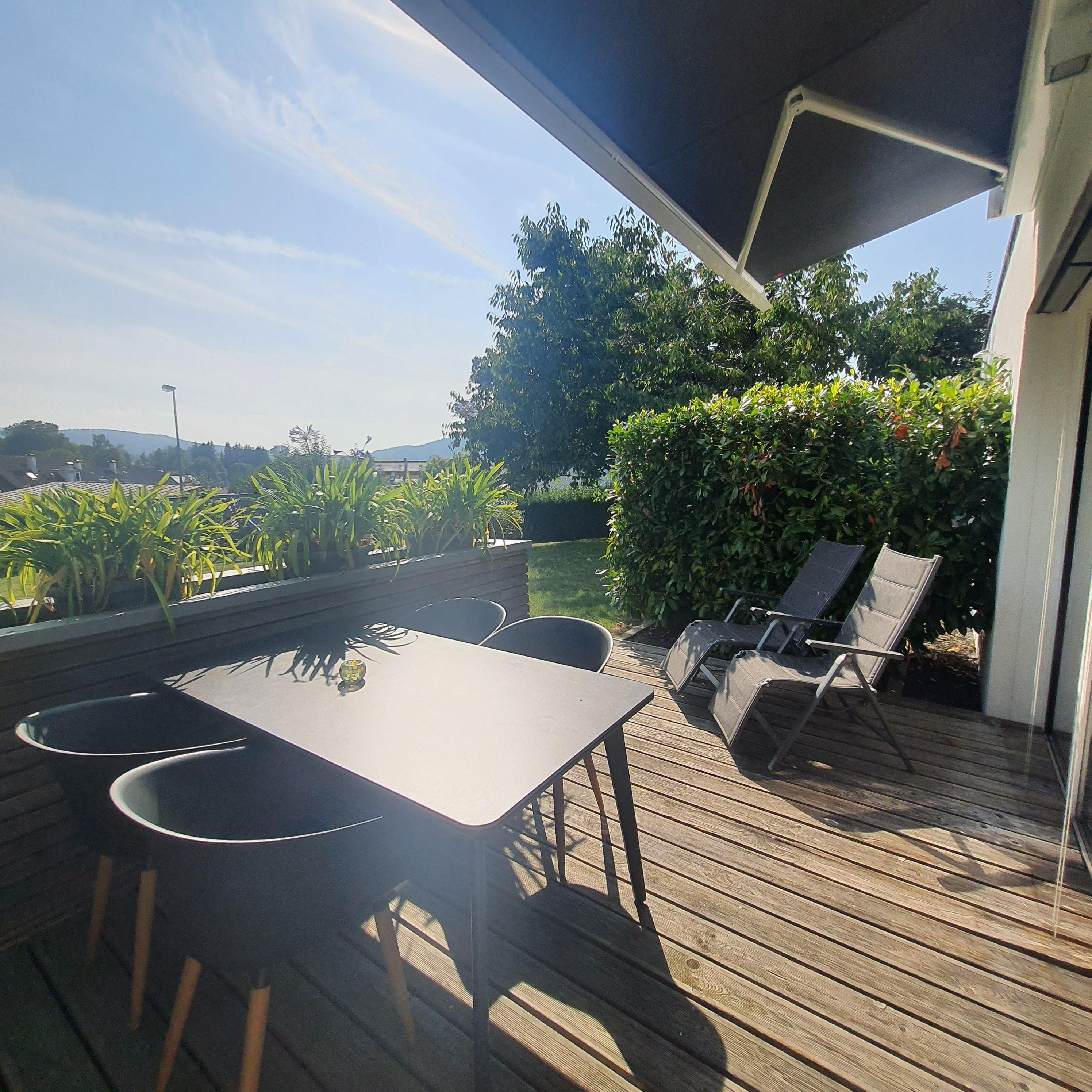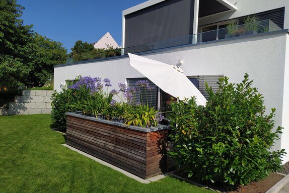 Terrasse mit Gartenmöbeln, Sonnenliege und Sonnenschirm, großer Garten mit Kinderspielgeräten (Benutzung auf eigene Gefahr), Grillmöglichkeit