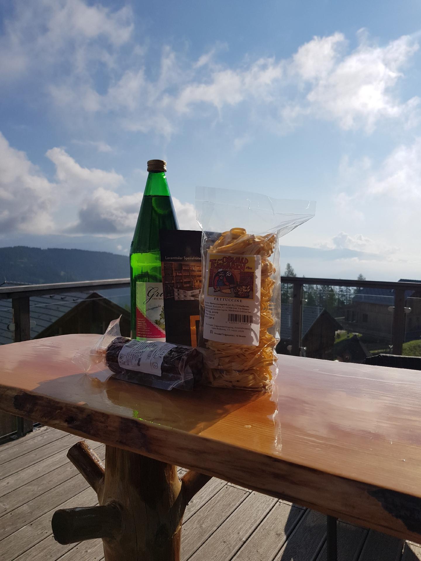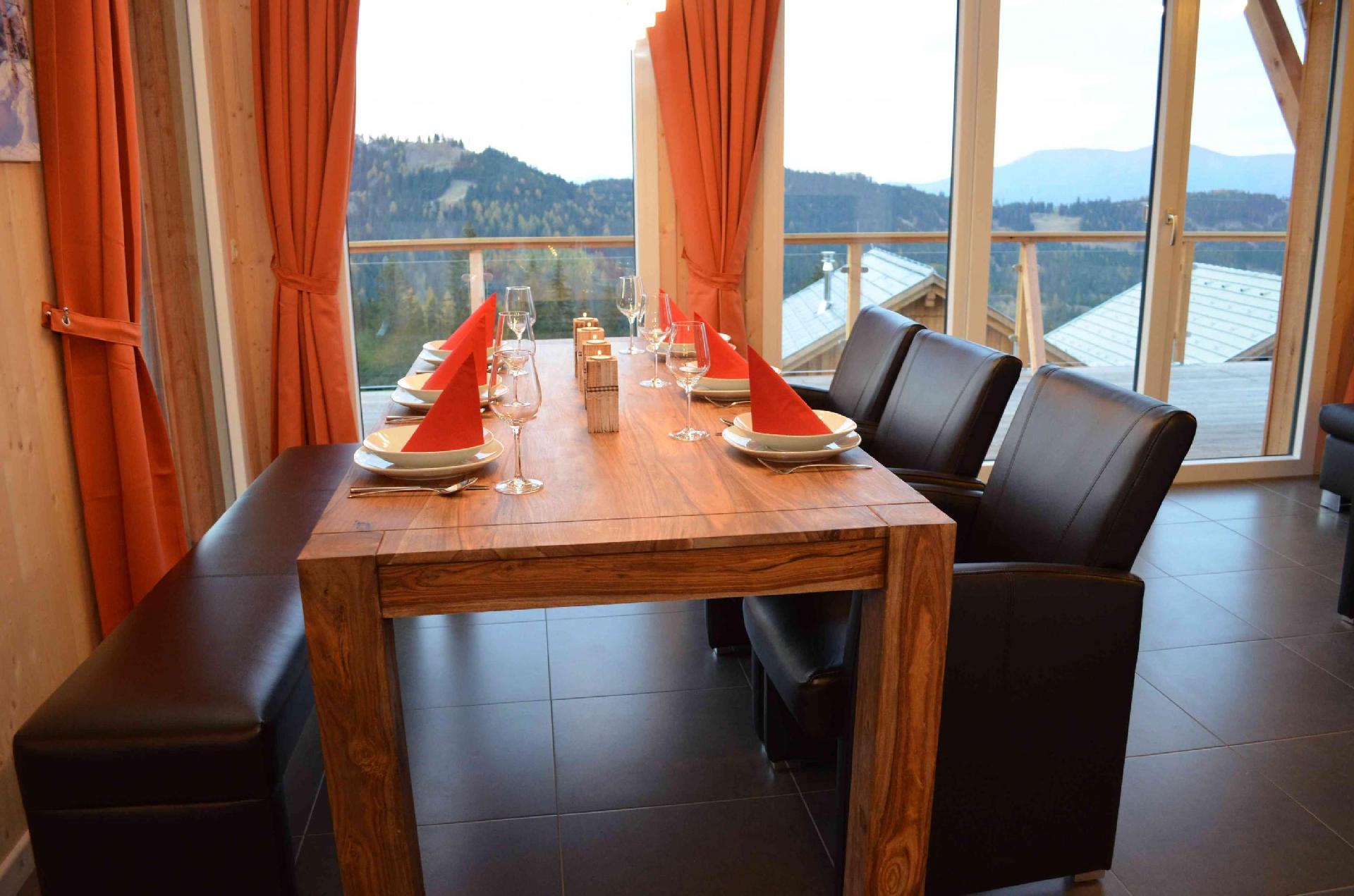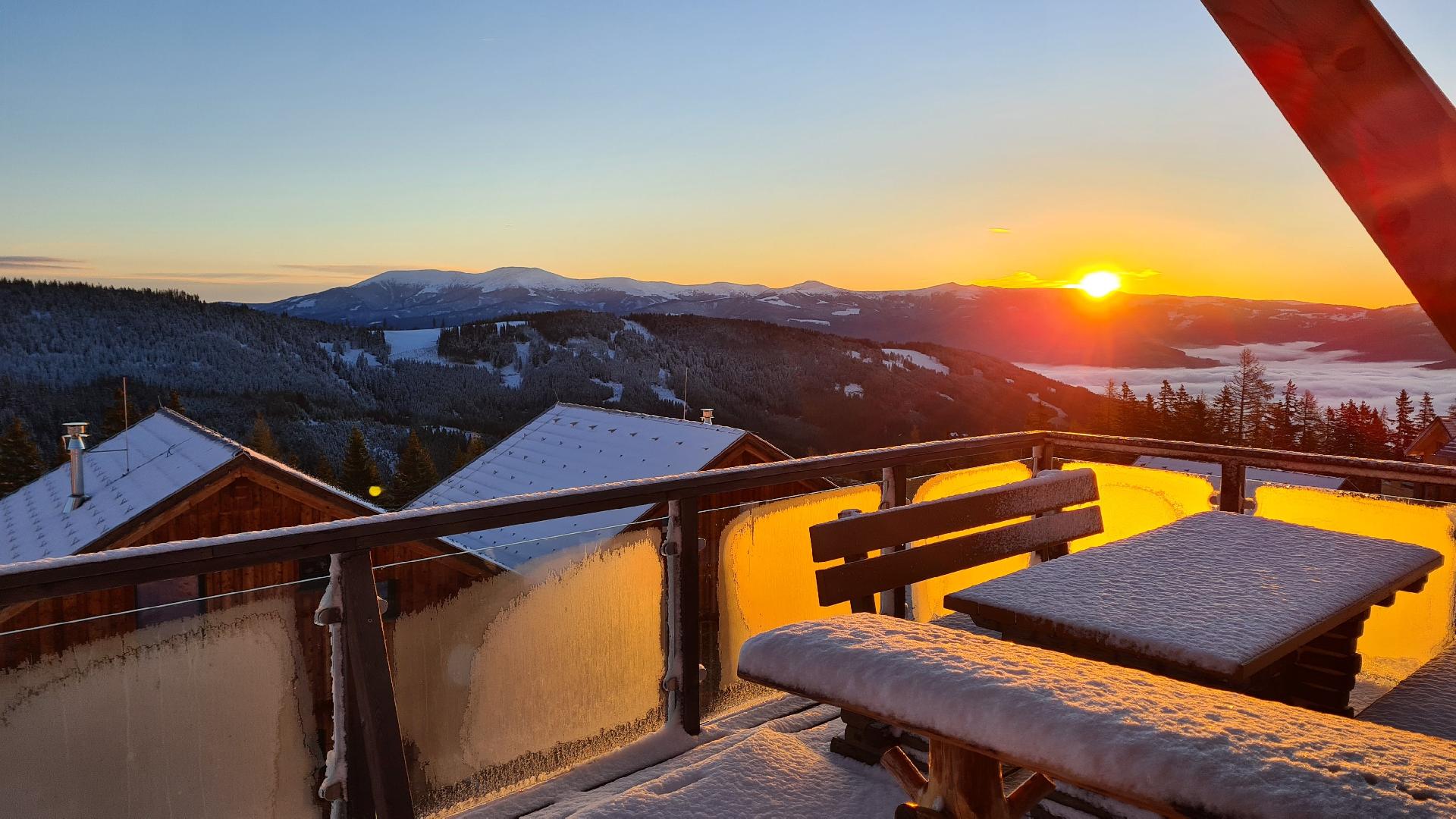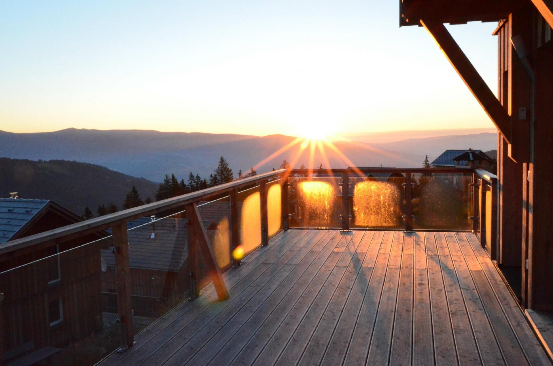 Von der großzügigen Panoramaterrasse können Sie beim Frühstück oder beim abendlichen Aperitif einen traumhaften Blick auf die Lavanttaler Alpen genießen.