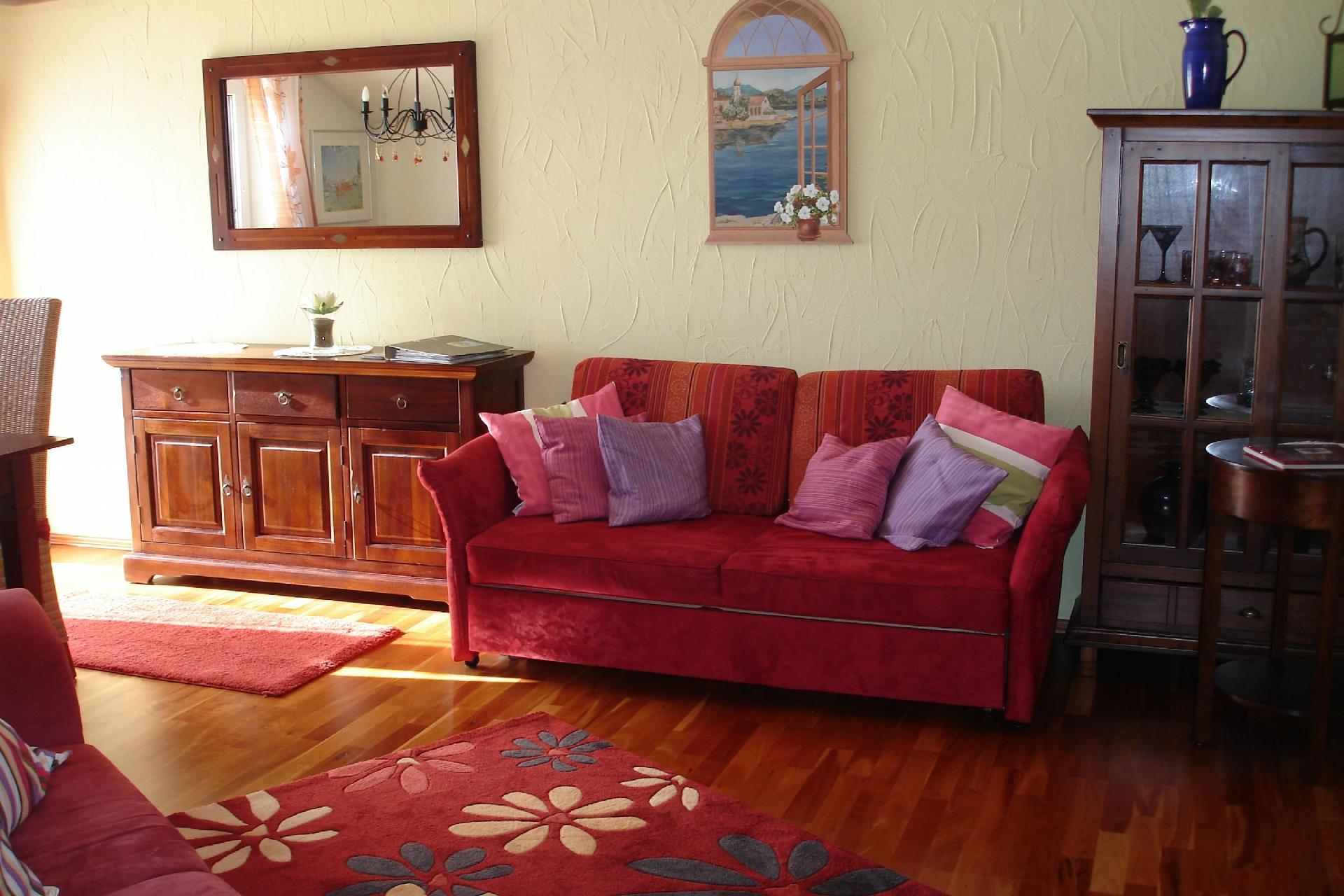 Die Innenräume der Ferienwohnung strahlen mit ihrer geschmackvollen Einrichtung Gemütlichkeit und Komfort aus. Ein Highlight ist der elegante Wohn- und Essbereich mit Qualitätsparkett und einem südseitig gelegenen Balkon. Zur Unterhaltung stehen ein Satelliten-TV und ein DVD-Player bereit. Für Kaffeeliebhaber sind eine Filter- sowie eine Pads-Kaffeemaschine vorhanden, und die Spülmaschine erleichtert die Urlaubsküche. Eine Waschmaschine und ein Wäschetrockner zur gemeinschaftlichen Nutzung runden das Angebot ab.