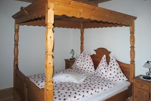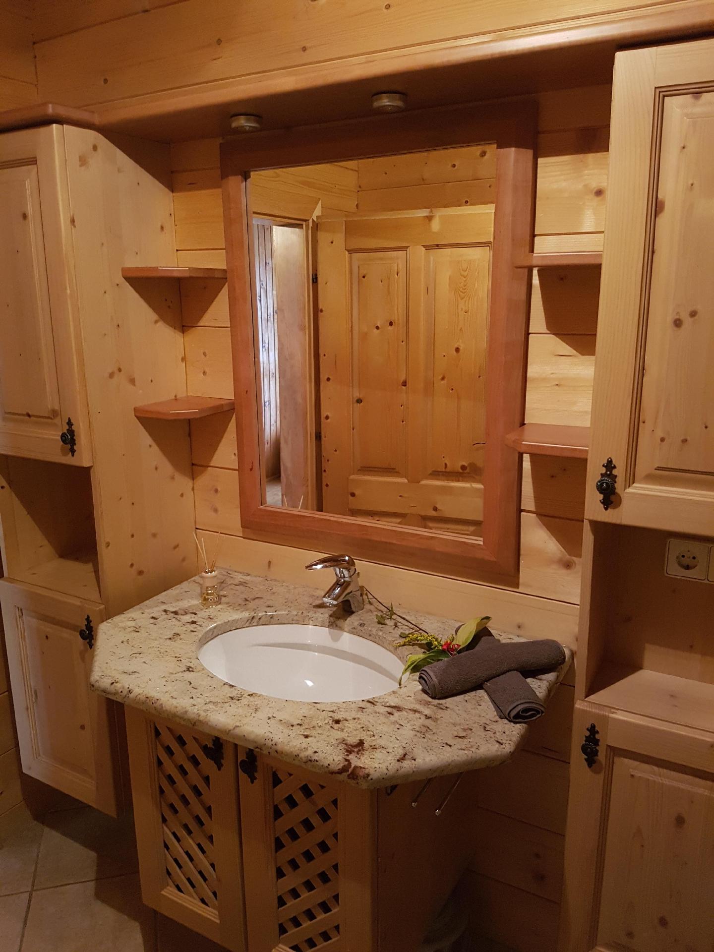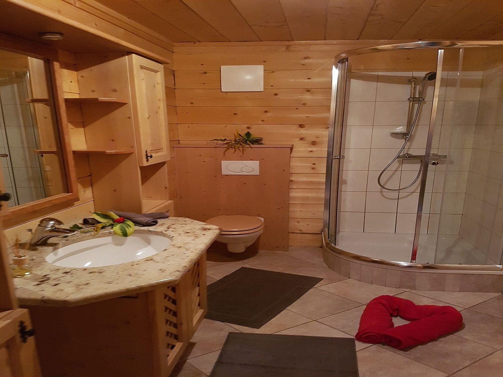Das Ferienhaus ist eine neu ausgebaute Selbstversorgerhütte mit Platz für zwei bis zehn Personen (150 m2 Wohnfläche). Die Vollholzmöblierung wurde von einem Tischlermeister angefertigt und verströmt rusikalen Charme. Ausgestattet wurde die Hütte mit viel Liebe zum Detail. In der gemütlichen Wohnküche mit der großen Sitzecke finden Sie mit Ihrer Familie oder Ihren Freunden reichlich Platz. Das Herz der Wohnküche ein aufgemauerter Holzherd wie zu Urgroßmutters Zeiten. Er sorgt für angenehme Wärme, gutes Essen und für romantische Stunden am Abend. Elektroplatte, Geschirrspüler, Kühlschrank, Abwasch mit Warmwasser, Couch, Radio, Sat-TV, DVD-Player und Videorecorder komplettieren die Komfort-Ausstattung. Die vier Schlafzimmer sind mit Möbeln aus Vollholz ausgestattet. Im heimeligen Himmelbett erleben Ihren Urlaub wie zu Kaisers Zeiten. Eine Zirbensauna sowie ein Whirlpool (Warm- und Kaltwasser bis 42 Grad) auf der riesigen Sonnenterrasse lassen auch an Schlechtwettertagen das Herz höher schlagen. In dem Ferienhaus gibt es zwei voll ausgestattete Badezimmer mit Dusche, Waschbecken, WC, Elektroboiler.