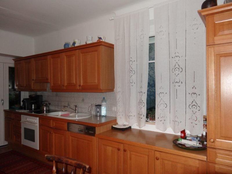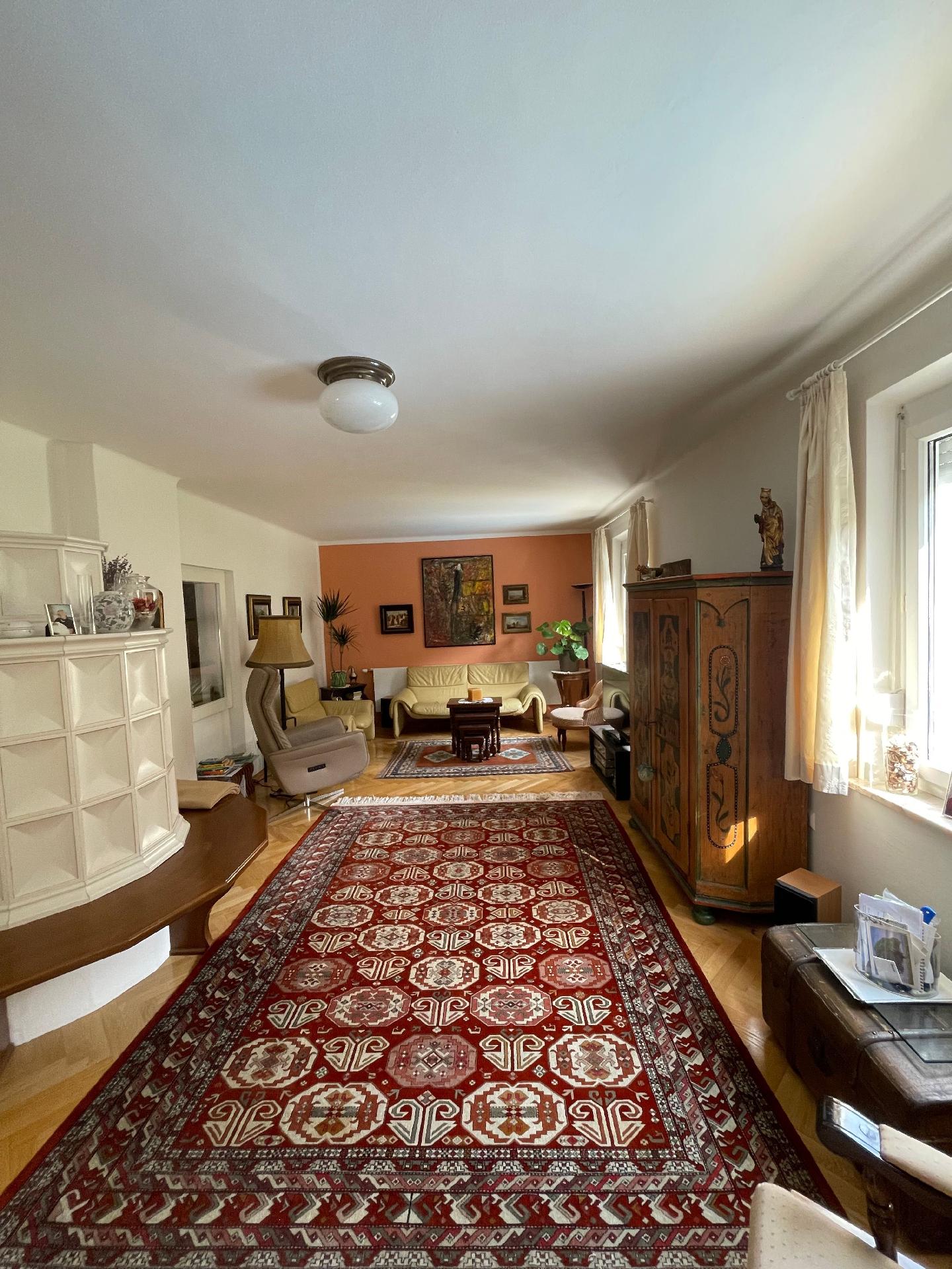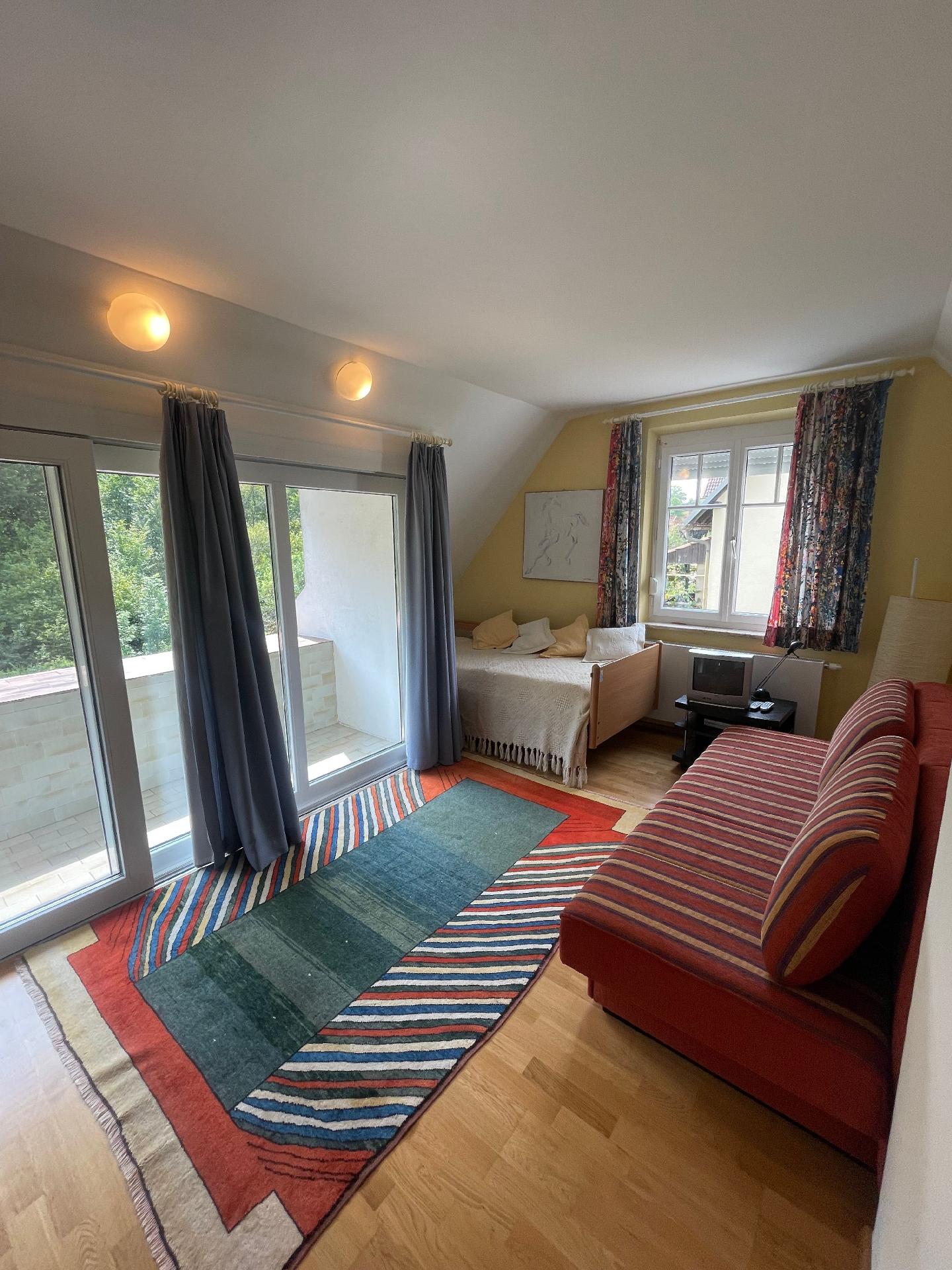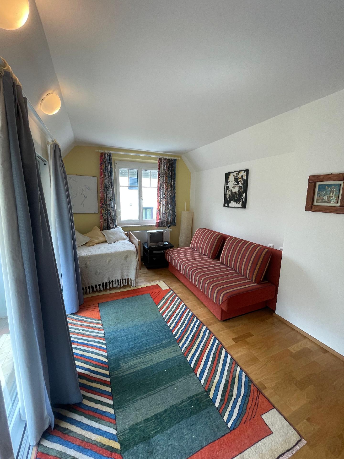 Im Erdgeschoss sind ein Vorraum, eine Toilette, eine Küche mit Essplatz und Ausgang auf die überdachte Terrasse, sowie ein Wohnzimmer mit Kachelofen. Die Küche ist nicht neu aber voll ausgestattet mit Geschirrspüler, Kaffeemaschine, Nespressomaschine, Toaster, Kühlschrank mit Gefrierfach, Mikrowelle, Besteck, Gläser, Teller etc.