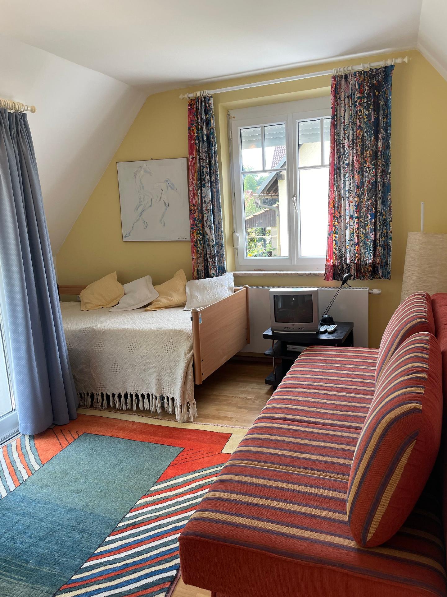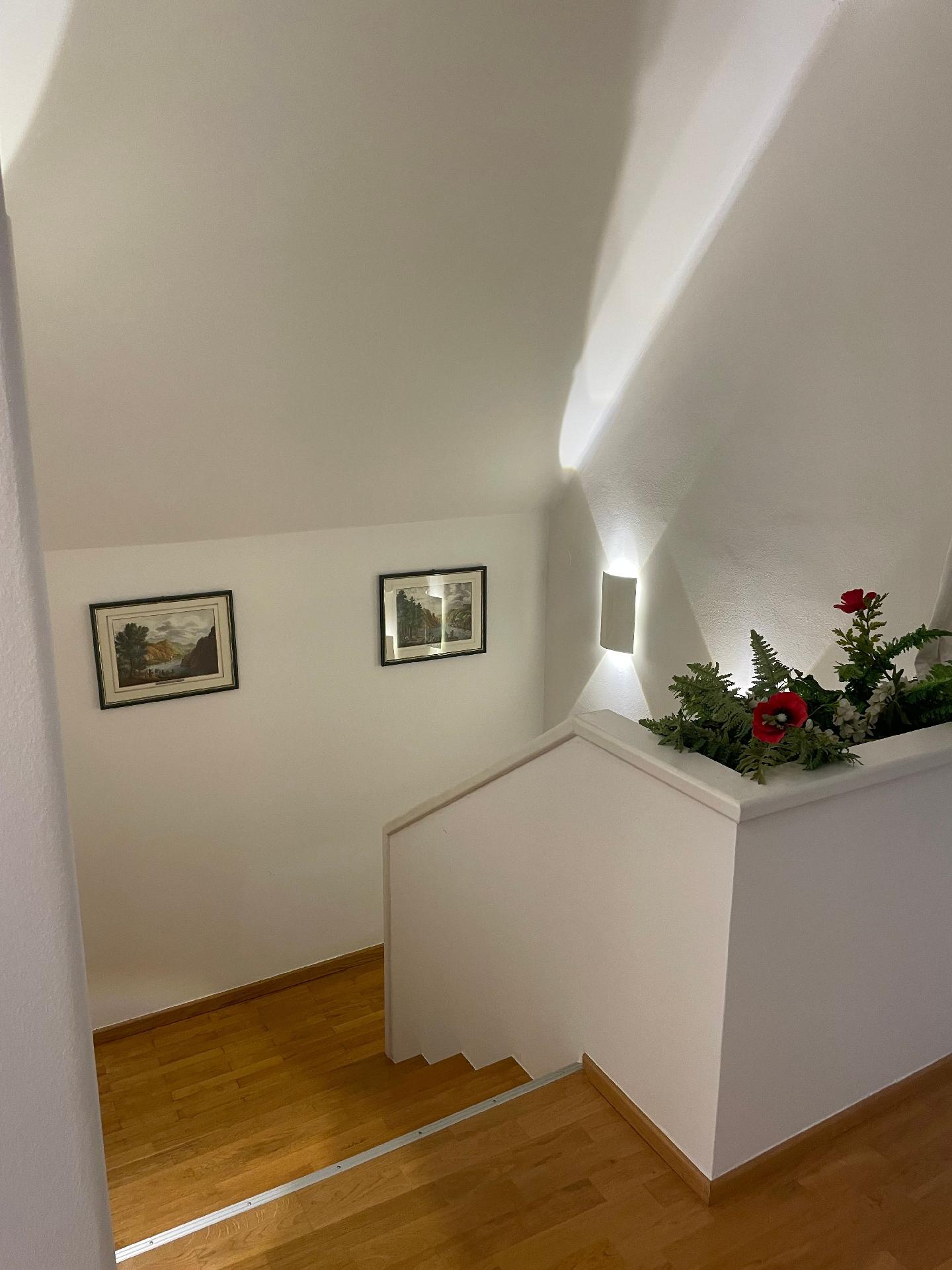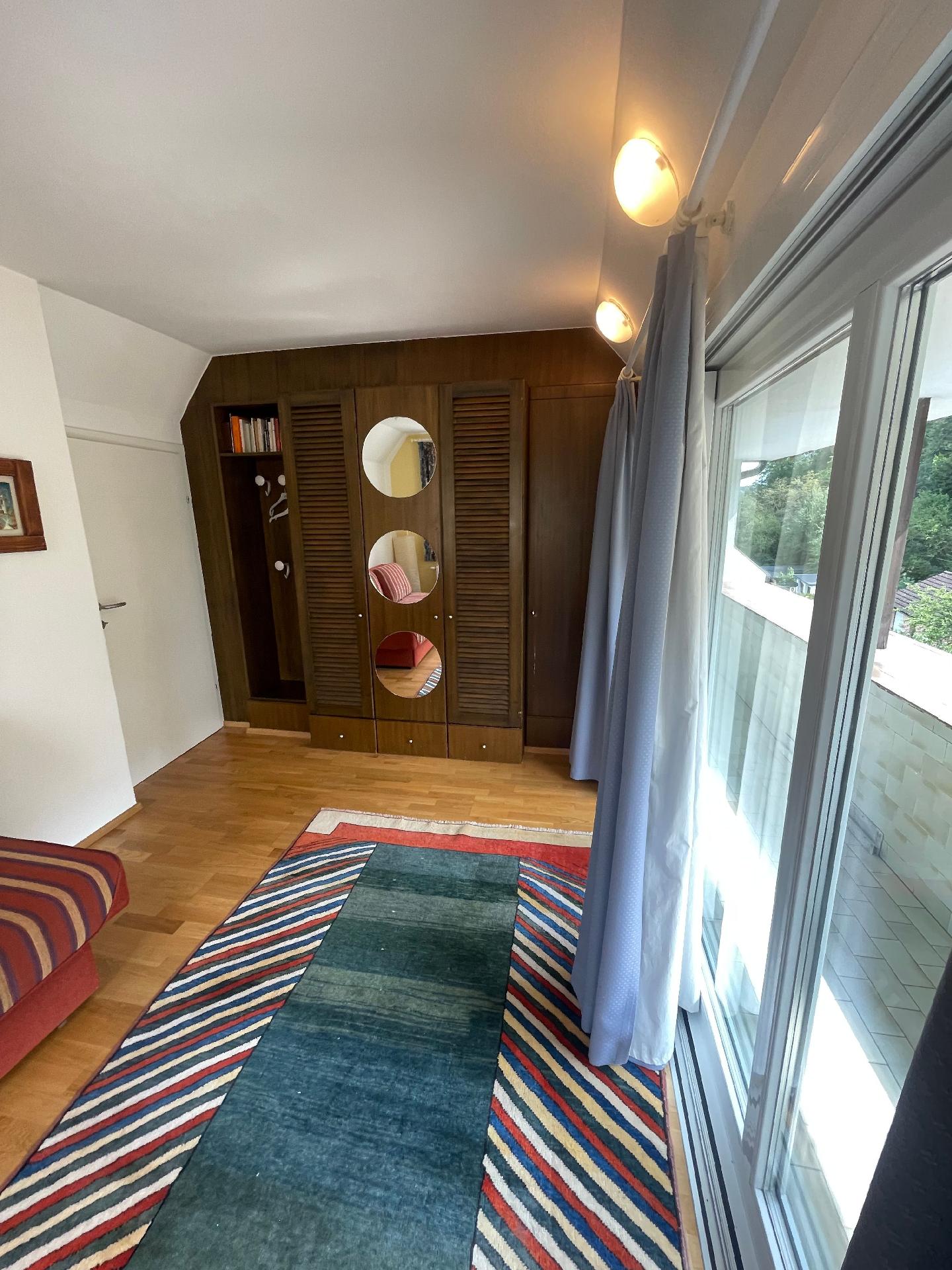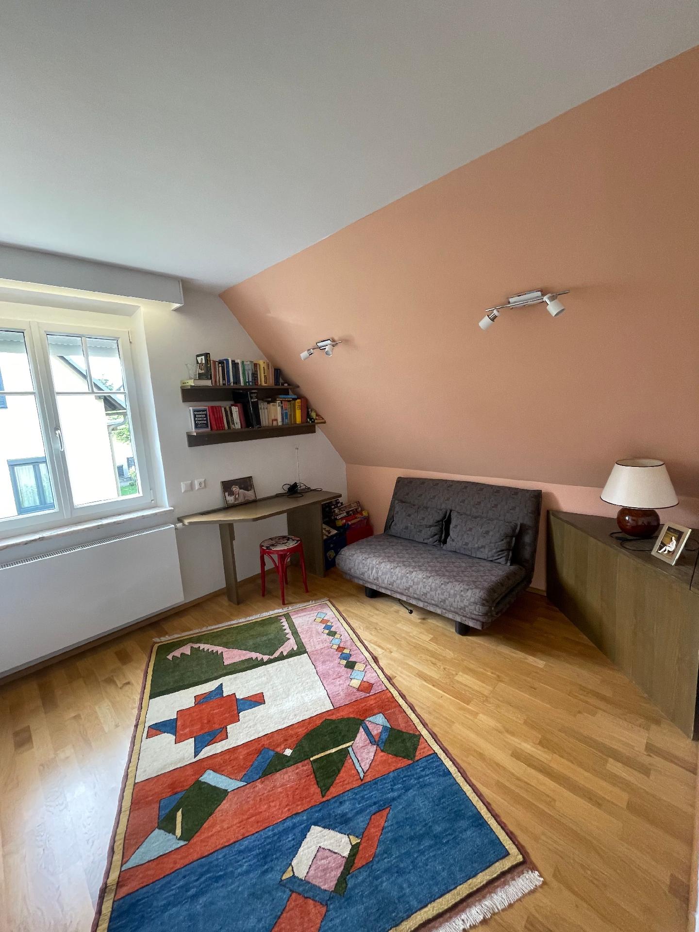 Im Erdgeschoss sind ein Vorraum, eine Toilette, eine Küche mit Essplatz und Ausgang auf die überdachte Terrasse, sowie ein Wohnzimmer mit Kachelofen. Die Küche ist nicht neu aber voll ausgestattet mit Geschirrspüler, Kaffeemaschine, Nespressomaschine, Toaster, Kühlschrank mit Gefrierfach, Mikrowelle, Besteck, Gläser, Teller etc.