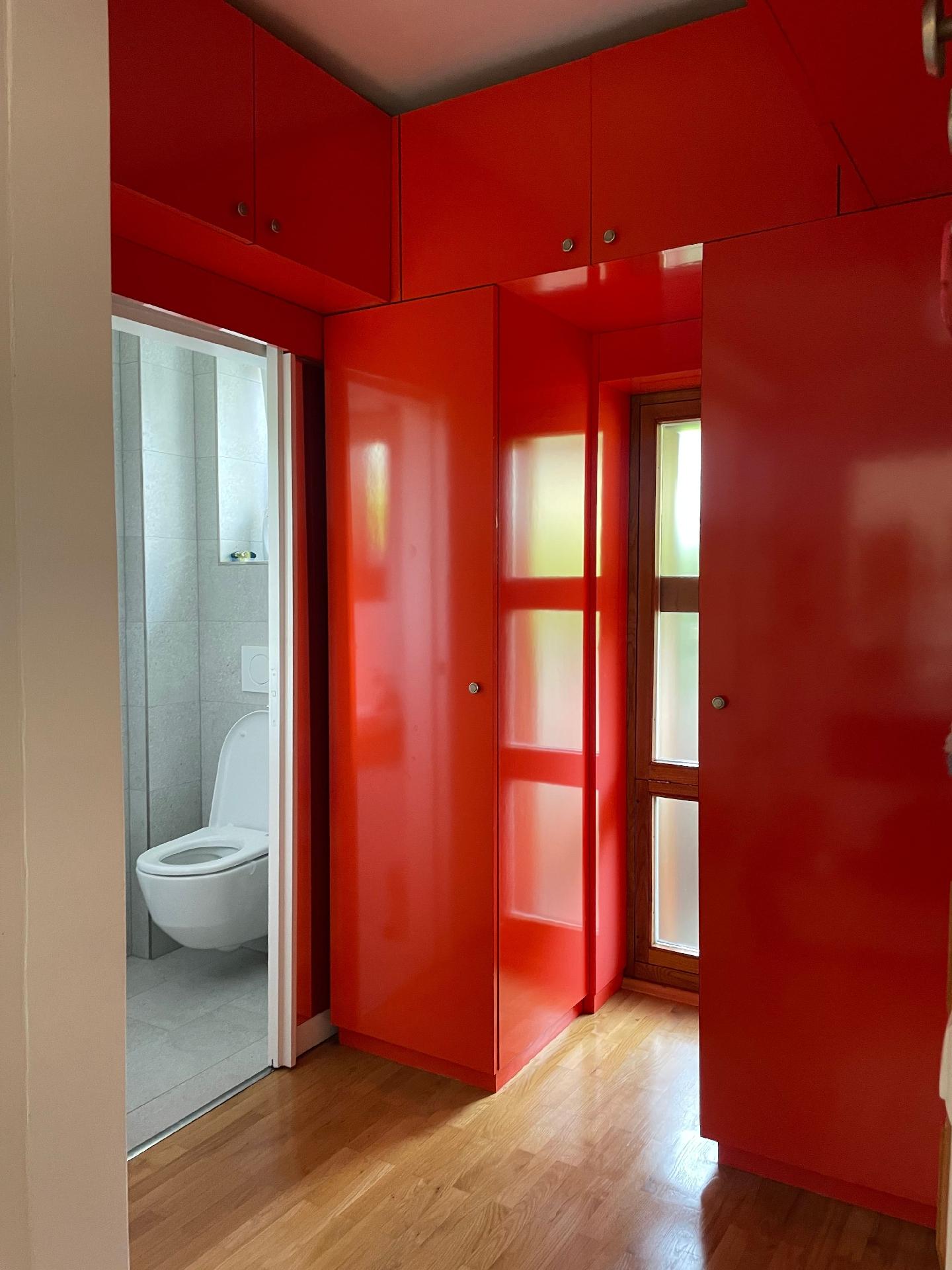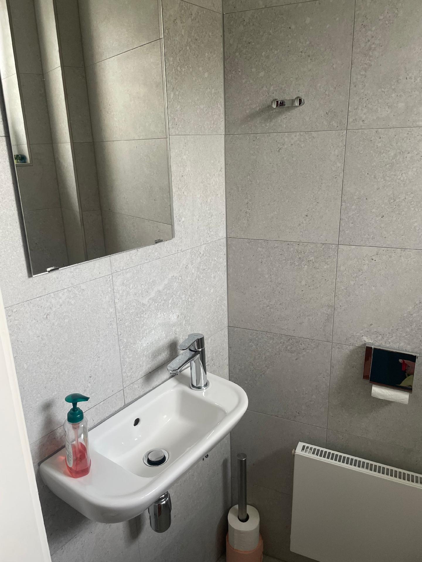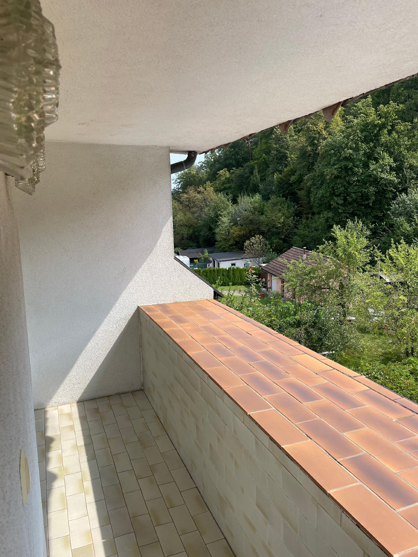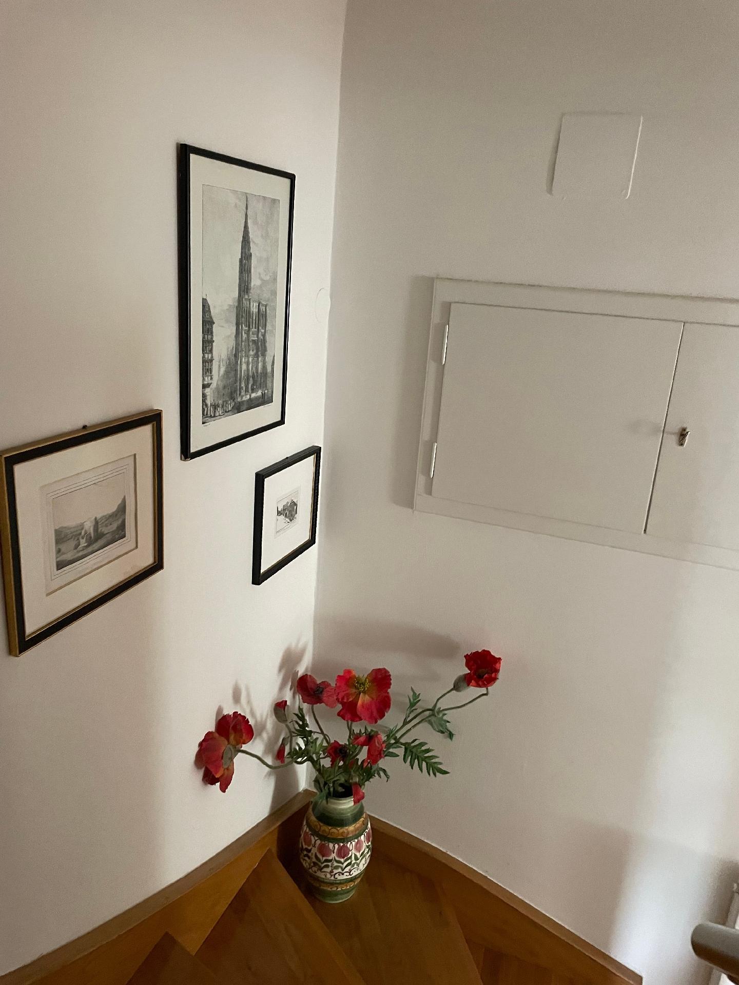Im Erdgeschoss sind ein Vorraum, eine Toilette, eine Küche mit Essplatz und Ausgang auf die überdachte Terrasse, sowie ein Wohnzimmer mit Kachelofen. Die Küche ist nicht neu aber voll ausgestattet mit Geschirrspüler, Kaffeemaschine, Nespressomaschine, Toaster, Kühlschrank mit Gefrierfach, Mikrowelle, Besteck, Gläser, Teller etc.