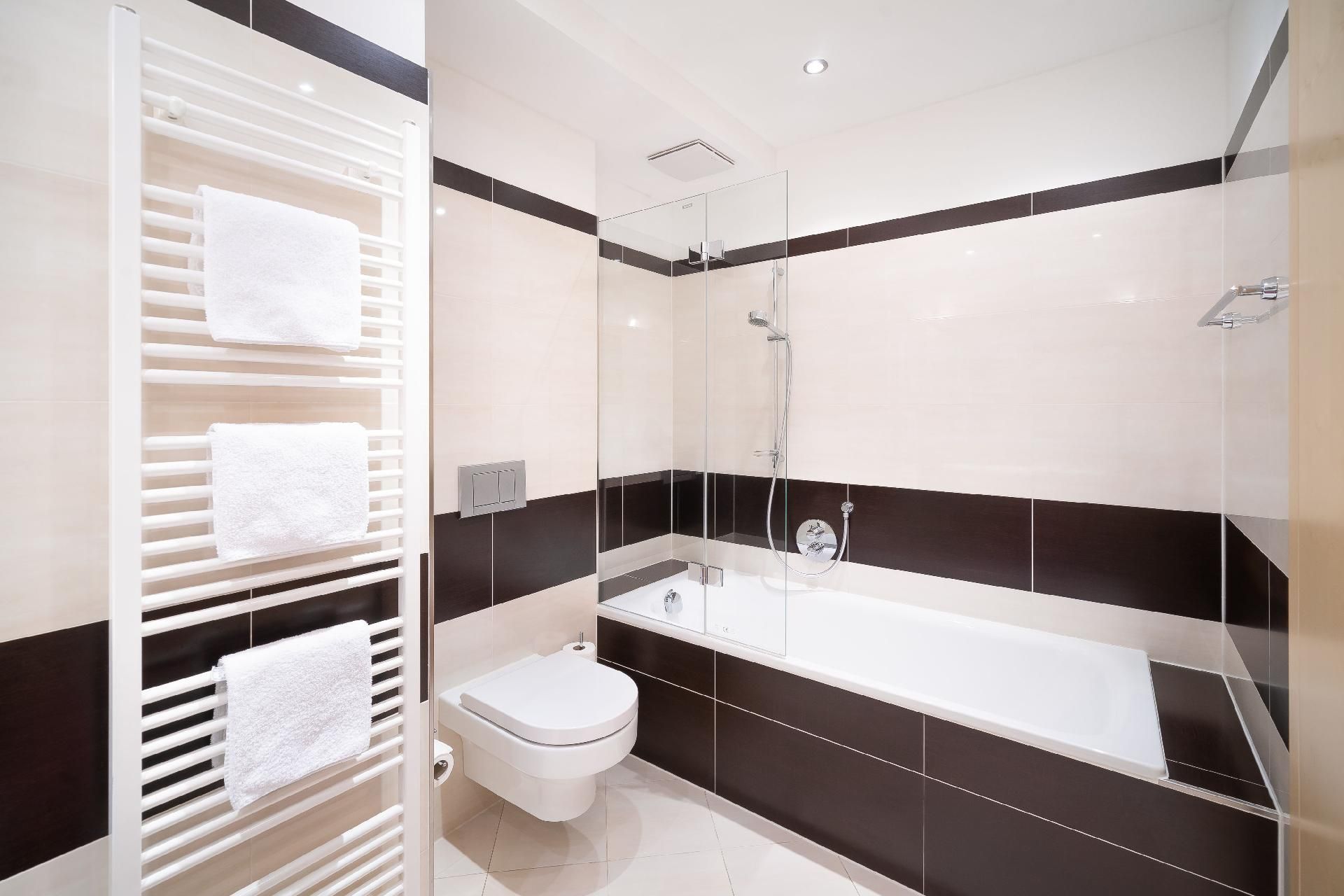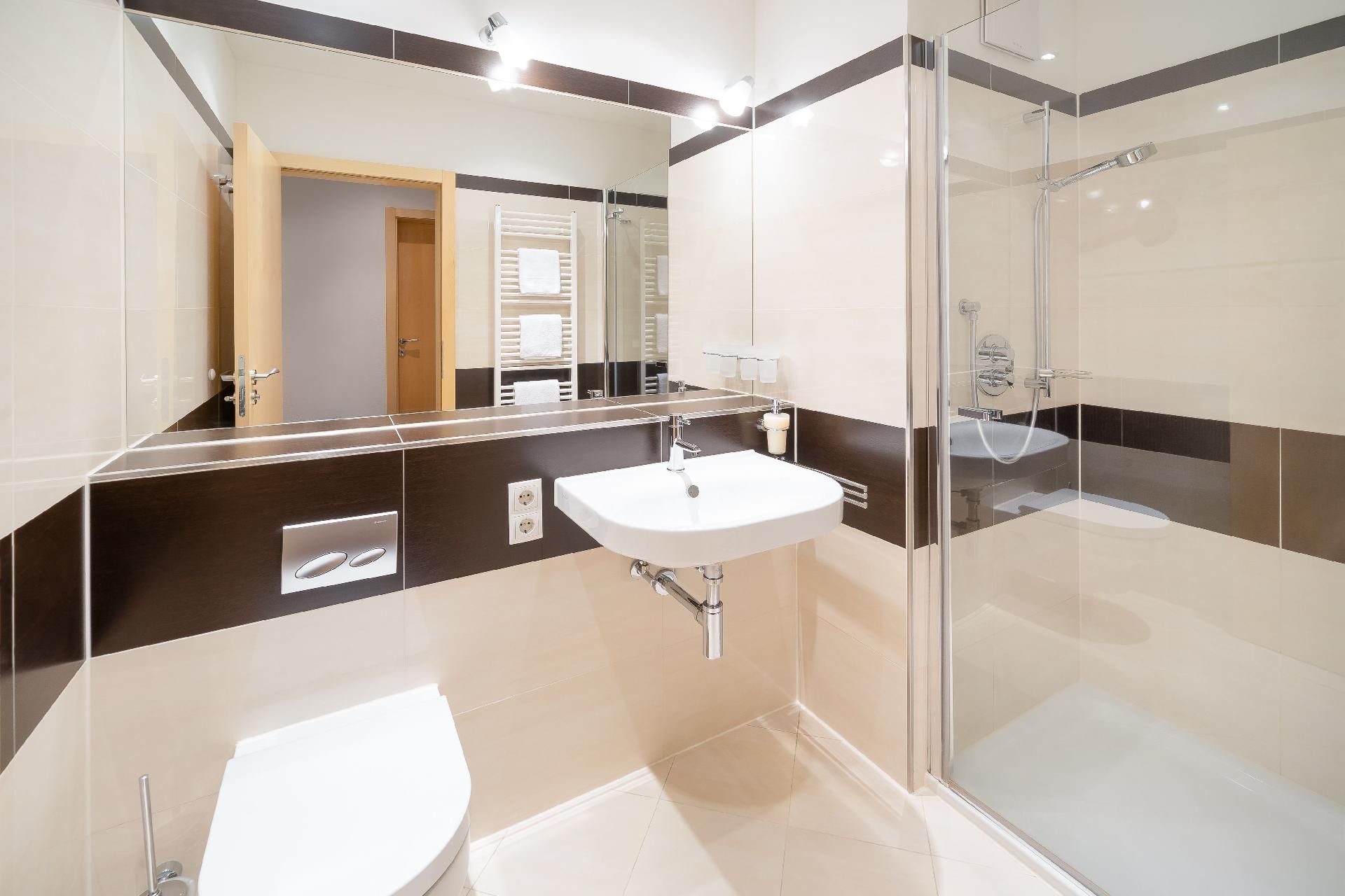 Die Bäder verfügen über Dusche oder Badewanne und größtenteils über Doppelwaschbecken.