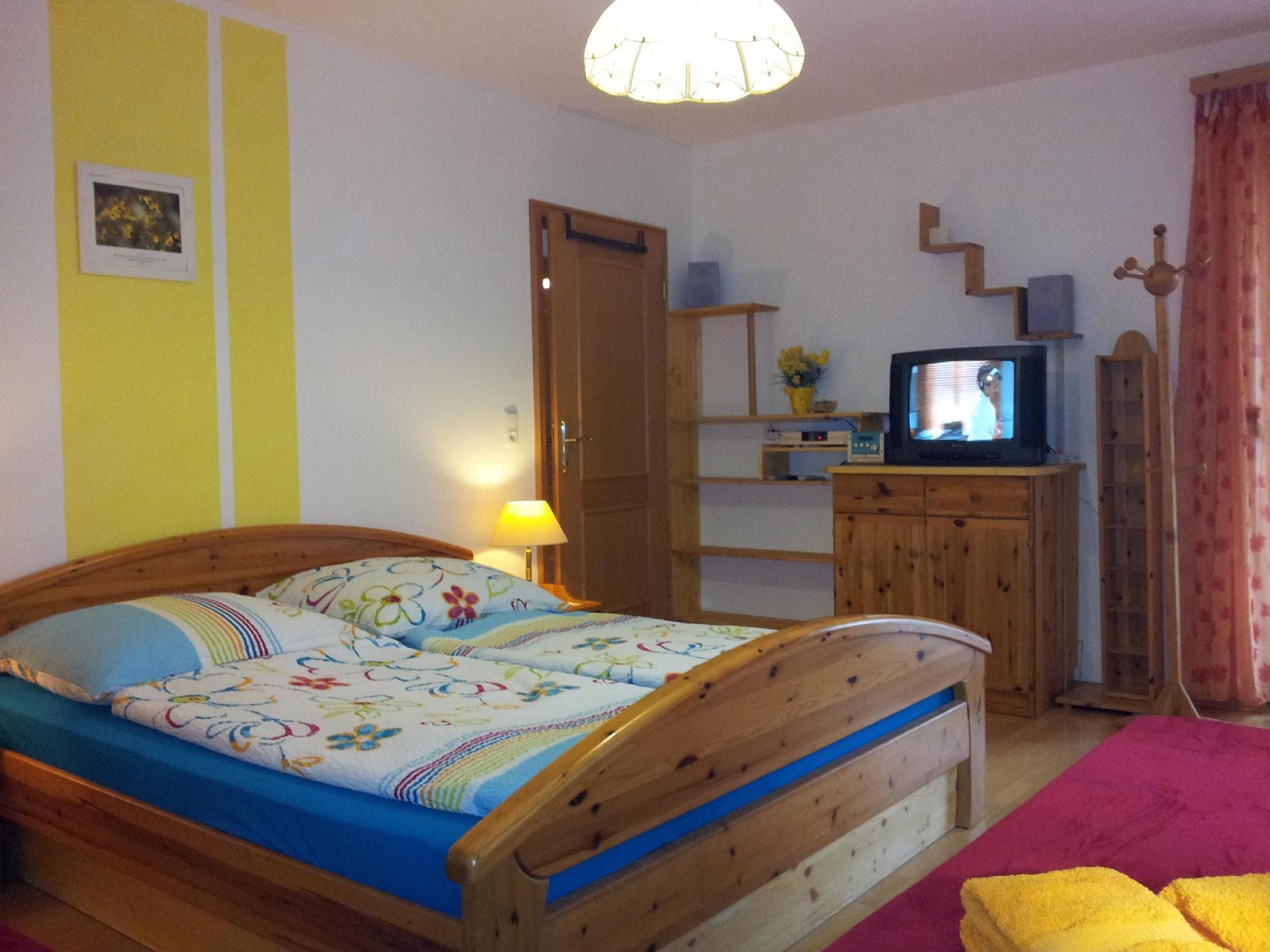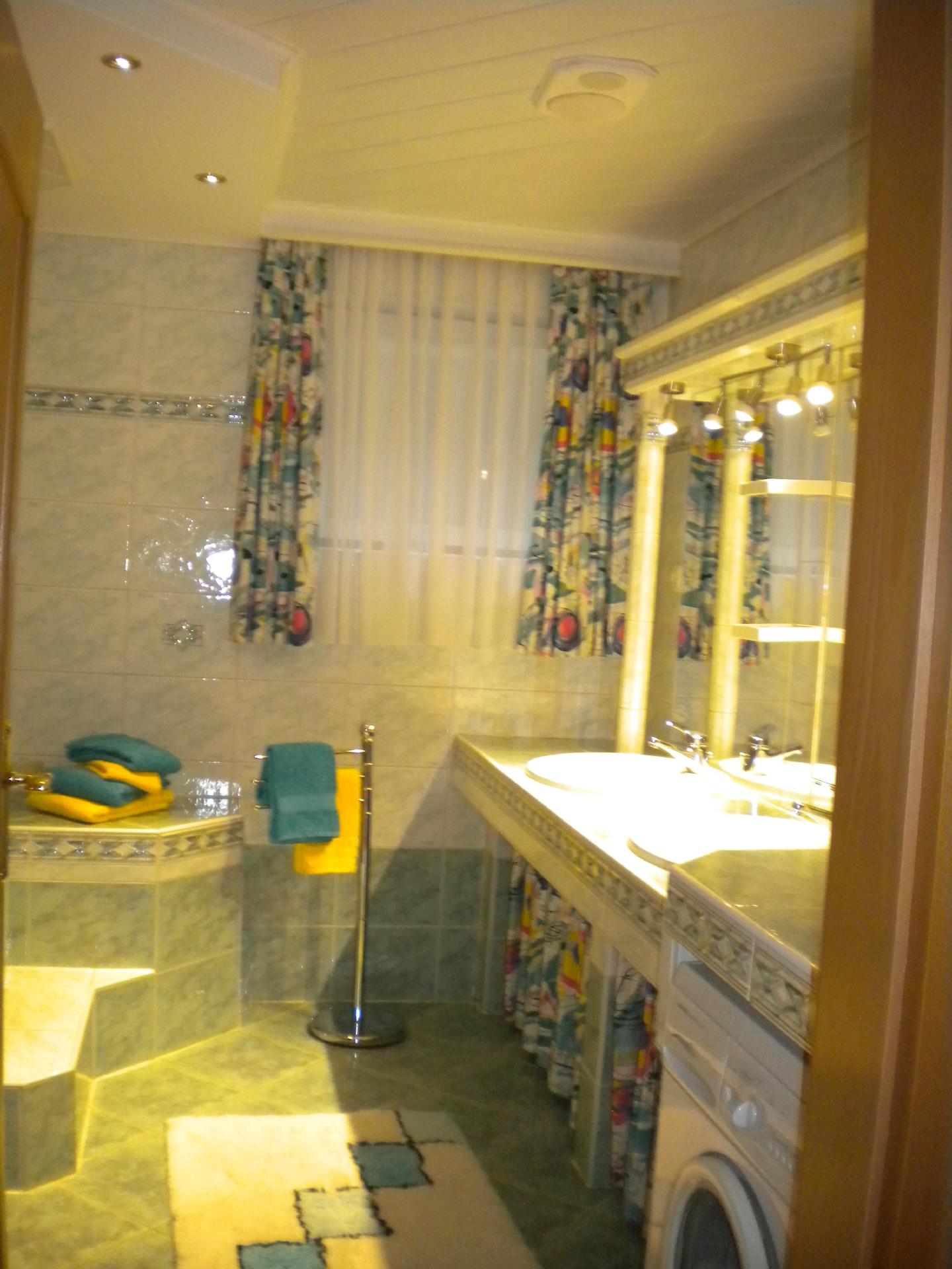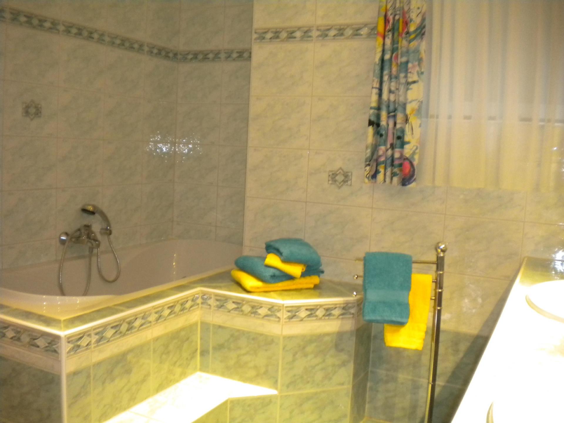 Die komplett eingerichtete Wohnung für bis zu zehn Personen verfügt über einen eigenen Eingang und ist ca. 100m² groß. In der geräumigen Küche finden Sie neben einem Geschirrspüler, Herd, Kaffeemaschine, Toaster auch allen wichtigen Utensilien zum Kochen und Essen vor. Ein gemütlicher Sitzplatz ist ebenfalls vorhanden. Im Wohnzimmer finden Sie neben drei ausziehbaren Doppelcouchen auch eine Wohnwand mit Stereoanlage, TV und SAT, Videorecorder und DVD – Player. Im ersten Schlafzimmer finden Sie ein Doppelbett und zwei Einzelbetten vor. Im zweiten Schlafzimmer sind ebenfalls ein Doppelbett und ein Einzelbett vorhanden. In beiden Schlafzimmern ist jeweils ein TV mit SAT vorhanden. Im großen Bad befinden sich Doppelwaschbecken, Badewanne, extra Dusche, Bidet und eine Waschmaschine. Ein separates WC befindet sich ebenfalls in der Wohnung. Weiterhin verfügt die Ferienwohnung über Fußbodenheizung und Rollläden. In den Wohn- und Schlafräumen ist Parkettboden vorhanden.