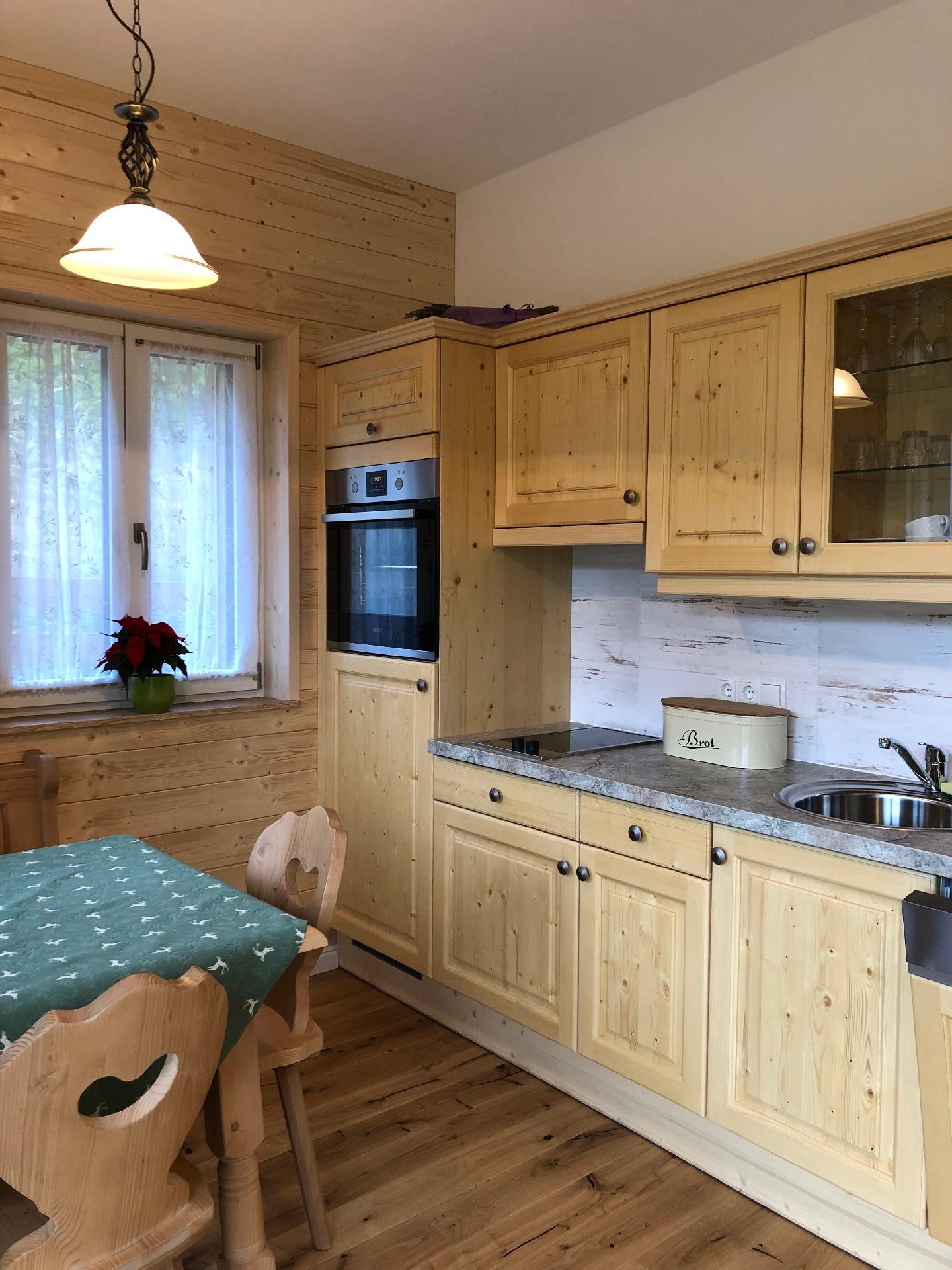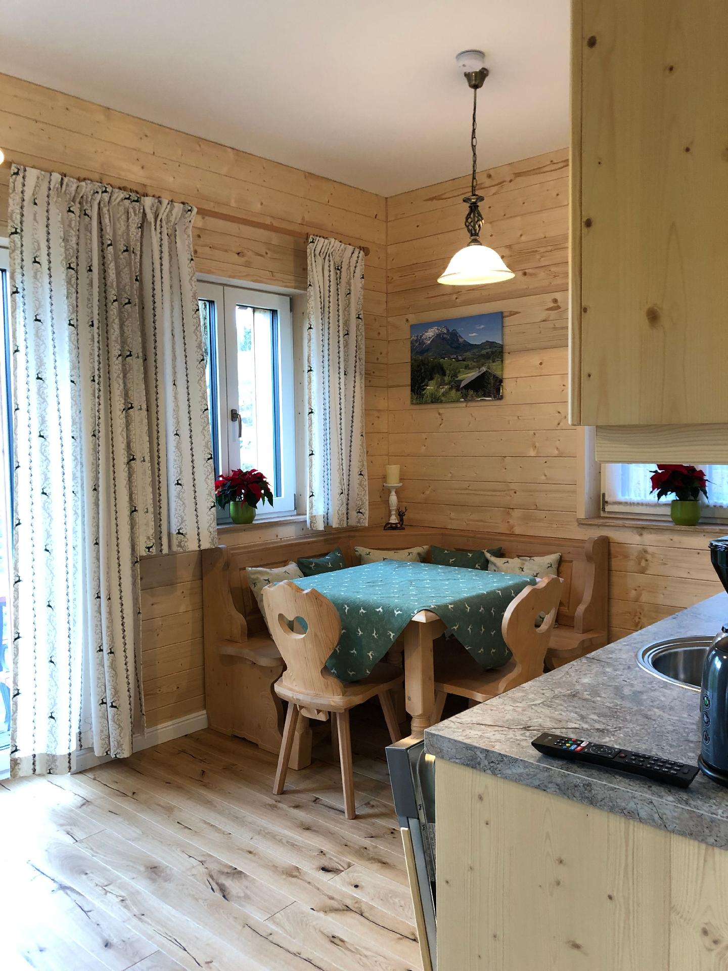 In unserem neuen Appartement-Chalet können Sie zwischen einem Appartement für vier Gäste (Zusatzbett möglich) und zwei Appartements für jeweils zwei Gäste (Zusatzbett möglich) mit gehobener alpenlandtypischer Ausstattung wählen, die einmal für vier Gäste (mit Kinderreisebett 120 cm nach Wunsch) und zwei Mal für zwei Gäste (mit Kinderreisebett 120 cm nach Wunsch) konzipiert wurden. Über die Möglichkeit zusätzliche Gäste unterzubringen informieren wir Sie gern auf Anfrage. Möchten Sie in einer größeren Gruppe anreisen? Es ist kein Problem: Durch das Öffnen einer doppelten Verbindungstür können im Handumdrehen zwei Appartements in eine Wohneinheit umgestaltet werden, die wiederum durch ein gemeinsames Treppenhaus mit dem Appartement im Obergeschoss in Verbindung stehen kann. Ein Carport mit drei Stehplätzen befindet sich direkt am Chalet. Zu jedem der Appartements gehört ein Balkon oder eine Terrasse mit Sitzbank, wo Sie die lang ersehnte Ruhe und Zweisamkeit bei einem atemberaubenden Panoramablick finden können. Je nachdem, ob Sie sich für ein Appartement für zwei, oder für vier Gäste entschieden haben, können Sie sich in zwei, bzw. ein Schlafzimmer zurückziehen. Diese sind mit einem Doppelbett 180x200 cm ohne Fußteil ausgestattet. Für Ihr angenehmes Bettgefühl sorgen hochqualitative mittelharte Matratzen und feinste österreichische Bettwäsche. Falls es Ihrem Wunsch entspricht, können Sie auch im Schlafzimmer die ganze Palette des Kabel-TV genießen. Die Küchenecke mit einem Kühlschrank und Gefrierfach, Herd und Backofen, Wasserkocher, Kaffeemaschine, einer Auswahl aus Töpfen, Pfannen, Wein- und Wassergläsern, sowie Porzellangeschirr im Landhausstil ermöglicht Ihnen eine optimale Selbstversorgung auch über längere Zeiträume. Eine bequeme Eckbank lädt zum stundenlangen Zusammensitzen ein und ein wunderschöner Miniaturkachelofen sorgt zusätzlich zur Fußbodenheizung im Winter für eine wohlige Wärme. Eine bequeme Couch und ein moderner Flachbildfernseher ergänzen diesen Bereich harmonisch und laden ein die Zeit zusammen zu verbringen. Das Bad verwöhnt Sie mit einer geräumigen Duschkabine und einem doppelten, bzw. einzelnem Waschbecken. Es ist mit Haartrockner und WC ausgestattet. In dem Appartement für vier Personen werden Sie eine zweite separate Toilette vorfinden. Wir haben für Sie jeweils ein Handtuch und ein Badetuch, sowie Duschgel, Haarshampoo und Bodylotion für den ersten Bedarf bereitgestellt. Aus der Wohnküche gelangen Sie, je nach Wohneinheit auf eine eigene Terrasse, bzw. auf einen Balkon mit einem atemberaubenden Blick auf die Berge, die für Sie mit gemütlichen Sitzgelegenheiten ausgestattet sind.