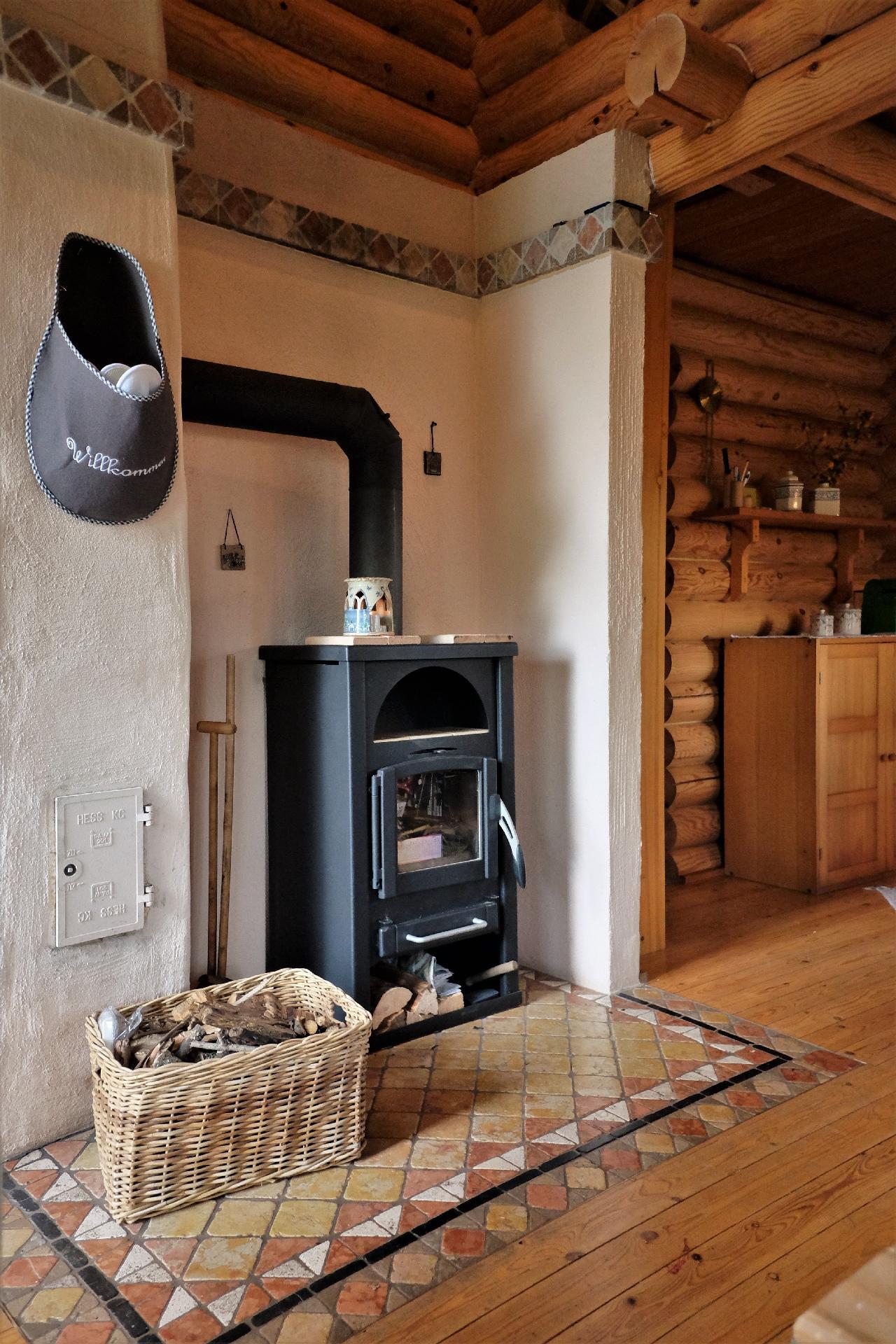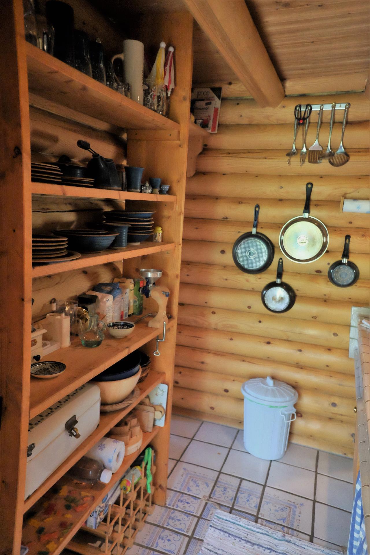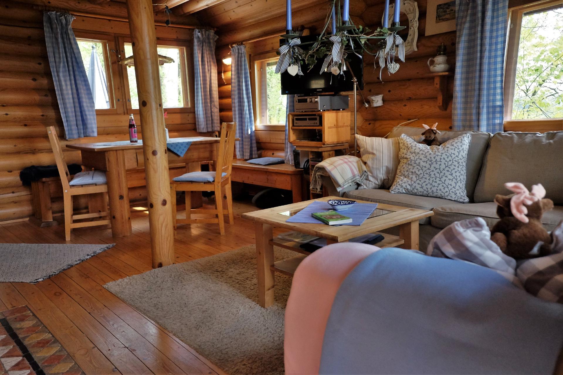 Das Häuschen hat ein sehr heimeliges Wohnzimmer mit Sofa (neu), Sitzecke und Kaminofen, neuer LHD-Fernseher, Radio, Telefon, CD-Player, DVD-Player und Internetanschluß sind vorhanden, können aber auf Bedarf abgeschaltet bzw. entfernt werden. Über eine Sprossenleiter ist der Parvi zu erreichen. Dort befindet sich ein Schlafplatz mit einer neuen Matratze für zwei Personen unter dem Dach des Häuschens. Vom Wohnzimmer aus gelangt man zu einem kleinen Schlafzimmer mit Etagenbetten für zwei Personen und Schreibtisch: alles aus Holz. Ein Durchgang verbindet das Wohnzimmer an einem anderen Ende mit dem Küchenteil. Bis auf eine Spülmaschine und Backofen ist die Küche voll ausgestattet. Sie bietet Raum und Werkzeug für gelungene und idyllische Koch- und Grillabende. Von hier aus begeht man auch das Badezimmer mit Dusche, WC und Waschbecken. Die Dusche ist - wie auch das Häuschen selbst-nach finnischer Art: Es gibt keine Duschwanne, wie sie bei uns Standard ist: Das Wasser fällt direkt auf den Badezimmerboden, was uns zuerst ungewöhnlich erscheint. Aus eigener Erfahrung können wir aber berichten, dass man sich sehr schnell daran gewöhnt. Das Badezimmer selbst bietet dann die Tür zum gemütlichen Sitzplatz hinter der Hütte. Der Blick auf den alten Urwald kann die Hektik des Alltags schnell relativieren.