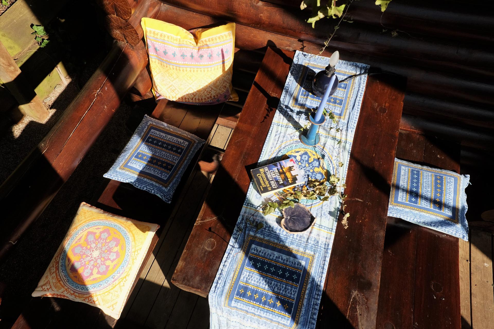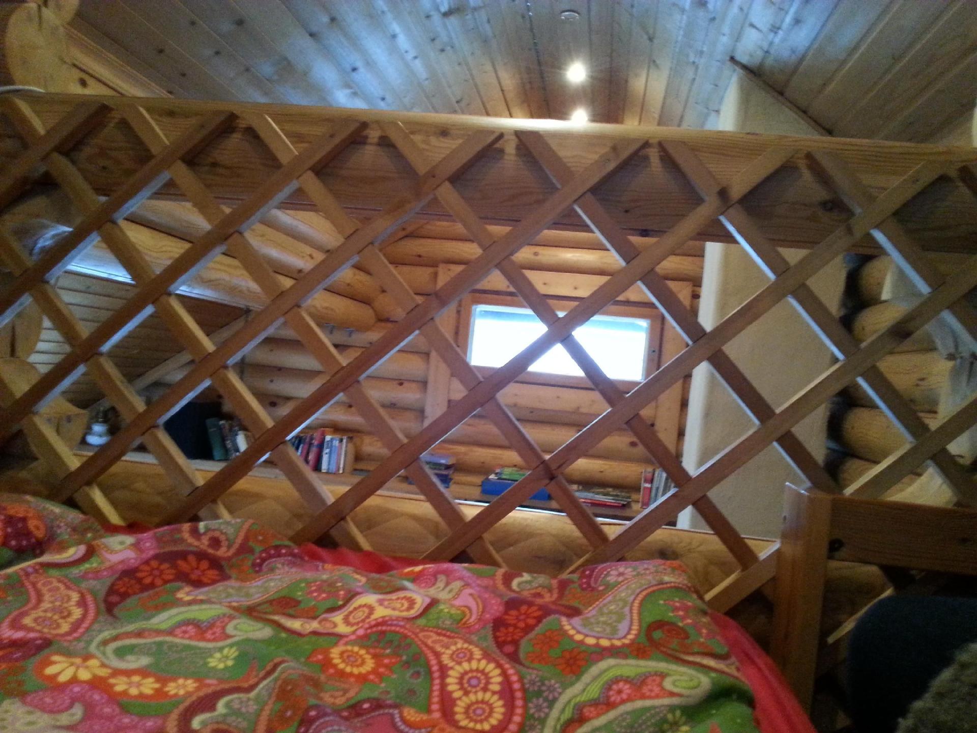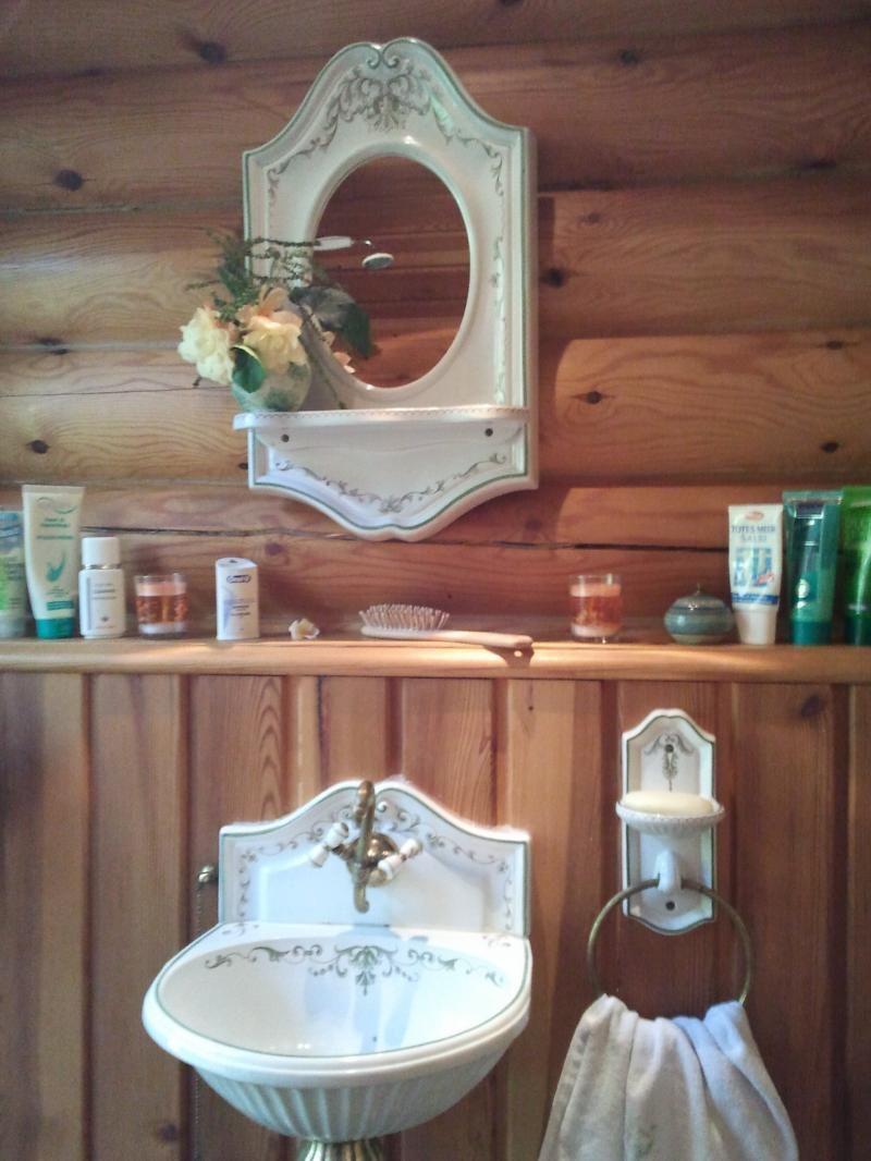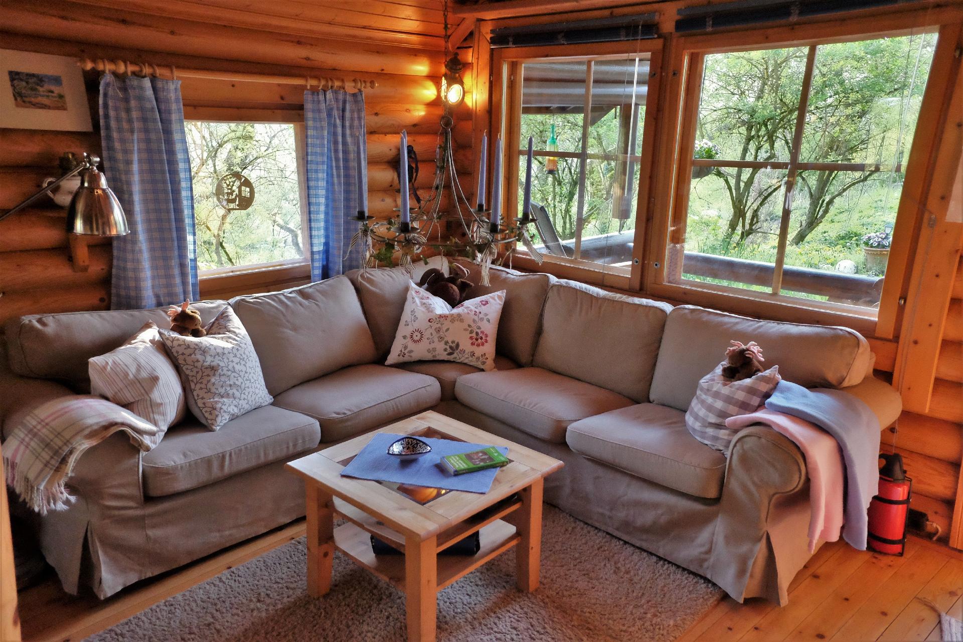 Das Häuschen hat ein sehr heimeliges Wohnzimmer mit Sofa (neu), Sitzecke und Kaminofen, neuer LHD-Fernseher, Radio, Telefon, CD-Player, DVD-Player und Internetanschluß sind vorhanden, können aber auf Bedarf abgeschaltet bzw. entfernt werden. Über eine Sprossenleiter ist der Parvi zu erreichen. Dort befindet sich ein Schlafplatz mit einer neuen Matratze für zwei Personen unter dem Dach des Häuschens. Vom Wohnzimmer aus gelangt man zu einem kleinen Schlafzimmer mit Etagenbetten für zwei Personen und Schreibtisch: alles aus Holz. Ein Durchgang verbindet das Wohnzimmer an einem anderen Ende mit dem Küchenteil. Bis auf eine Spülmaschine und Backofen ist die Küche voll ausgestattet. Sie bietet Raum und Werkzeug für gelungene und idyllische Koch- und Grillabende. Von hier aus begeht man auch das Badezimmer mit Dusche, WC und Waschbecken. Die Dusche ist - wie auch das Häuschen selbst-nach finnischer Art: Es gibt keine Duschwanne, wie sie bei uns Standard ist: Das Wasser fällt direkt auf den Badezimmerboden, was uns zuerst ungewöhnlich erscheint. Aus eigener Erfahrung können wir aber berichten, dass man sich sehr schnell daran gewöhnt. Das Badezimmer selbst bietet dann die Tür zum gemütlichen Sitzplatz hinter der Hütte. Der Blick auf den alten Urwald kann die Hektik des Alltags schnell relativieren.