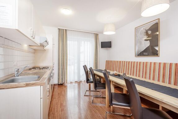 Komfortables Appartement mit 1 Doppelzimmer (getrennte Betten möglich), Flat-TV und Zimmersafe, Badezimmer mit Dusche/WC und Haarföhn. Abgetrennte Wohnküche mit großzügigem Esstisch, voll ausgestattete Küche mit Backofen, Ceranfeld, Spülmaschine, Kapselkaffeemaschine, Wasserkocher, Toaster,.. Größe ca. 40 m².