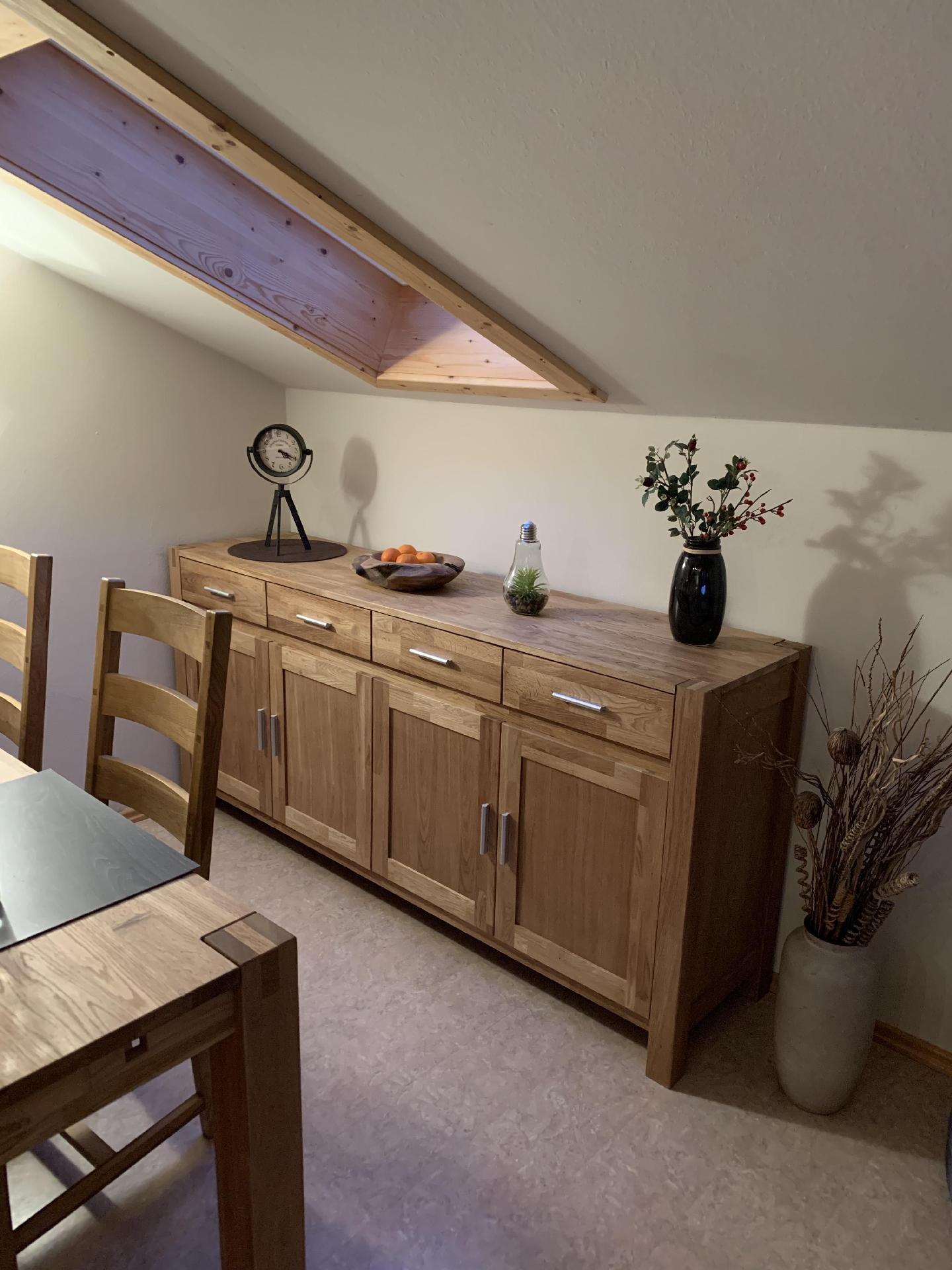 Wir vermieten in einem Feriendorf in herrlicher Südhanglage, eine ca. 50 m² große Dachwohnung Es gibt ein großzügiges Wohn-Esszimmer mit einem 1,60 m großen Bett ,sowie ein Schlafzimmer mit Doppelbett 1,80 m. Außerdem eine moderne Küchenzeile mit Geschirrspüler und E-Herd mit Cerankochfeld.