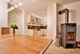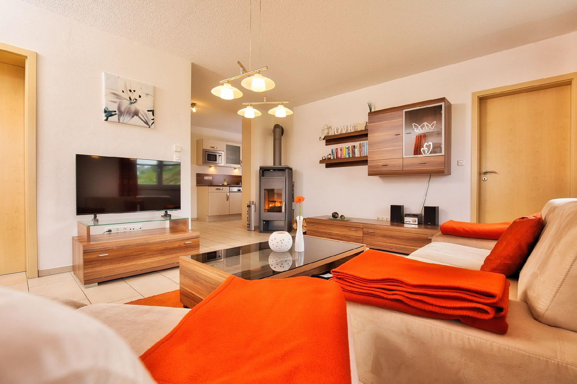 Das Haus ist komplett neu mit hochwertigen und modernen Möbeln liebevoll eingerichtet. Jede Ferienwohnung besitzt einen Abstellraum/Wirtschaftsraum. Die Ferienwohnungen sind barrierefrei eingerichtet. Die Küchen sind komplett ausgestattet, so sind u. a. Spülmaschine, Elektroherd, Mikrowelle, Backofen, Kühlschrank mit Gefrierfach und Dunstabzug vorhanden. Alle Wohnungen haben einen Kaminofen mit Specksteinverkleidung und Glasscheibe für eine romantische Atmosphäre. Das Holz hierfür steht Ihnen kostenlos zur Verfügung. Das Bad hat einen großen Waschtisch, WC und Dusche. Handtücher und Bademäntel werden kostenlos gestellt. Alle Wohnungen sind mit einer Zentralheizung ausgestattet. Alle Betten sind Doppelbetten mit jeweils zwei getrennten Matratzen. Diese haben die Maße 90 cm x 200 cm.